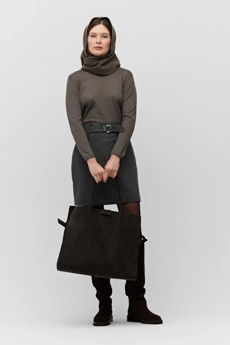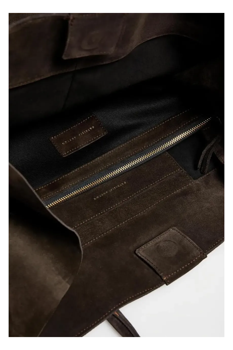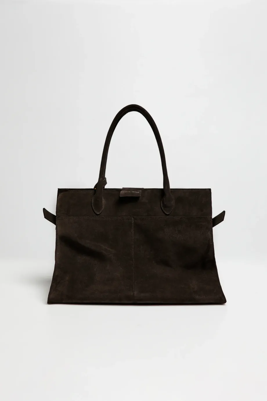 Große braune Tasche aus weichem Veloursleder. Mit robusten Henkeln, einer Innentasche für Dokumente sowie einem abnehmbaren Reißverschluss-Etui. Handgefertigt in einer polnischen Manufaktur.