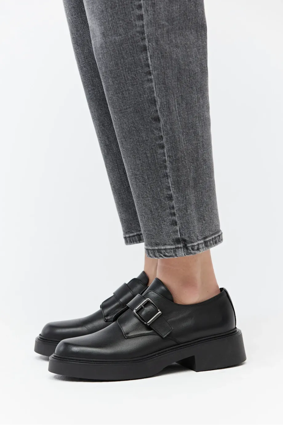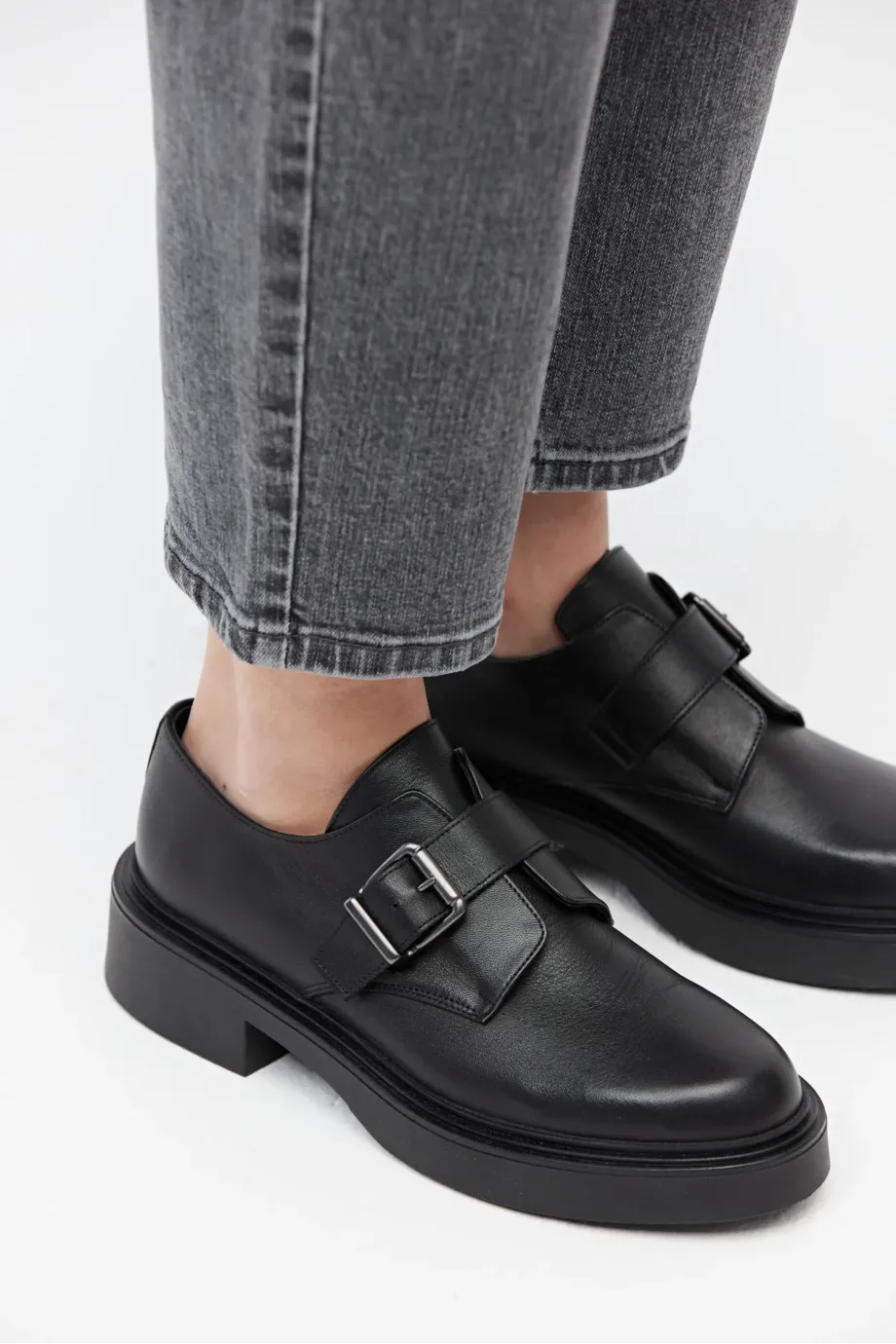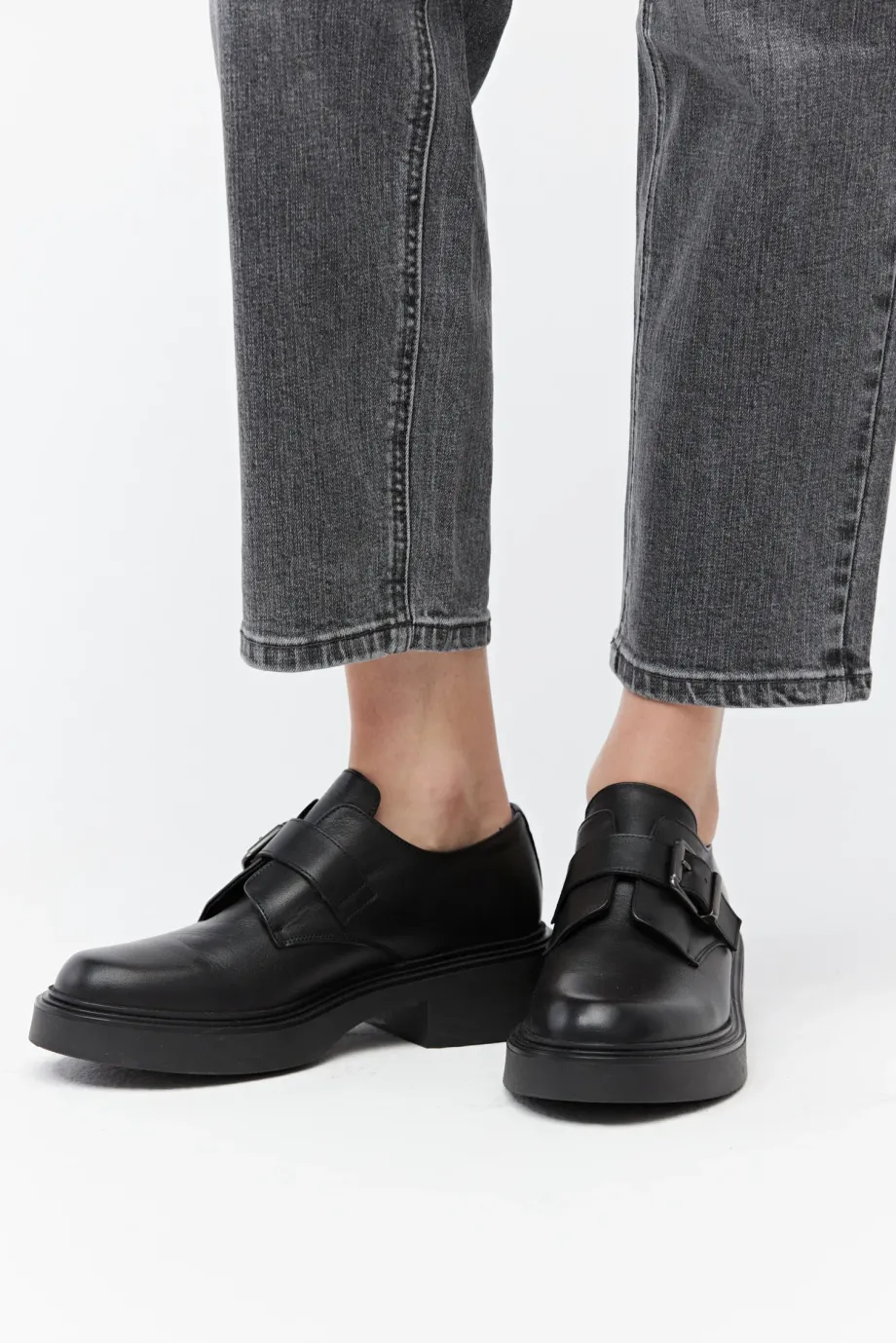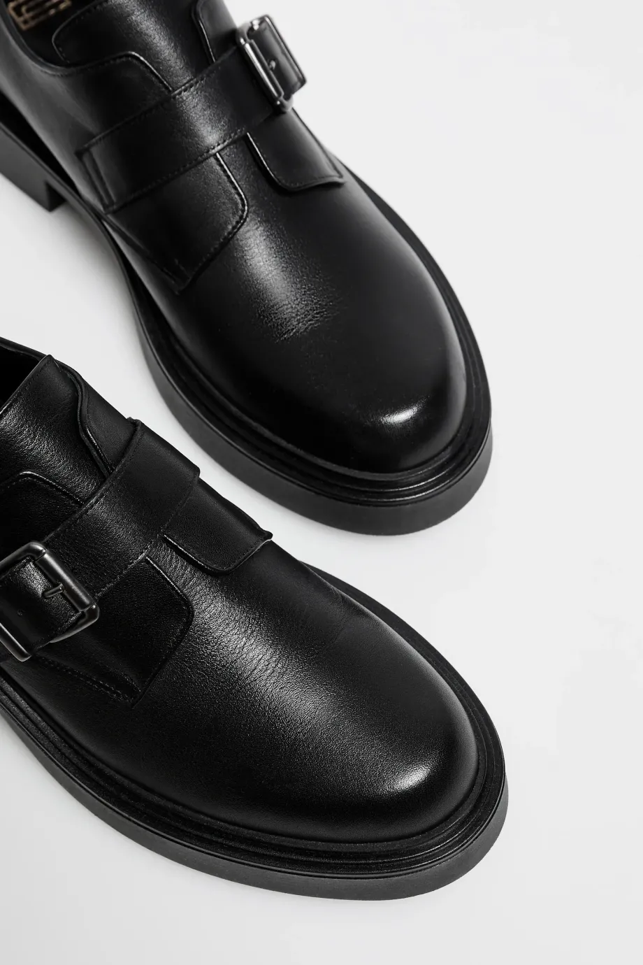 Schwarze Monk-Schuhe aus weichem Ziegenleder, handgenäht in Italien. Klassisches Modell mit Schnalle und runder Kappe auf einer massiven Sohle.