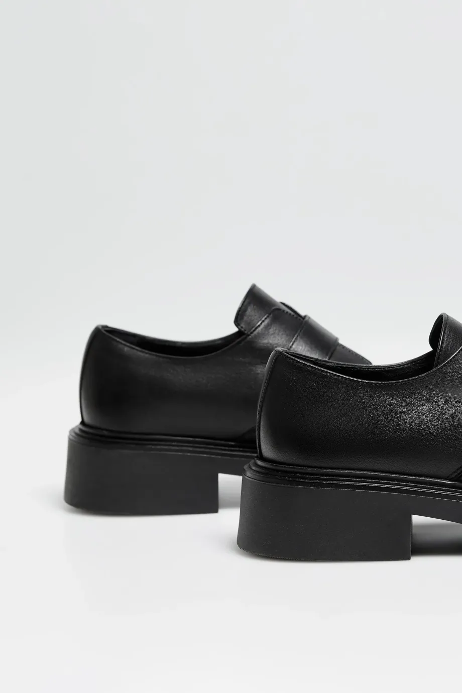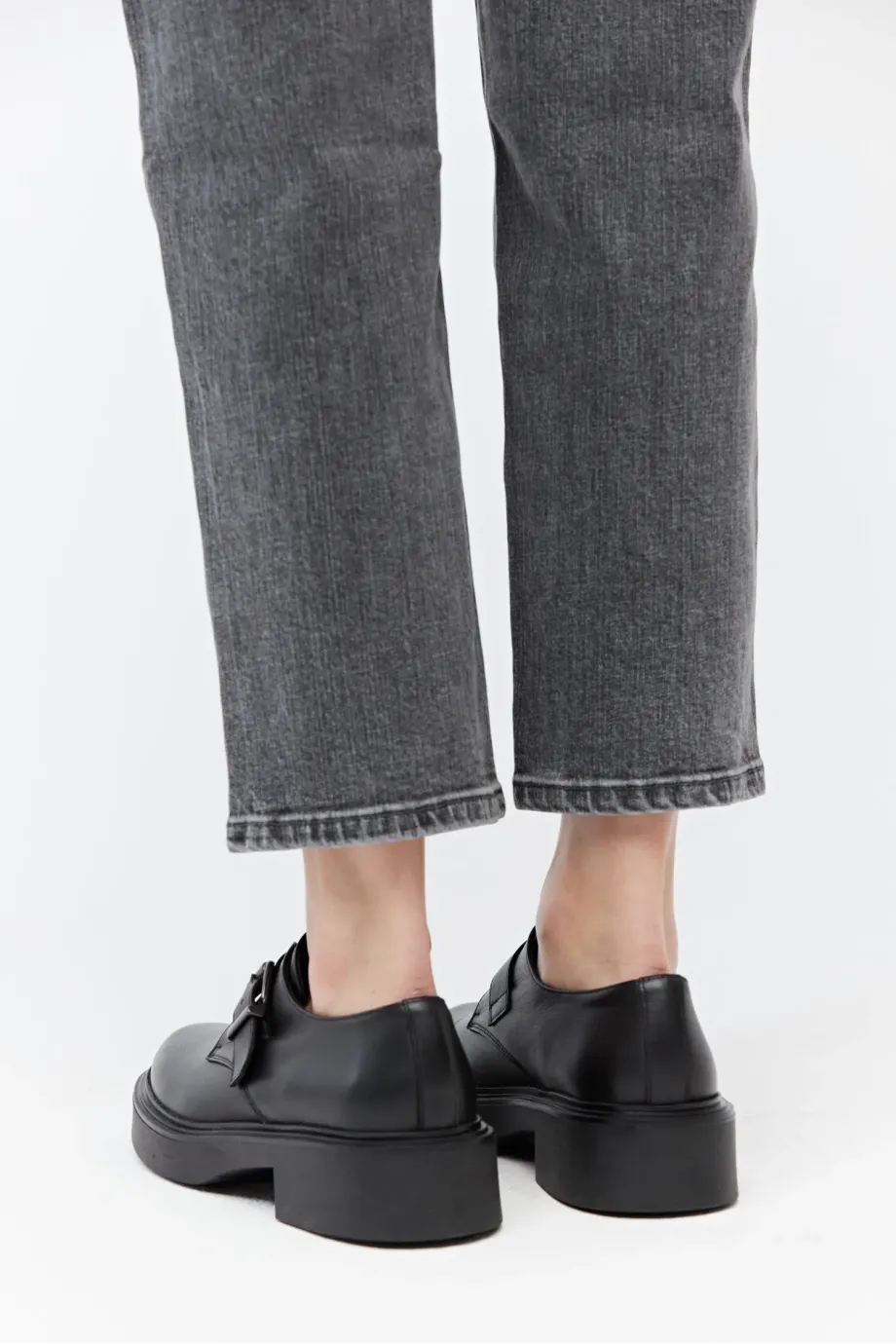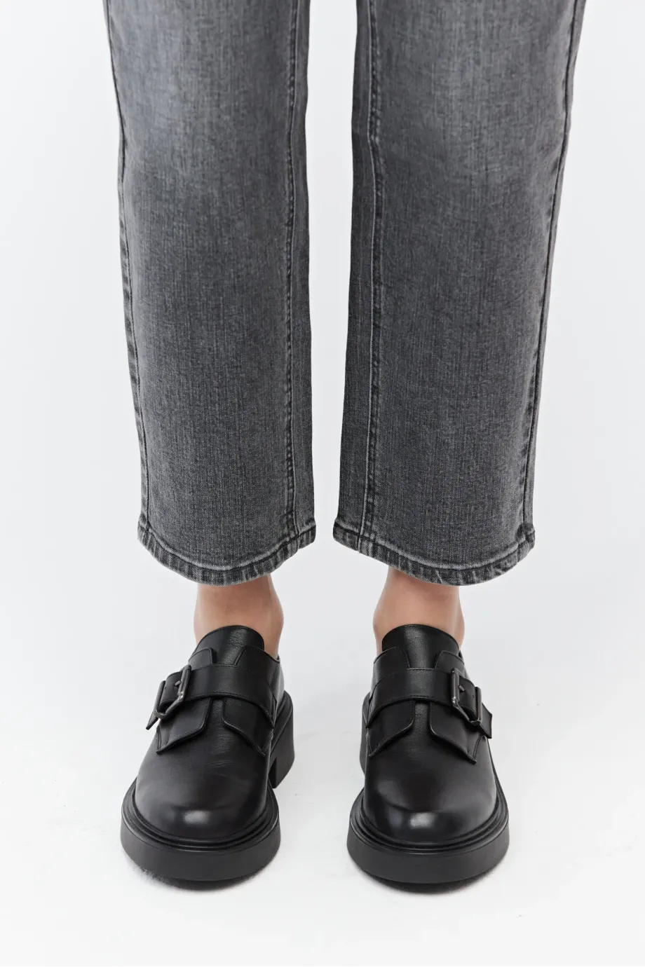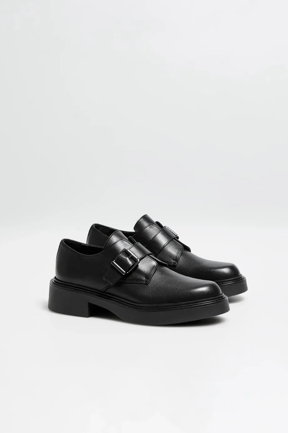 Schwarze Monk-Schuhe aus weichem Ziegenleder, handgenäht in Italien. Klassisches Modell mit Schnalle und runder Kappe auf einer massiven Sohle.