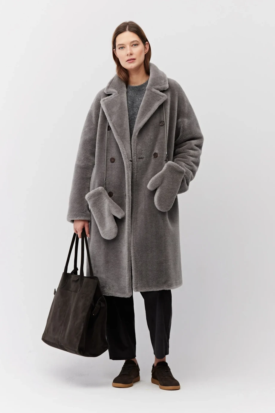 Mantel aus Teddywolle. Kragen, lange Ärmel, Taschen. Lockere Passform, doppelreihig, mit äußeren Knöpfen aus Büffelhorn und innerem Knopf aus Corozo-Nuss. Midi-Länge. Farbe Grau.