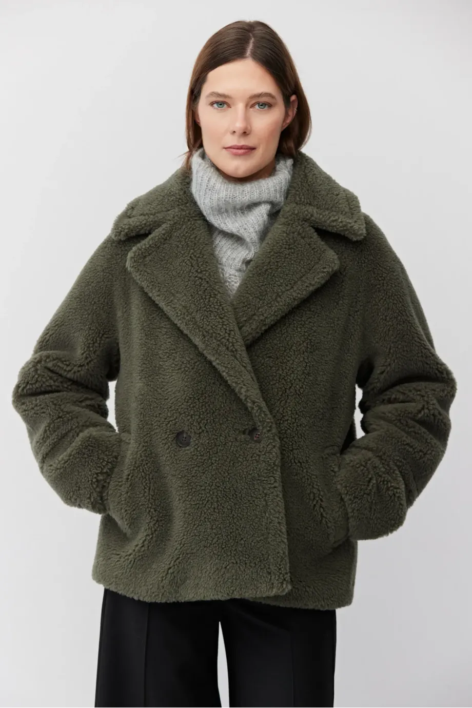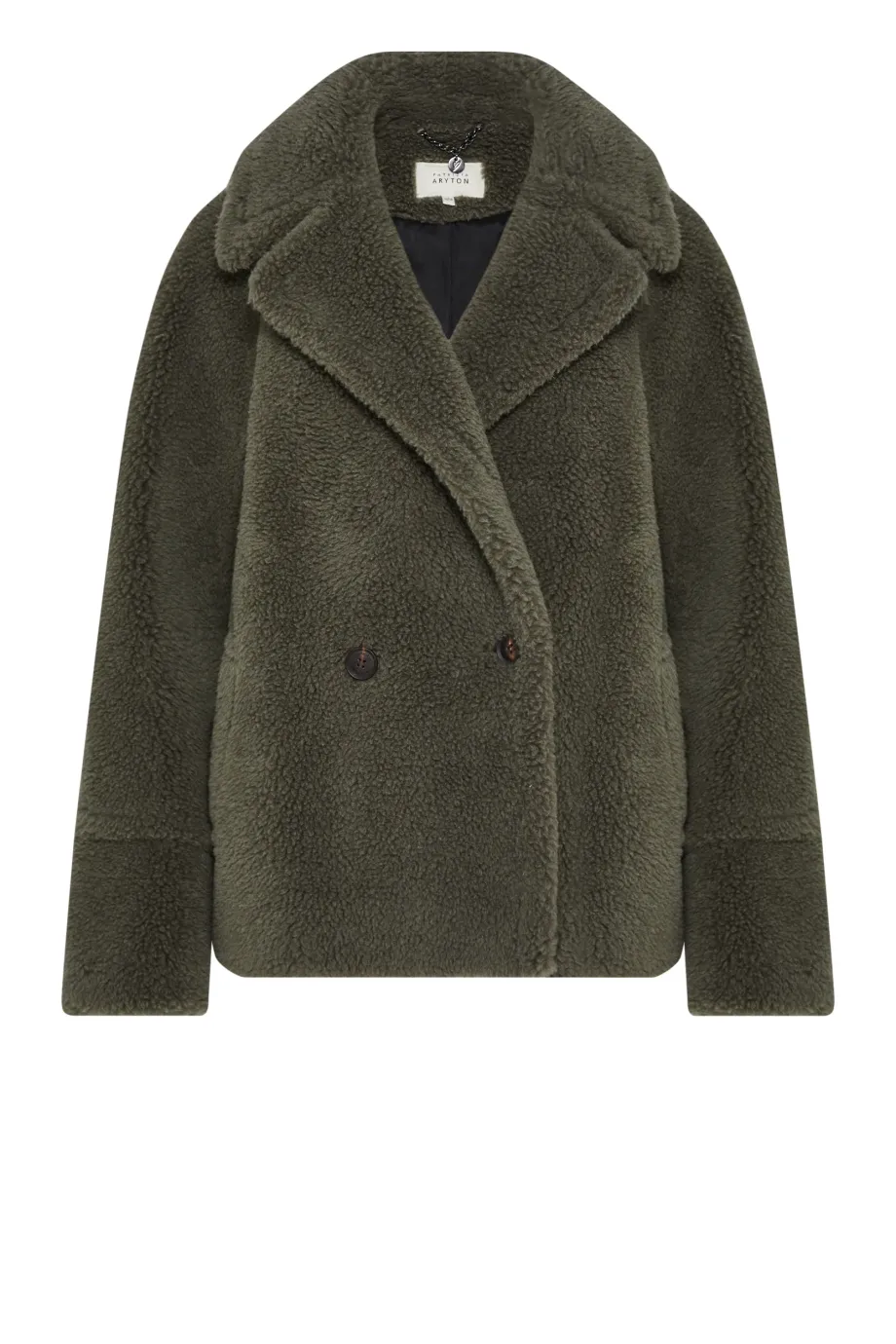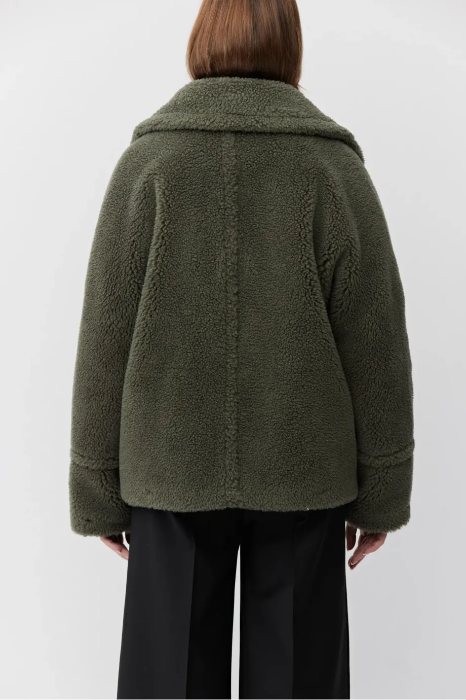 Teddybärjacke mit Kamelhaar. Lockere Passform. Zweireihig, außen mit einem Hornknopf und innen mit einem Nussbaumknopf zu schließen. Lange Ärmel, Kragen, Taschen. Farbe: Dunkelgrün.