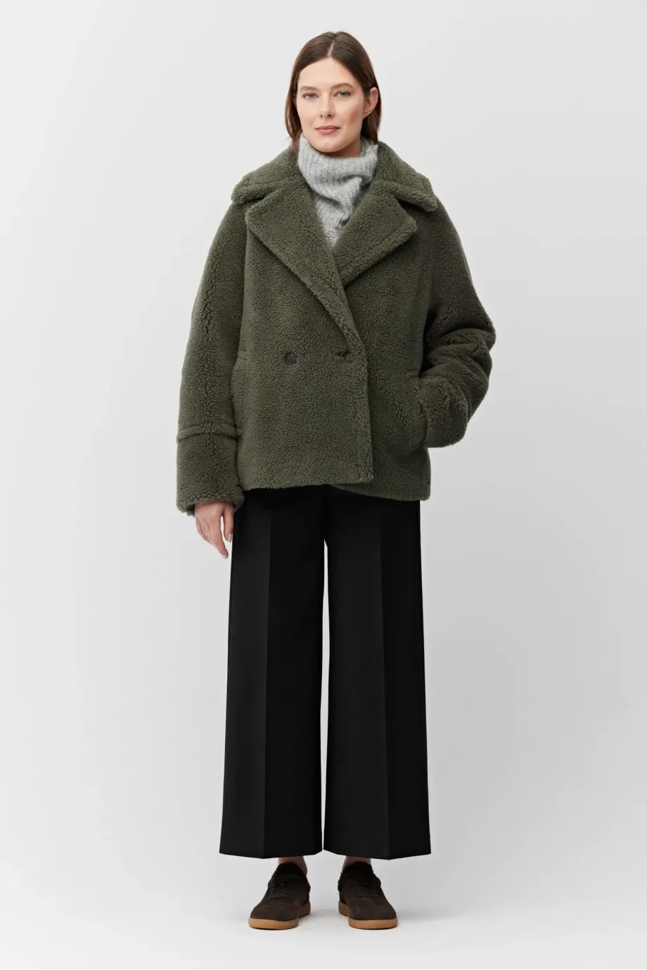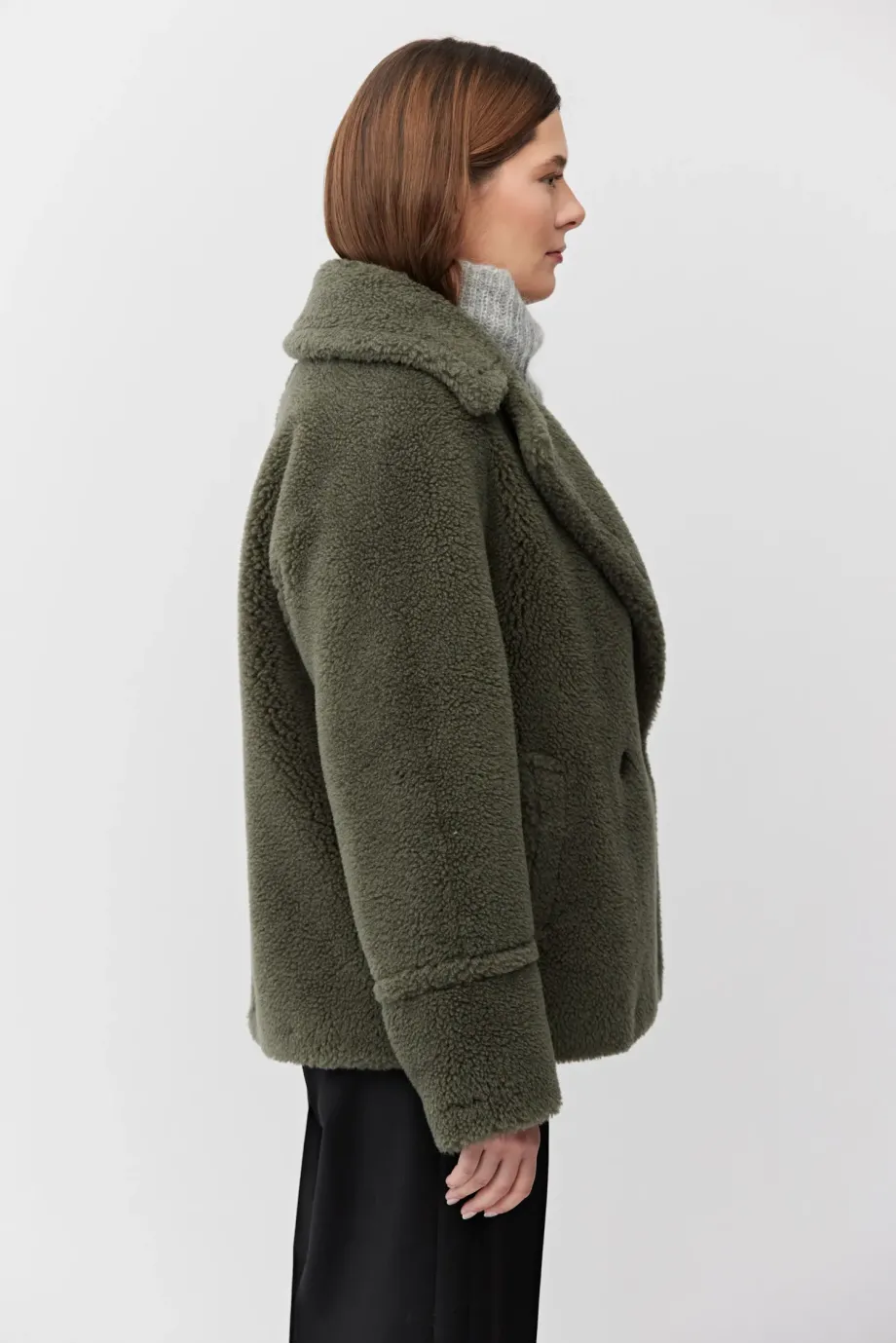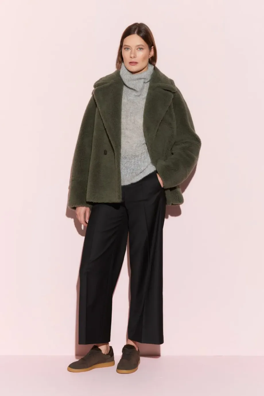 Teddybärjacke mit Kamelhaar. Lockere Passform. Zweireihig, außen mit einem Hornknopf und innen mit einem Nussbaumknopf zu schließen. Lange Ärmel, Kragen, Taschen. Farbe: Dunkelgrün.