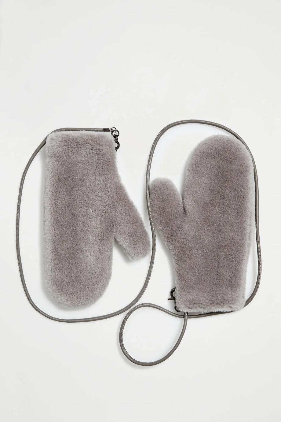 Handschuhe aus Teddywolle. Wollfutter, abnehmbarer Lederriemen. Farbe: Grau.