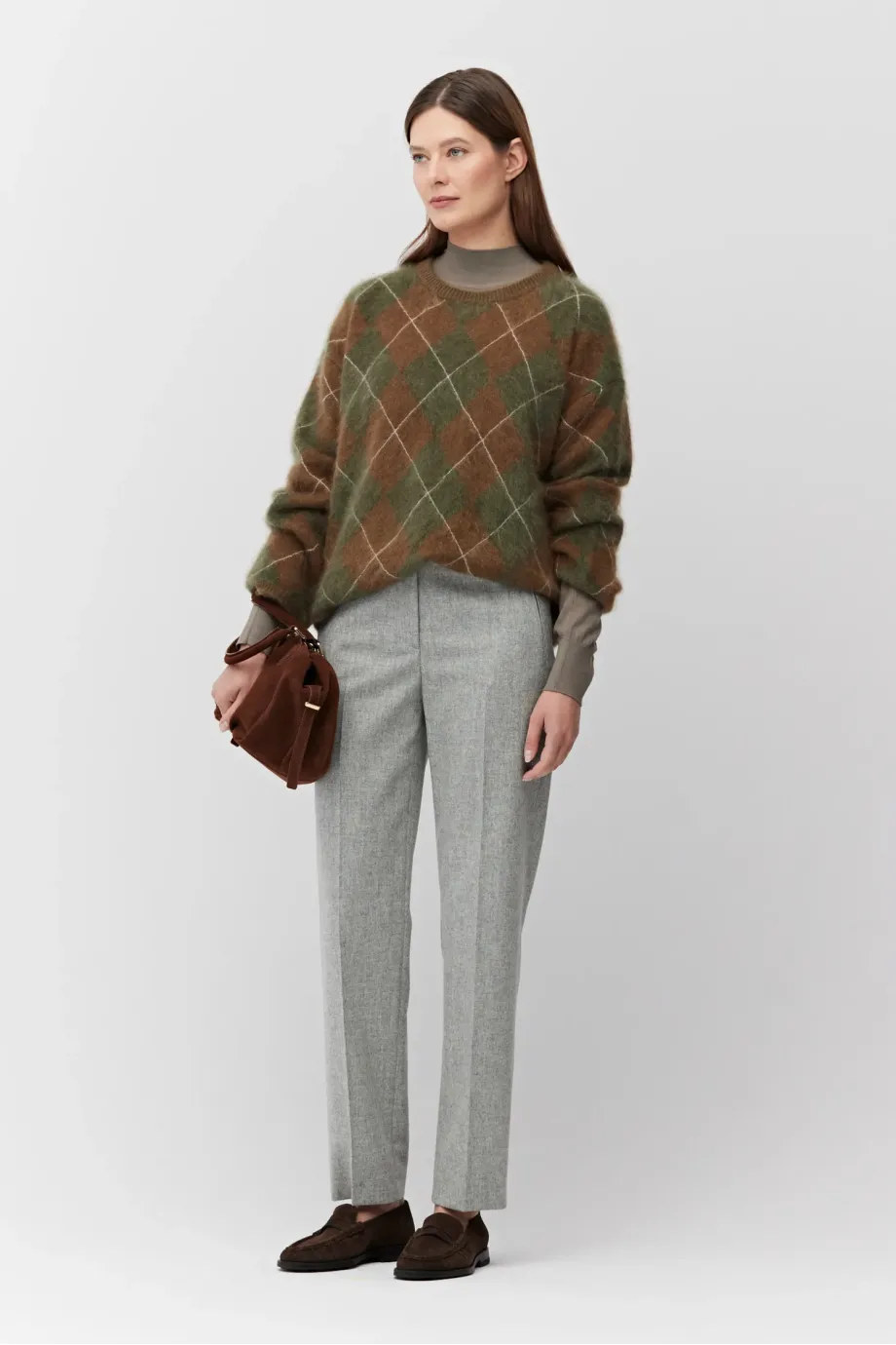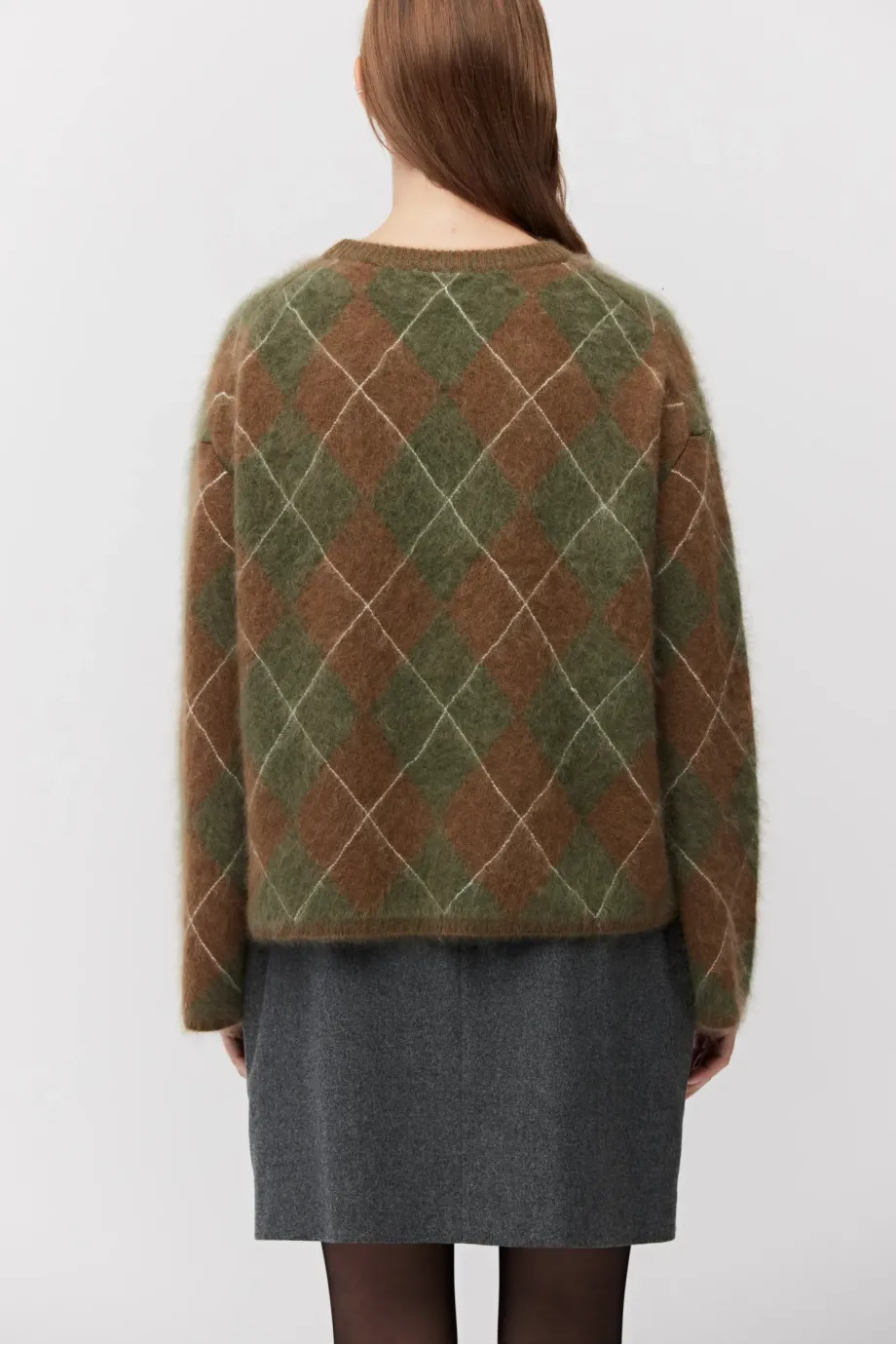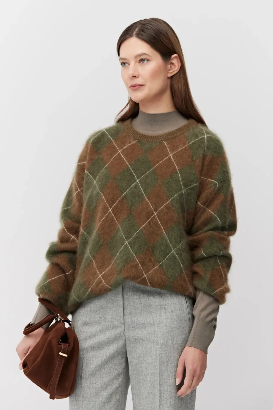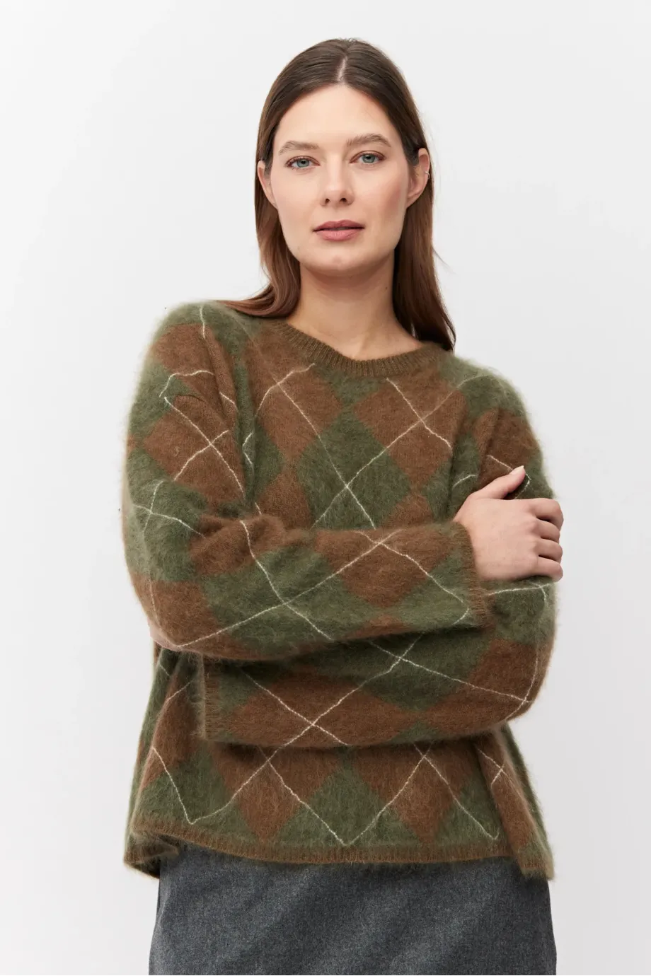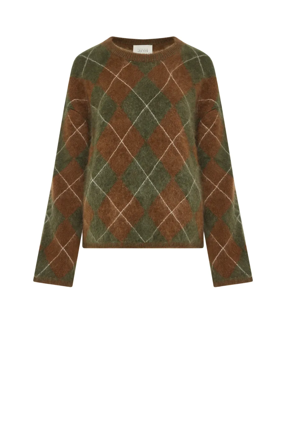 Kaschmirpullover. Braun-grünes Muster. Rundhalsausschnitt, lange, lockere Ärmel. Weicher Strickstoff mit lockerer Inarsia-Maschenstruktur, hergestellt auf einer Maschine mit einer Nadelstärke von 7 GG.