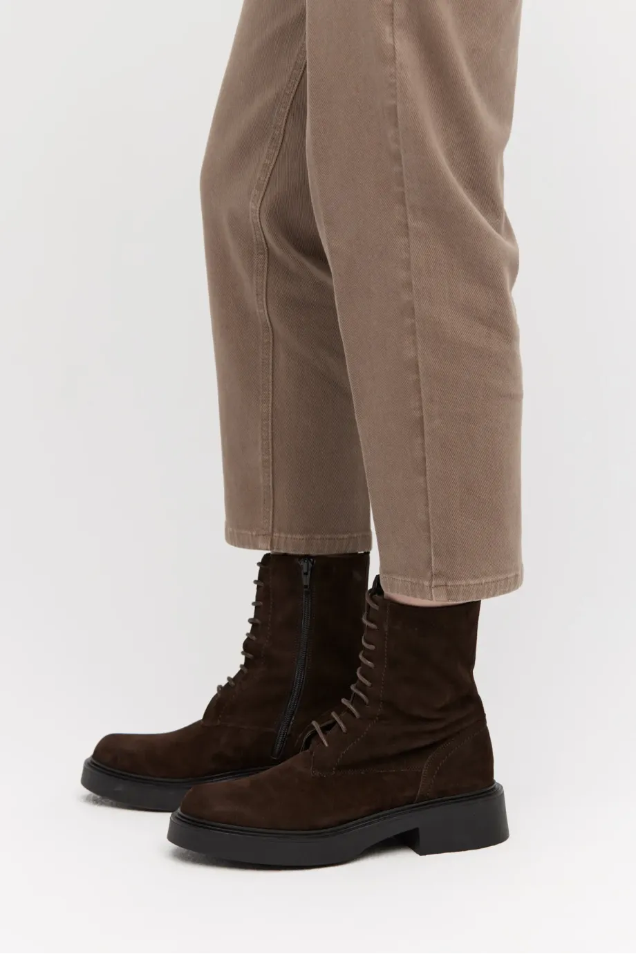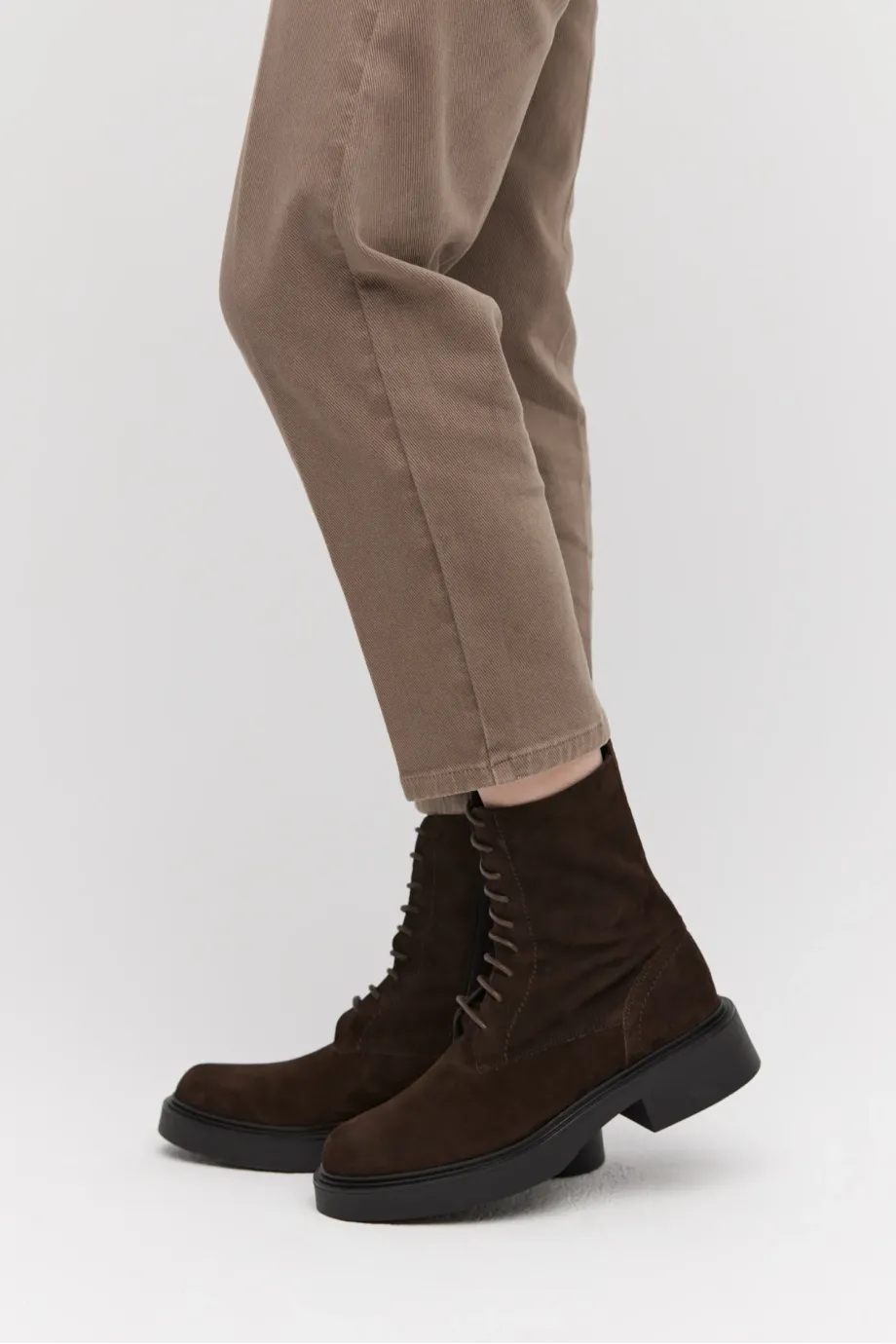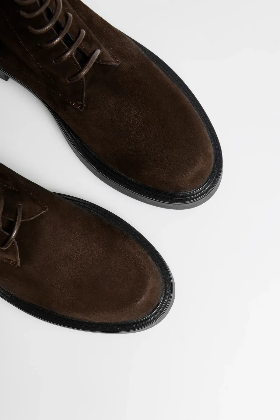 Braune Stiefeletten aus weichem Veloursleder. Zum Schnüren, mit massiver Sohle und runder Spitze. Handgefertigt in einer italienischen Manufaktur.