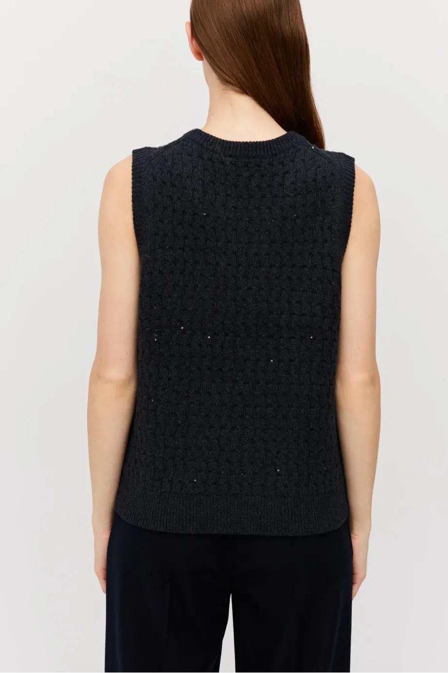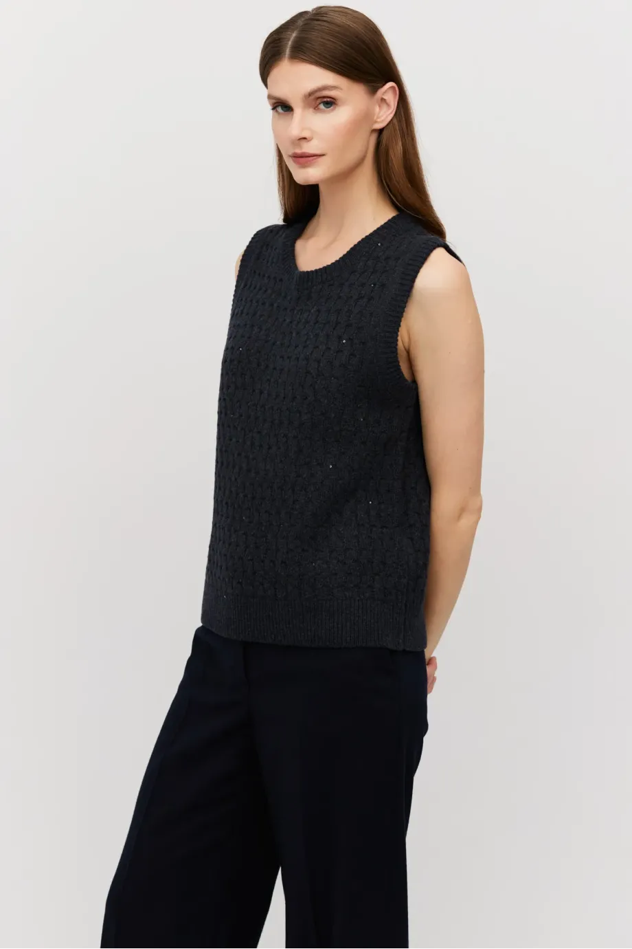 Dunkelblaue Weste aus Merinowolle. Körpernahe Passform mit rundem Ausschnitt. Strick mit feinem Lurex-Faden.