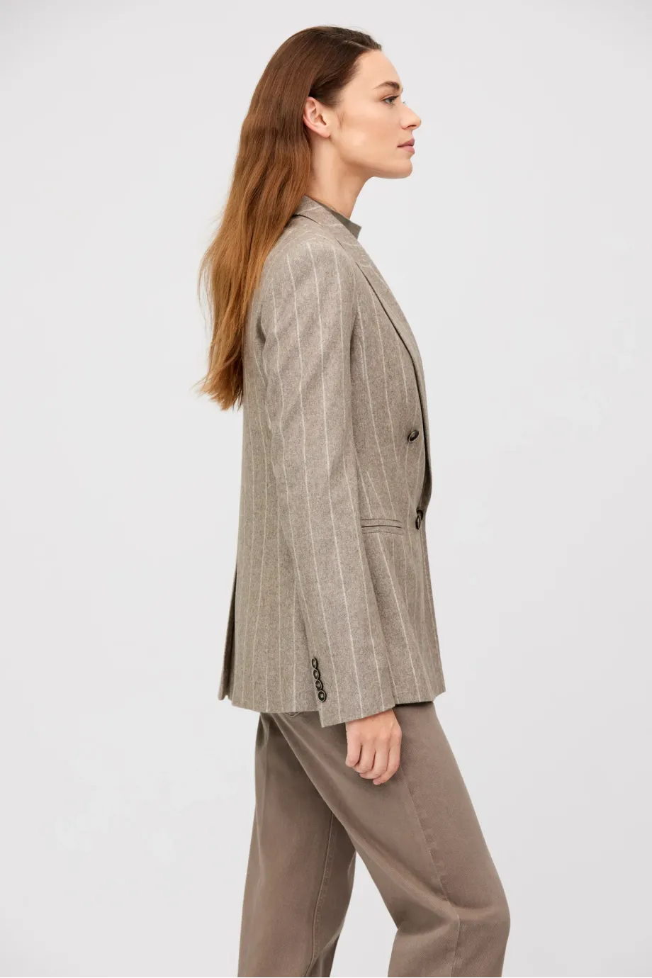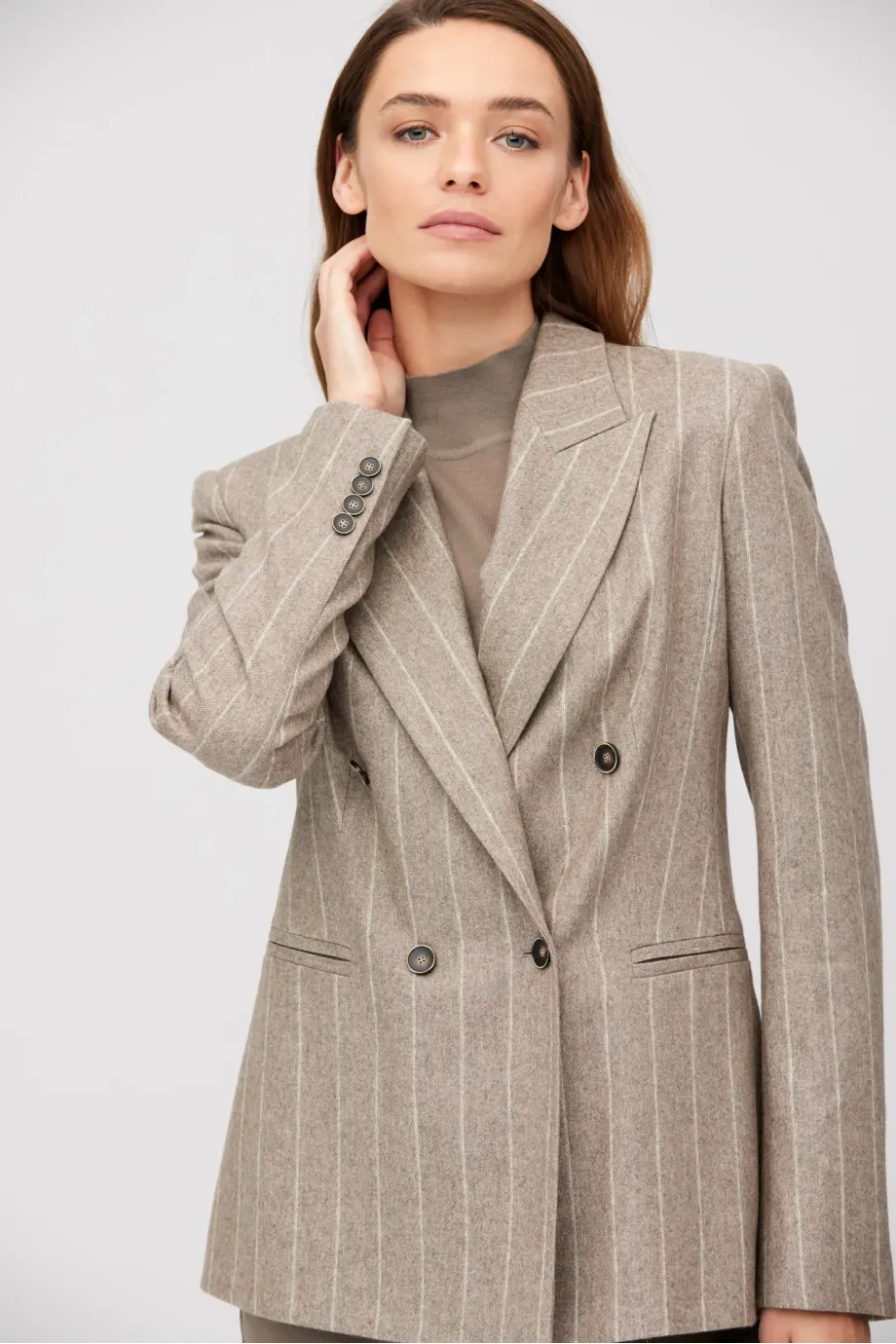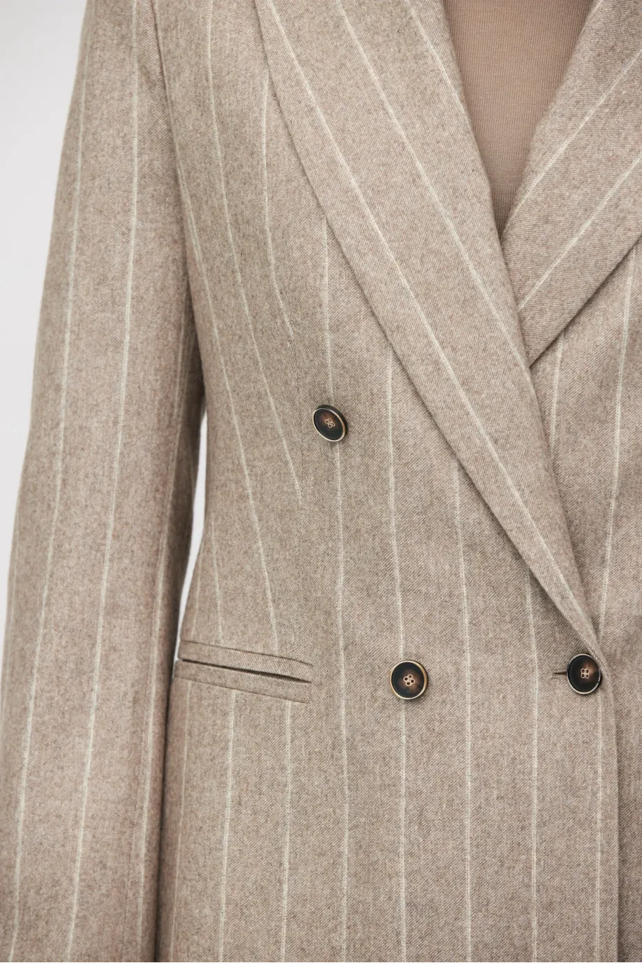 Zweireihiger Streifenblazer mit Kaschmiranteil in Taupe. Leicht taillierter Schnitt, lange Ärmel, Knopfleiste aus Büffelhorn und Innenknopf aus Corozo-Nuss. Taschen. Gefüttertes Modell mit Ziersteppung und Paspelierung von innen.