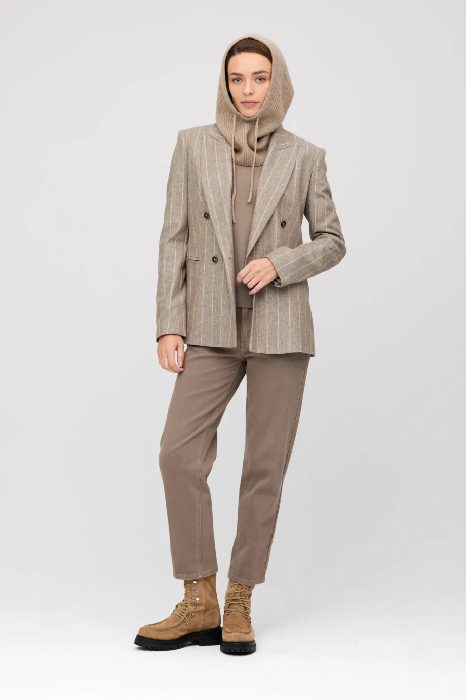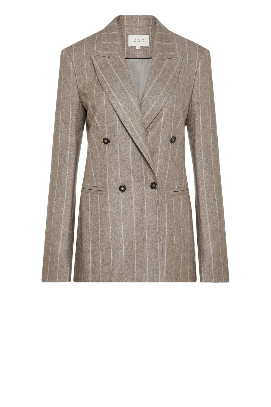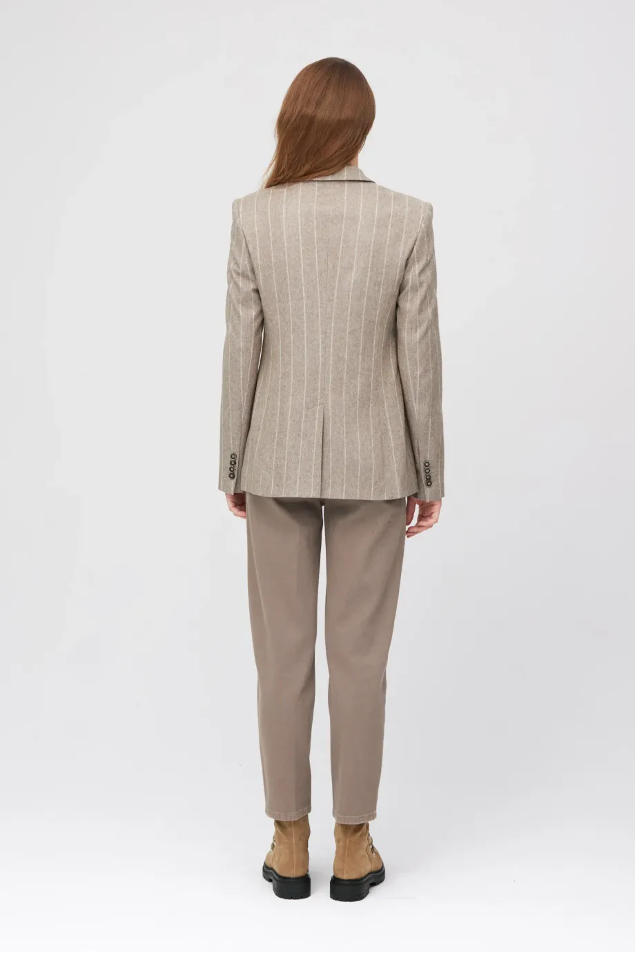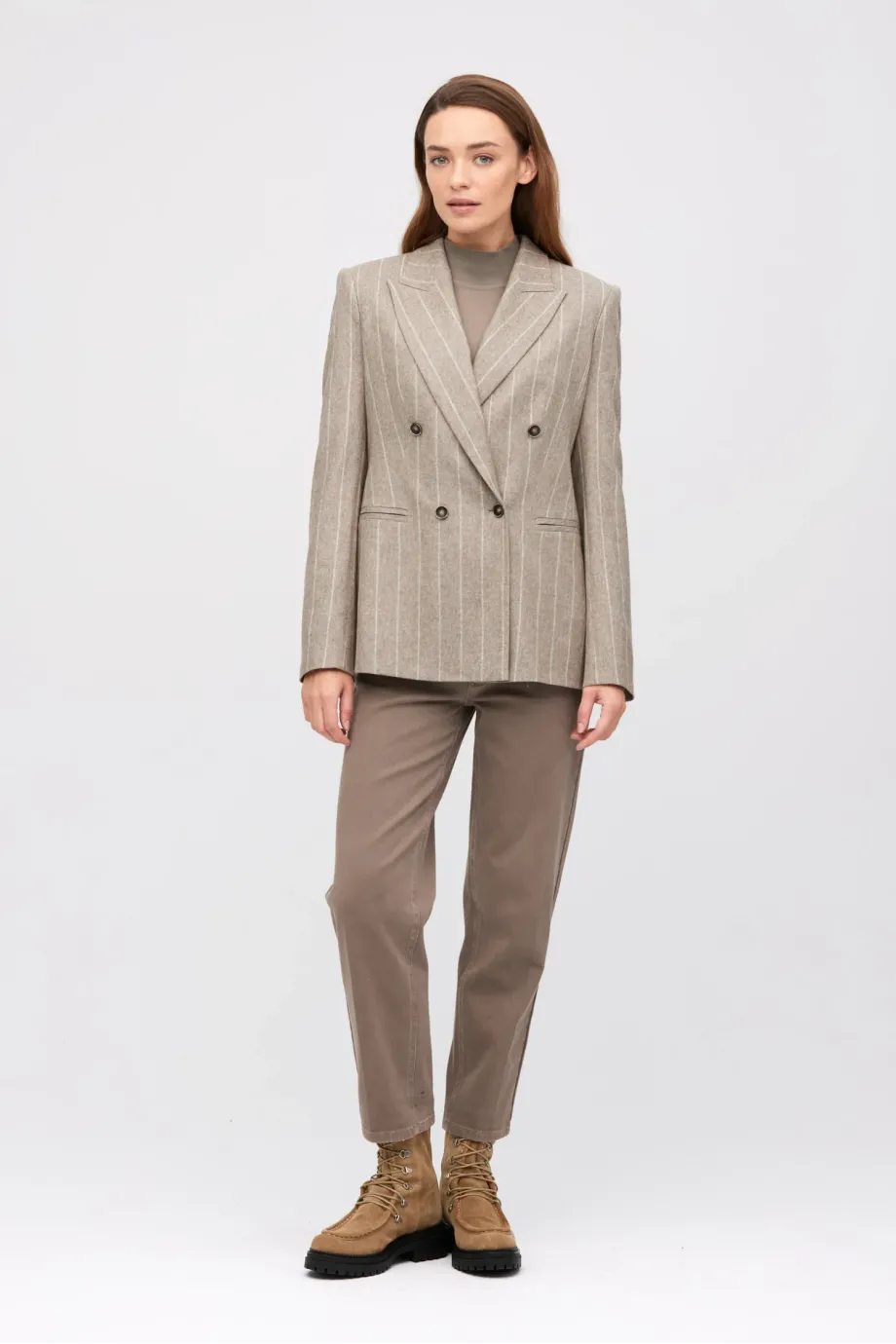 Zweireihiger Streifenblazer mit Kaschmiranteil in Taupe. Leicht taillierter Schnitt, lange Ärmel, Knopfleiste aus Büffelhorn und Innenknopf aus Corozo-Nuss. Taschen. Gefüttertes Modell mit Ziersteppung und Paspelierung von innen.
