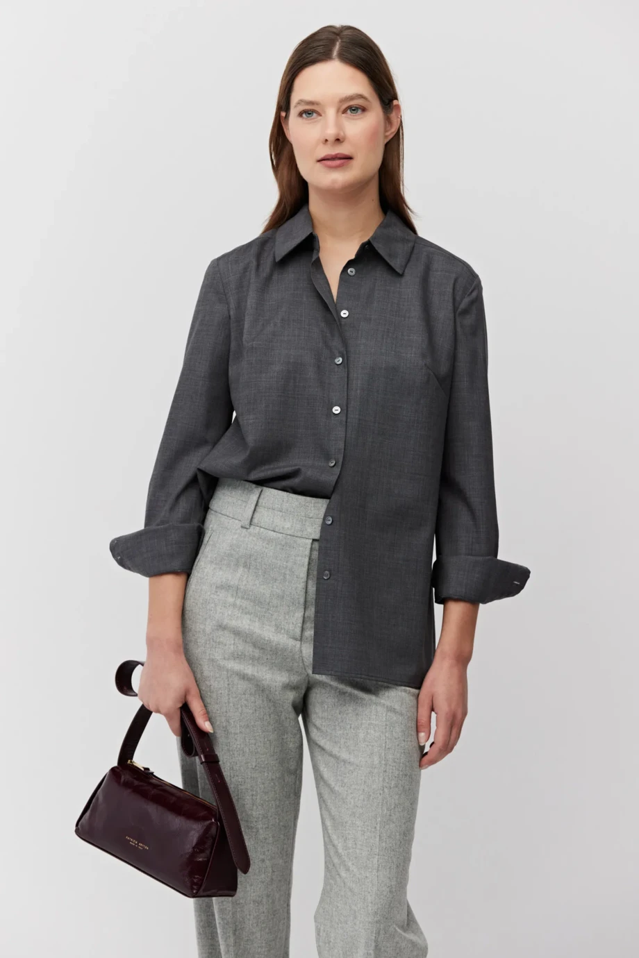 Wollhemd mit breiten Manschetten. Kragen, Knopfleiste mit Perlmuttknöpfen. Lange Ärmel. Farbe: Dunkelgrau.