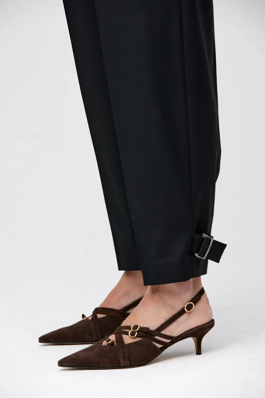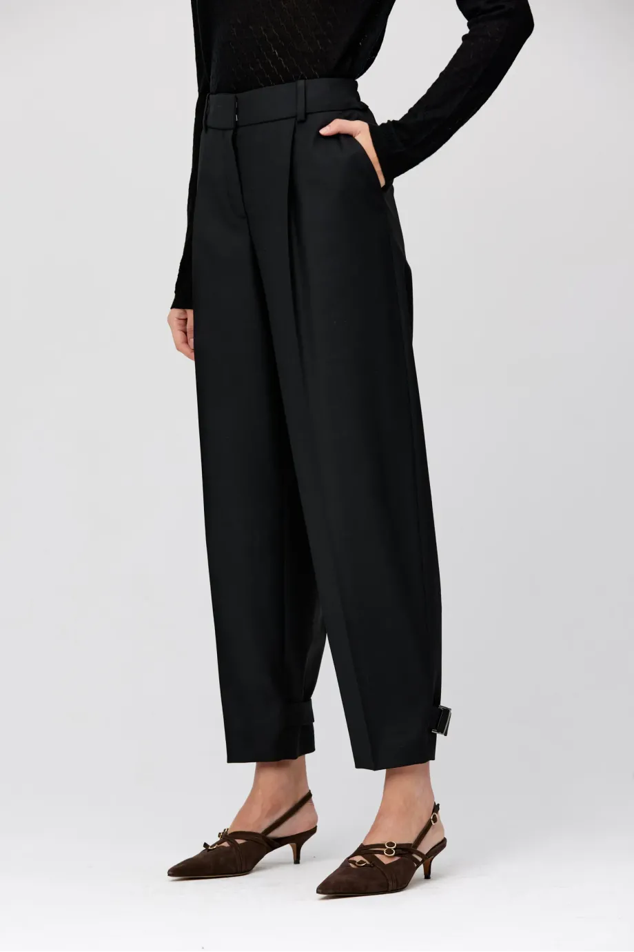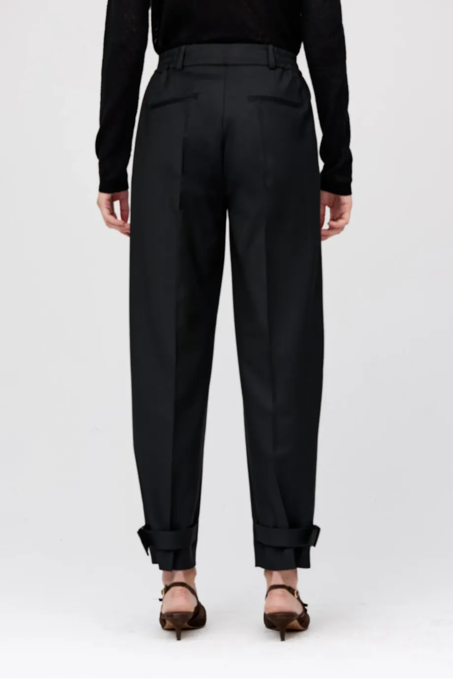 Hosen mit Wolle. Farbe schwarz. Schmal zulaufendes Bein, elastischer Bund hinten. Seitentaschen, dekorative Innenverarbeitung. Verschluss mit Stahlhaken und Knopf aus natürlichem Corozo-Nuss.