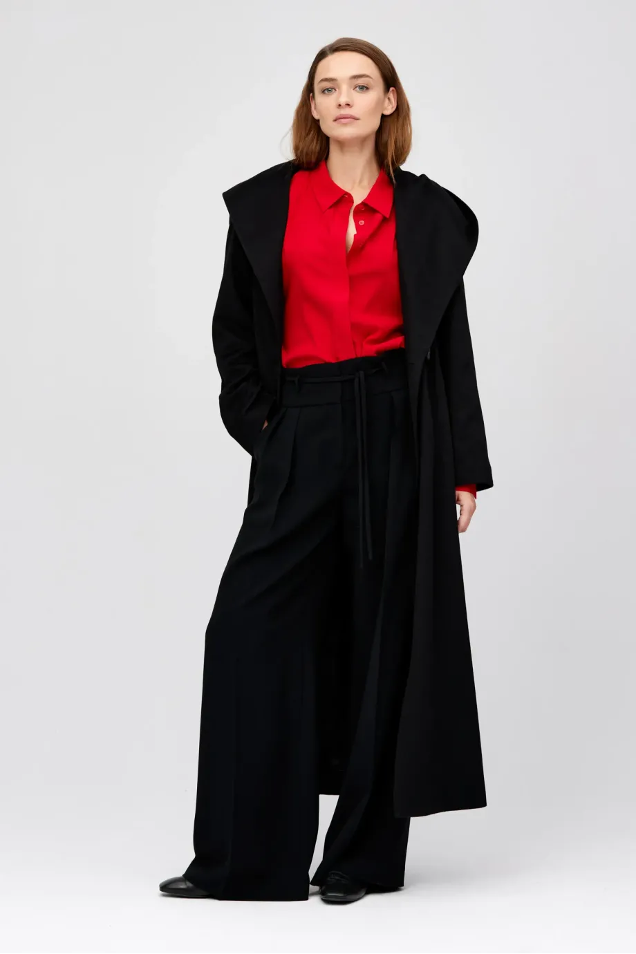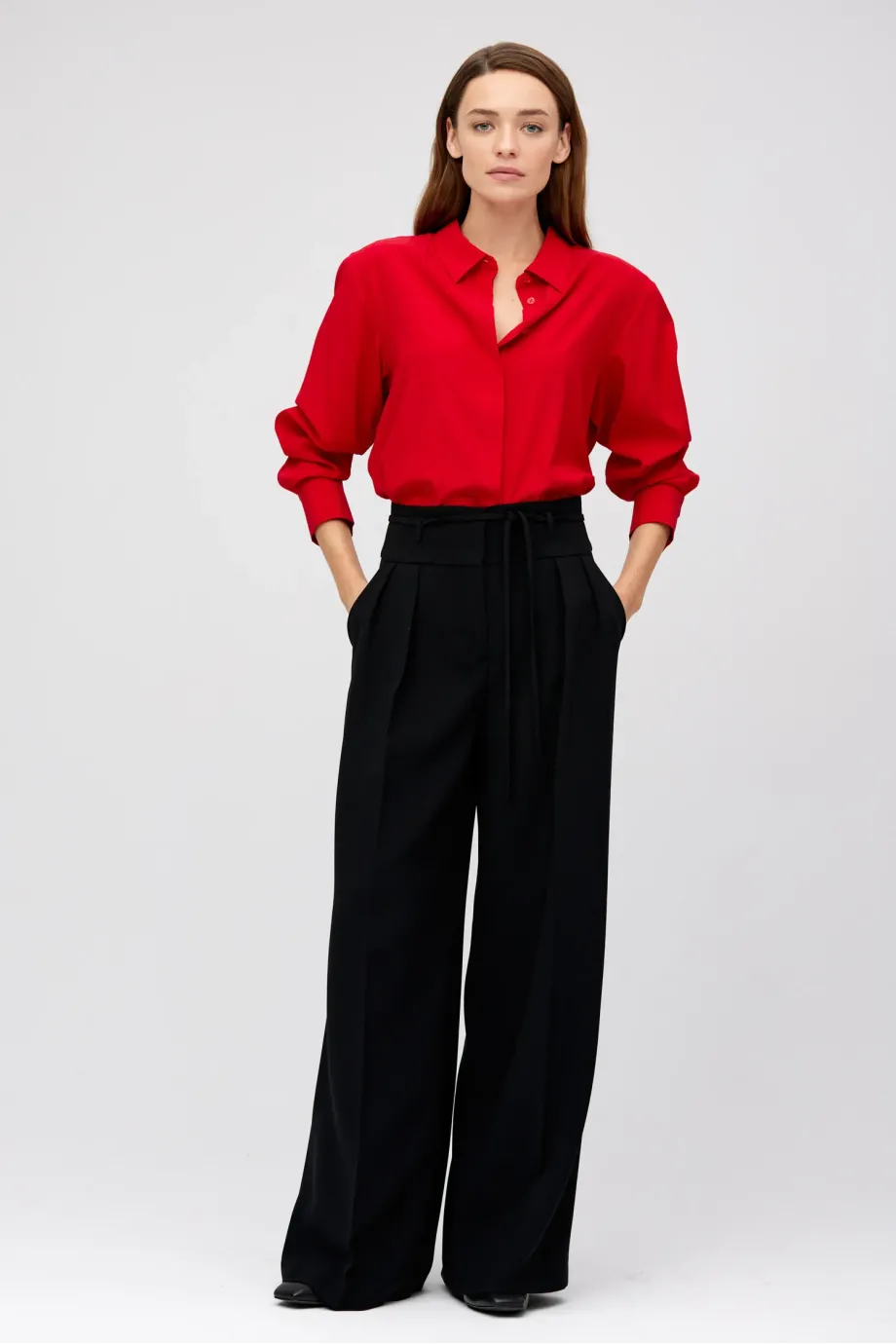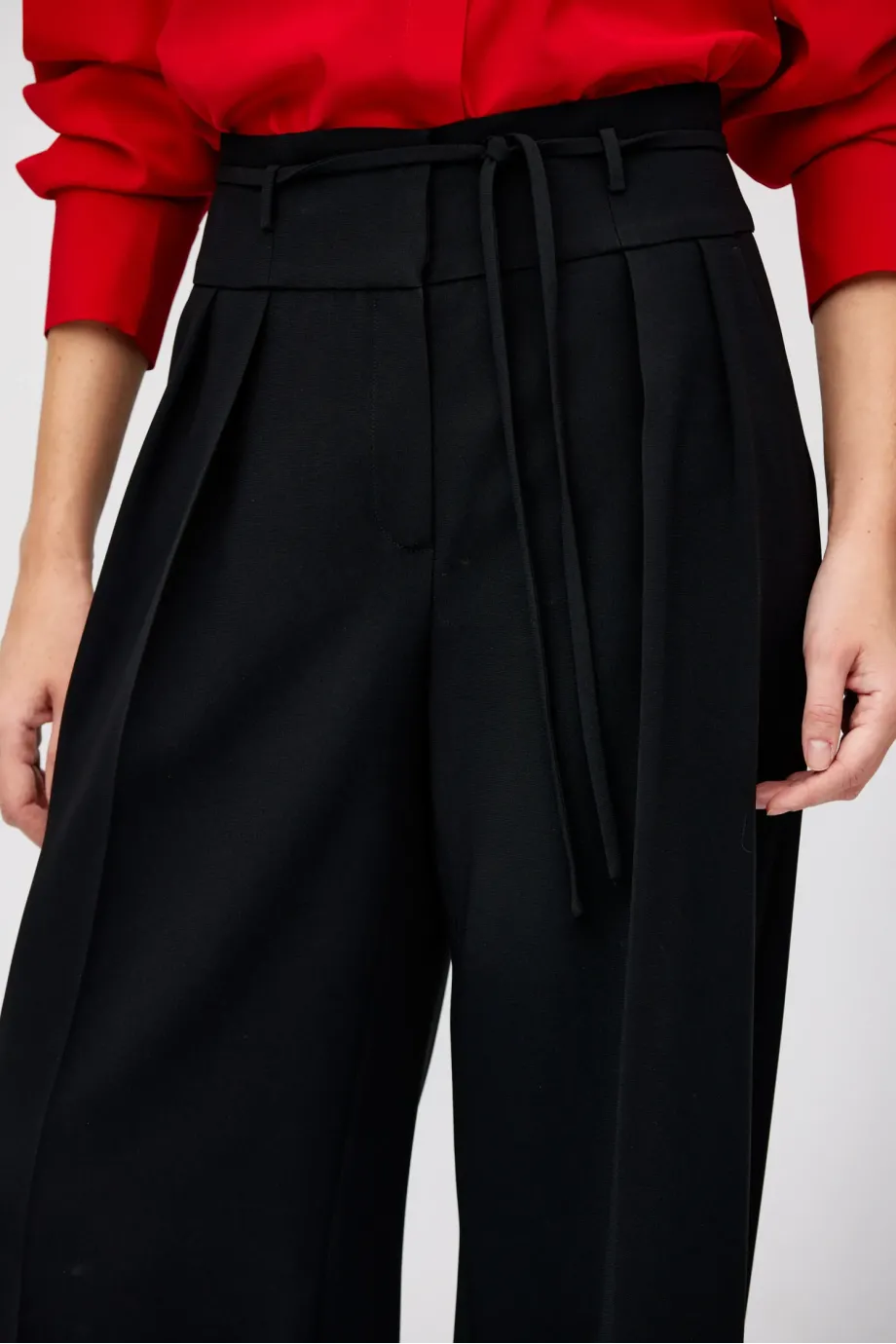 Hose mit hoher Taille. Weites Bein, Falten, Reißverschluss, Haken und Knopf aus Corozo innen. Innenfutter mit dekorativem Paspel. Taschen und Gürtelschlaufen. Farbe schwarz.