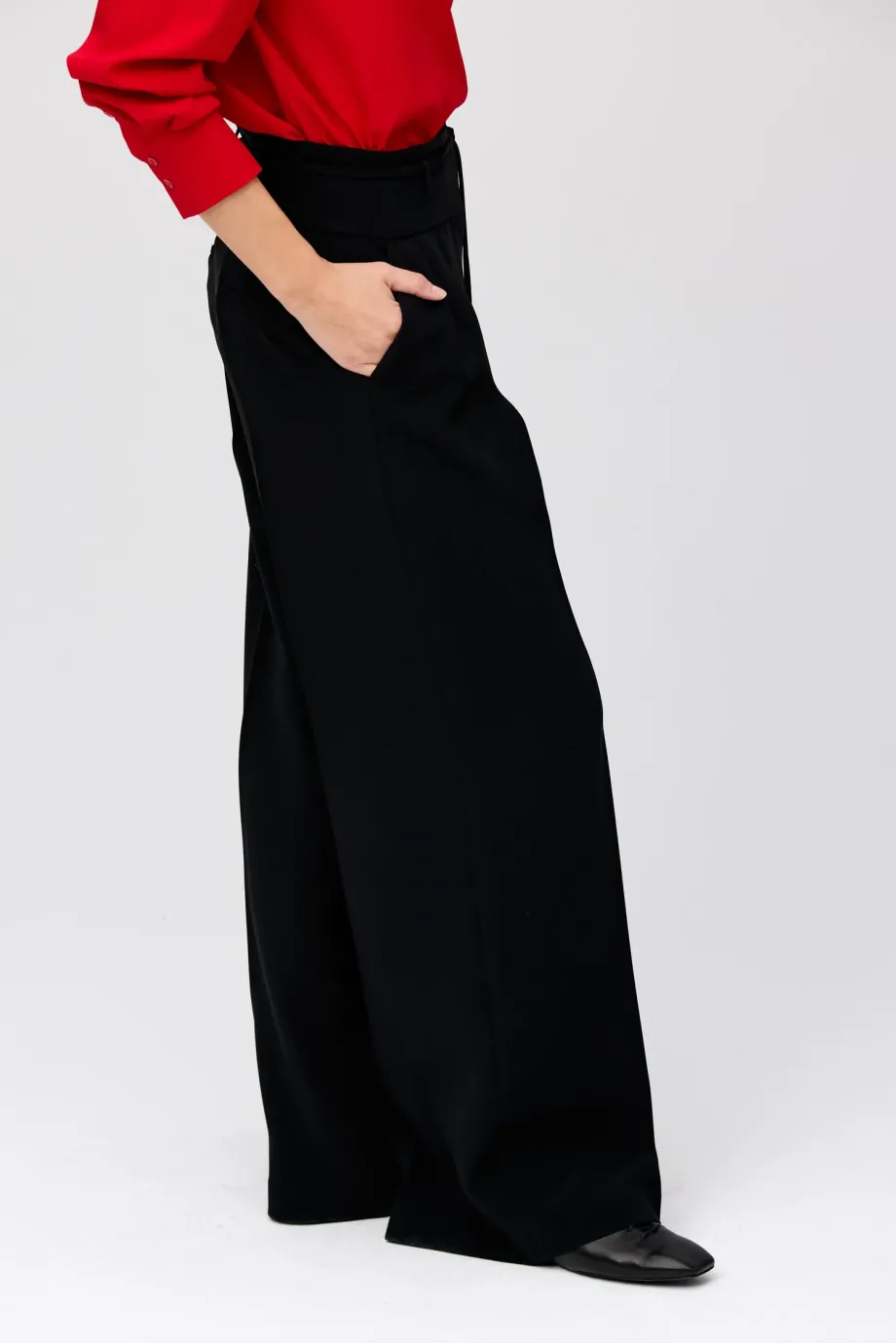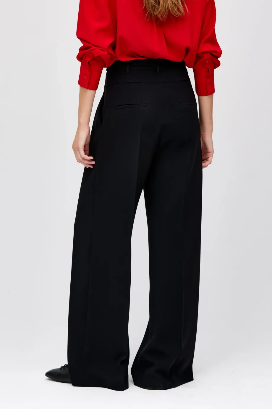 Schwarze Hose mit weitem Bein.
