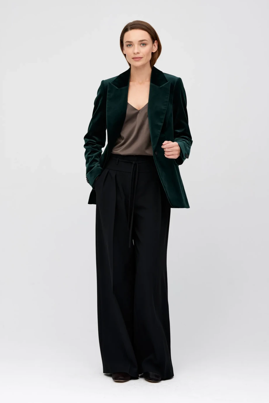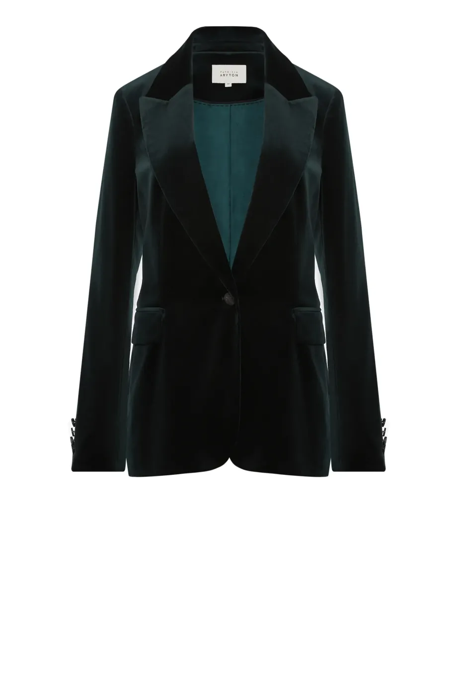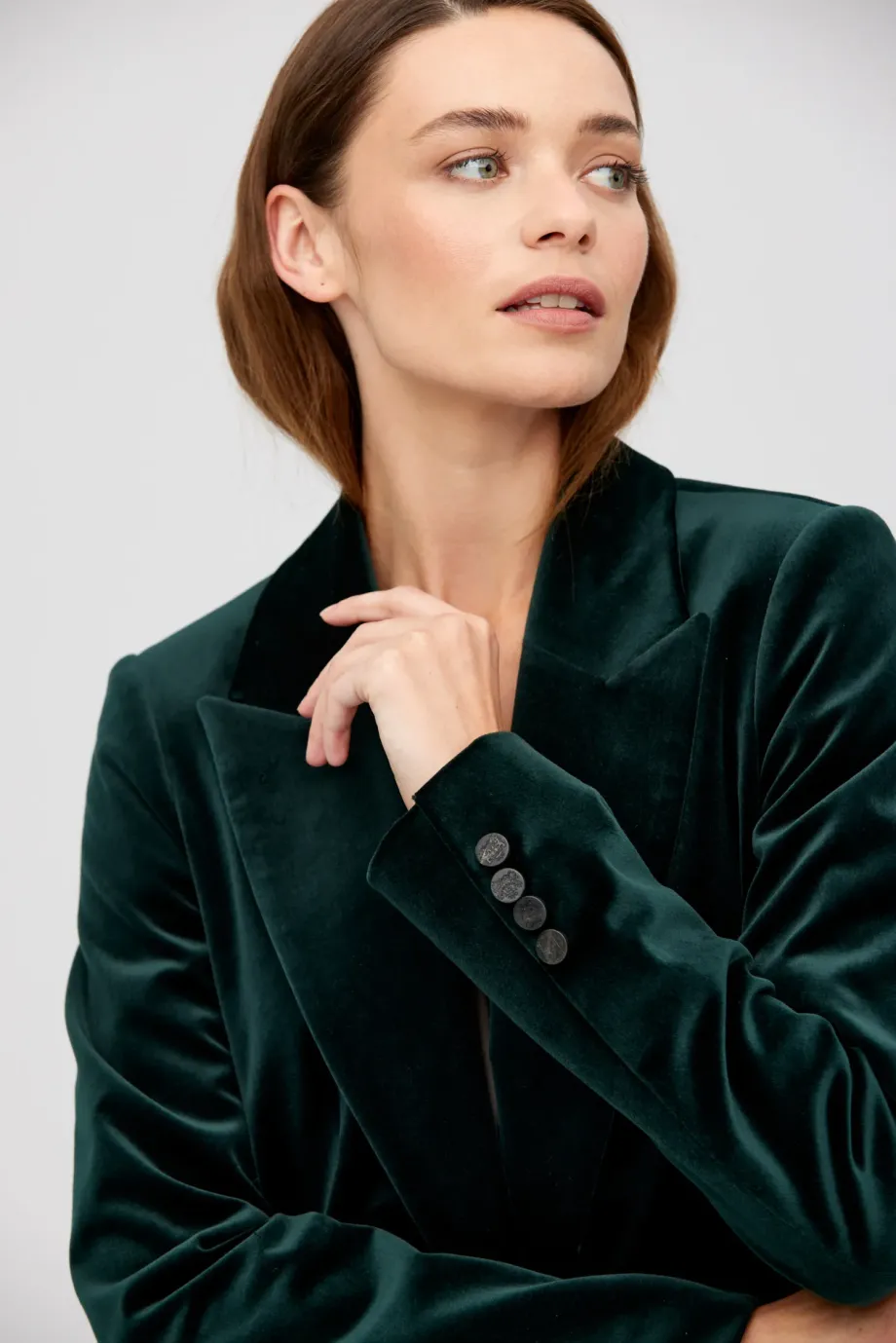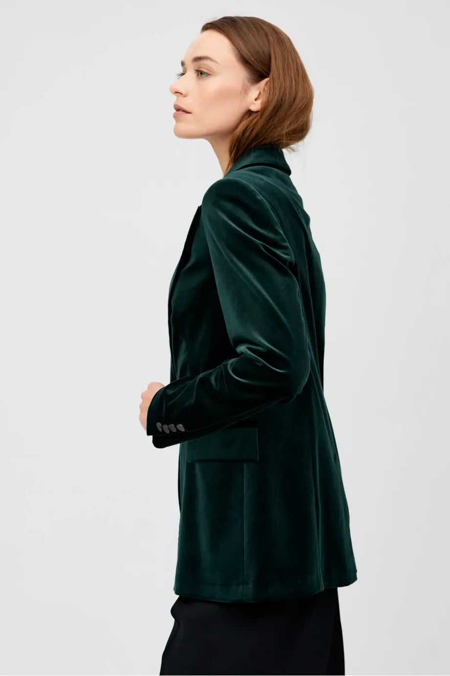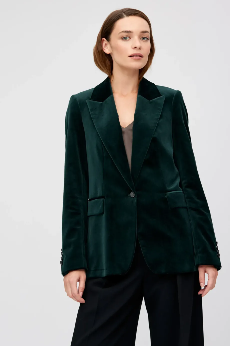 Einreihiger Blazer aus Samtstoff. Leicht taillierte Passform, lange Ärmel, Knopfverschluss aus Naturhorn. Taschen. Modell mit Futter, mit dekorativer Steppnaht und Paspelierung von innen. Farbe grün.