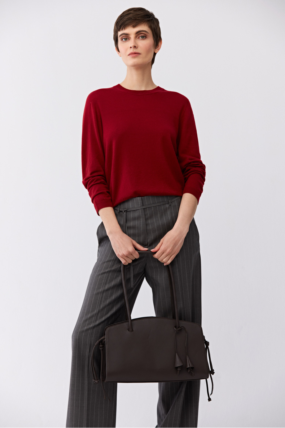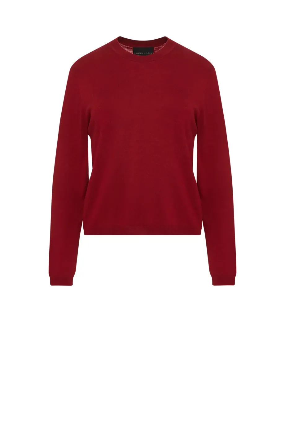 T-Shirt aus Merinowolle in feiner Single-Jersey-Struktur, gefertigt auf einer 18-GG-Maschine. Rundhalsausschnitt, lange Ärmel. Gerader, kurzer Schnitt. Farbe Rot.