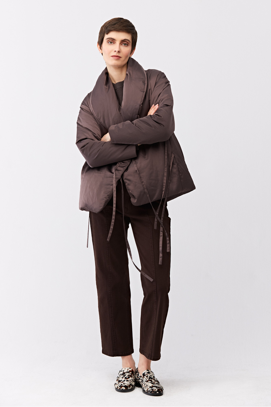 Jacke mit natürlicher Füllung. Bindegürtel als Verschluss. Schalkragen, der in einen Stehkragen übergeht. Lange Ärmel. Schlichte, kastige Form. Farbe Braun.