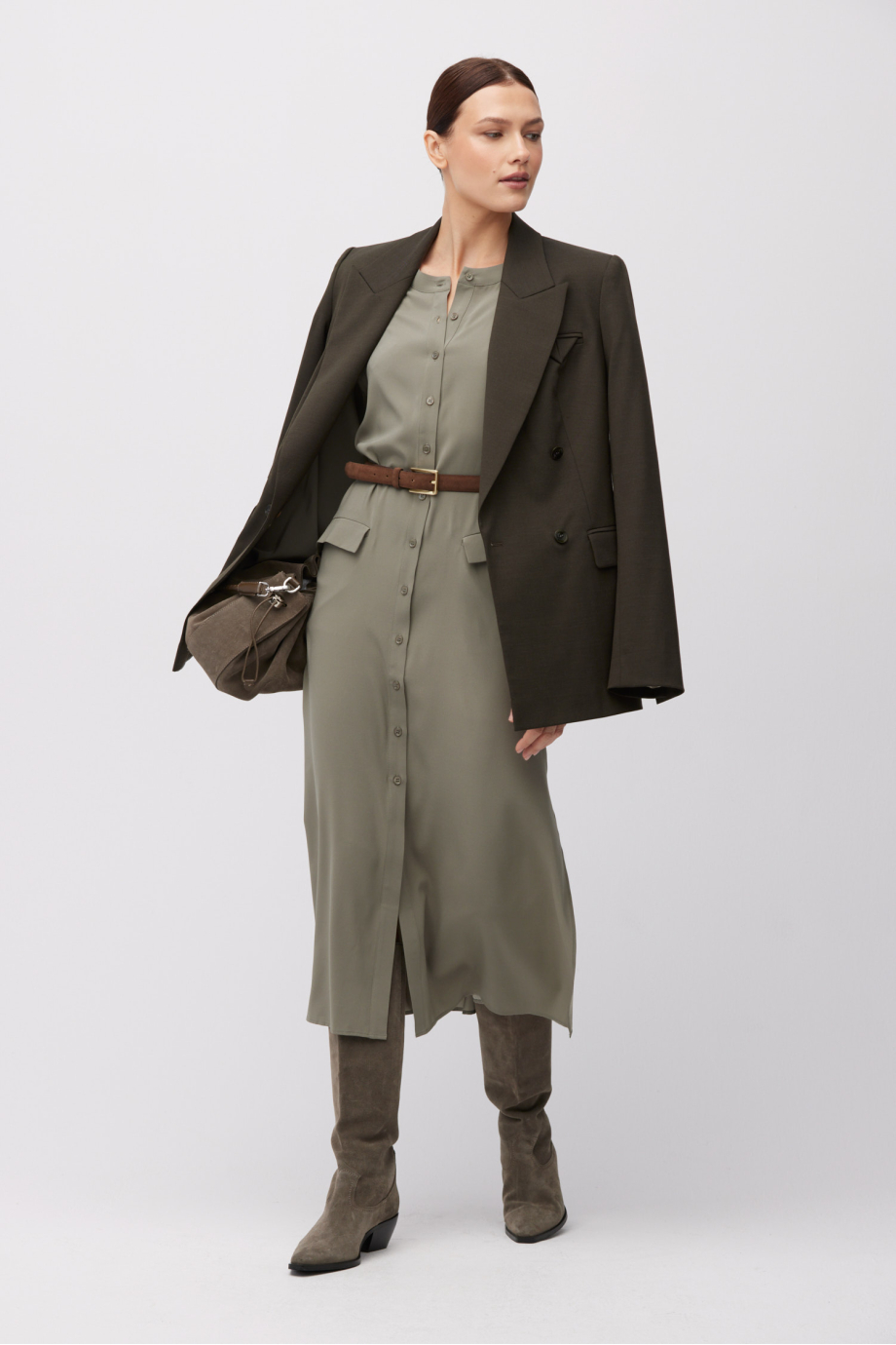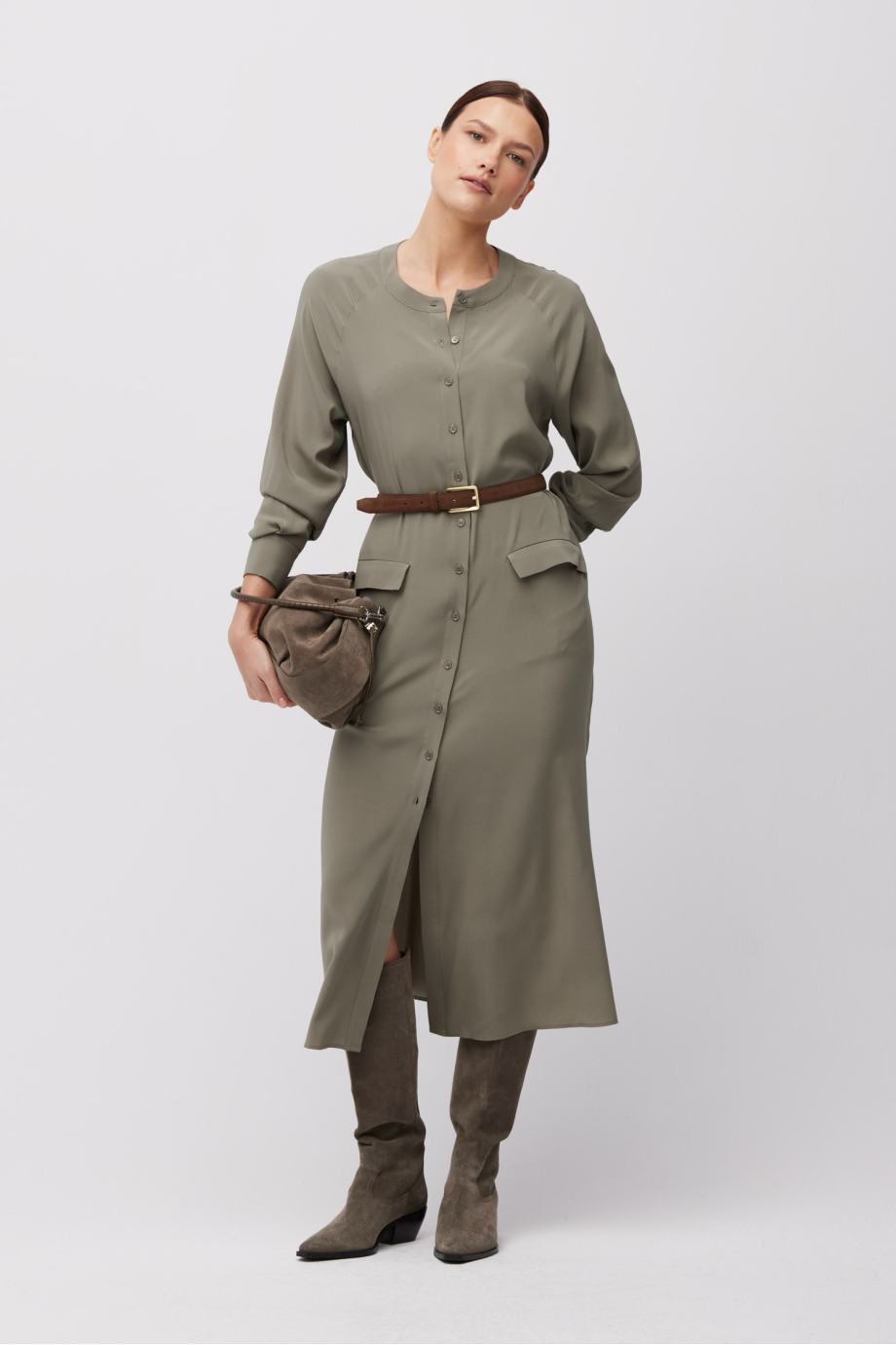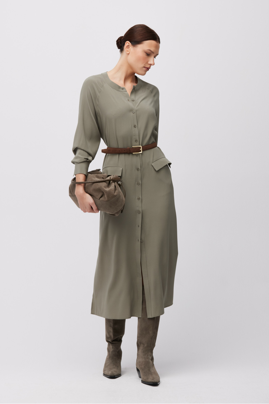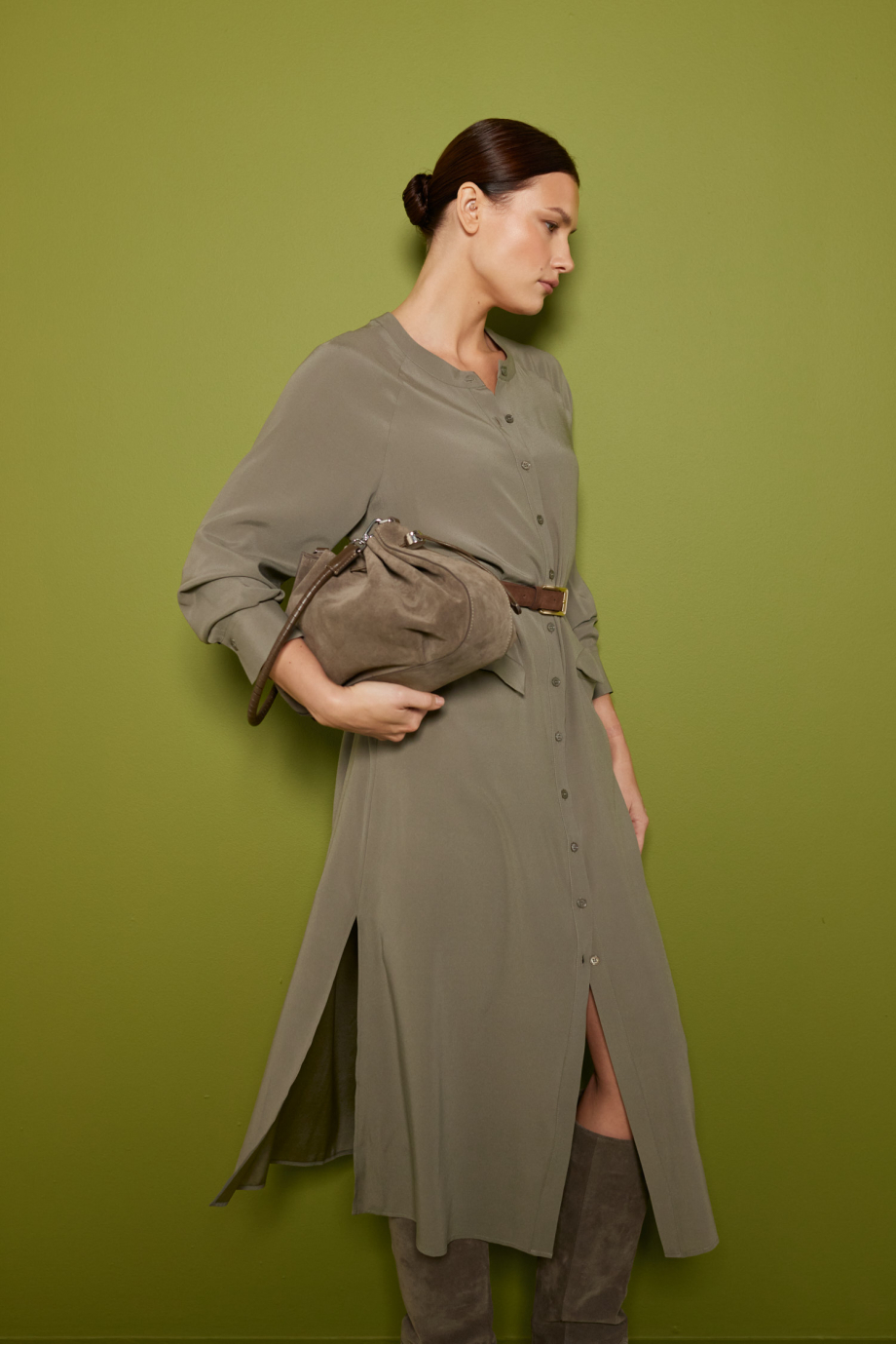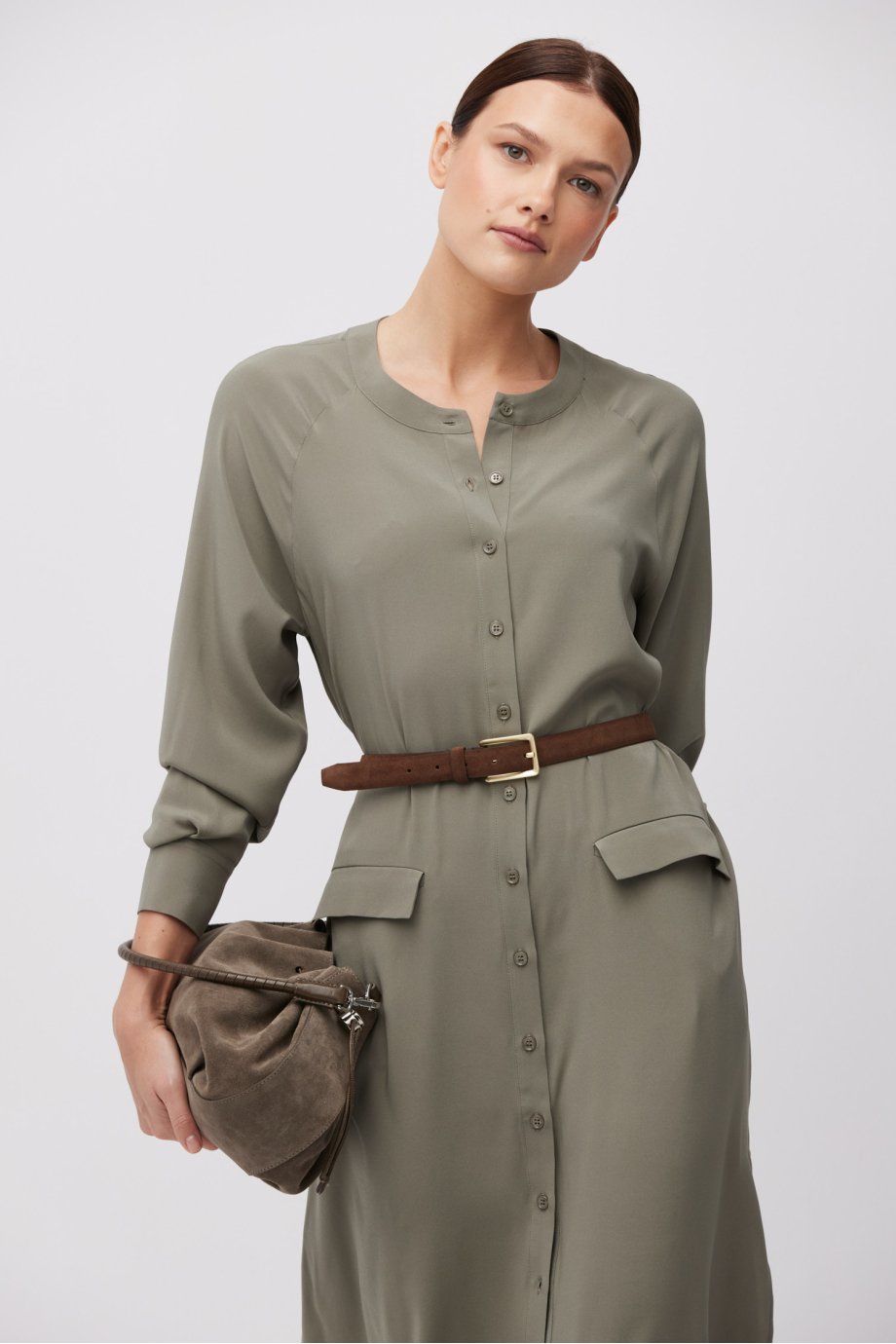 Grünes Seidenkleid. Gerader Schnitt mit seitlichen Schlitzen, lange Ärmel. Gürtel. Knopfverschluss. Midi-Länge.