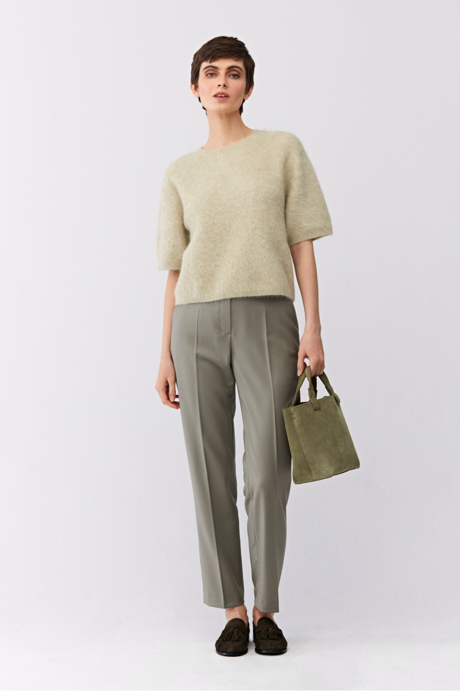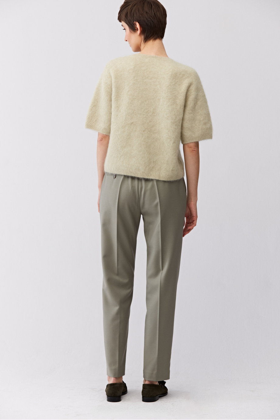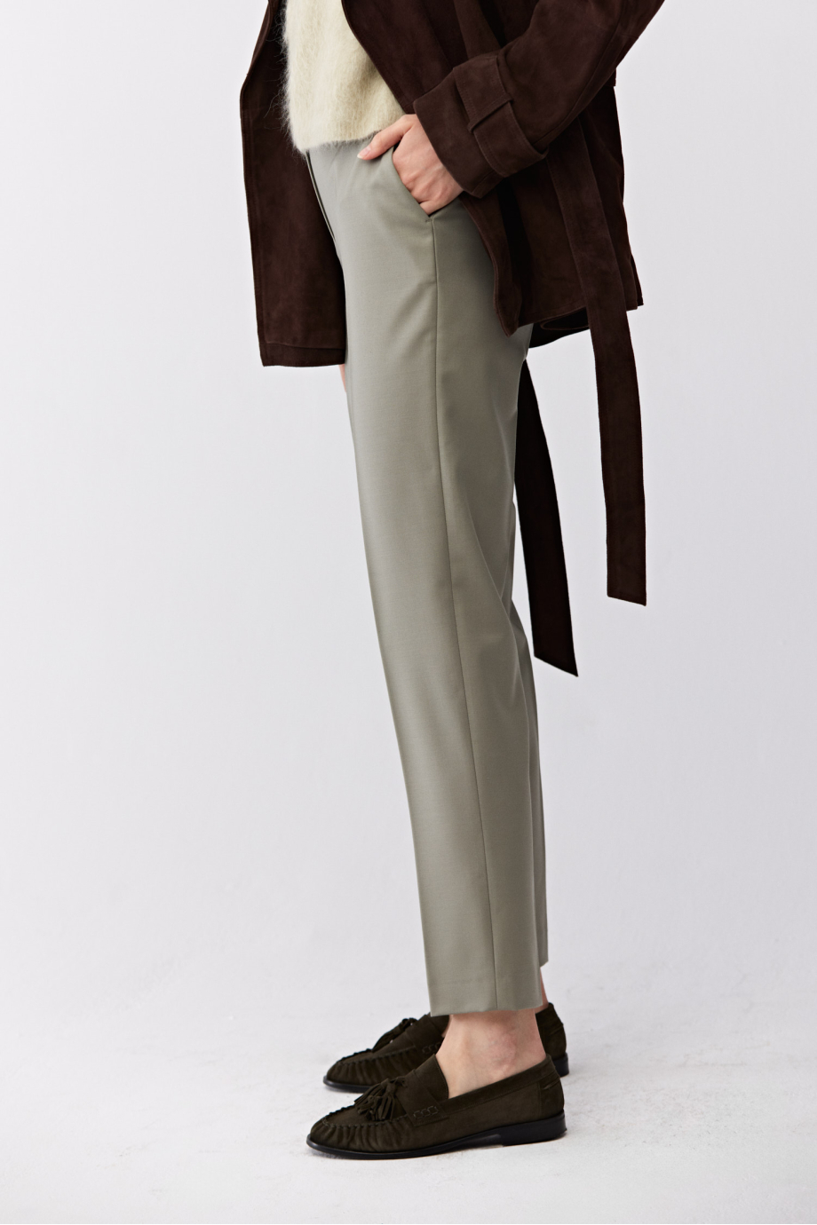 Wollhose mit leicht zulaufendem Bein. Taschen. Reißverschluss, Haken und innenliegender Corozo-Knopf. Innenseite mit dekorativer Paspelierung. Farbe Salbeigrün.