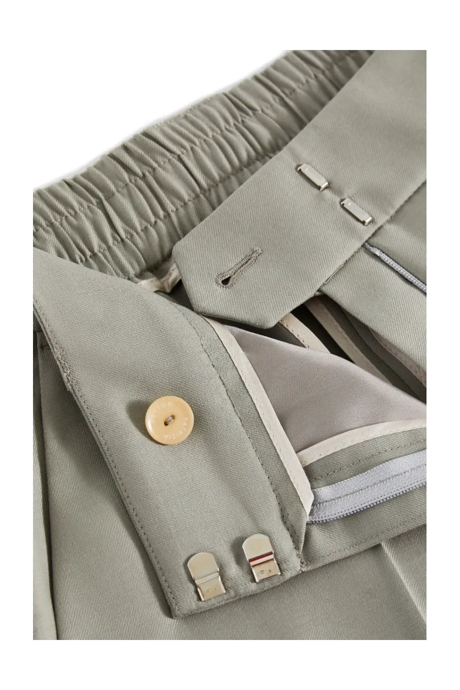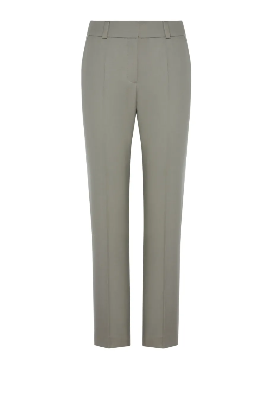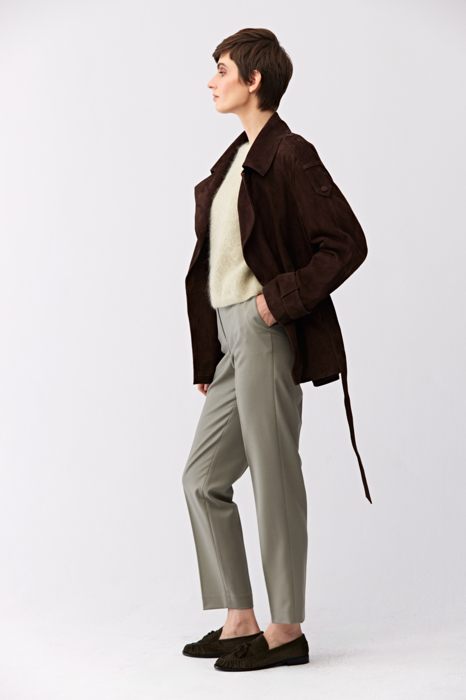 Wollhose mit leicht zulaufendem Bein. Taschen. Reißverschluss, Haken und innenliegender Corozo-Knopf. Innenseite mit dekorativer Paspelierung. Farbe Salbeigrün.