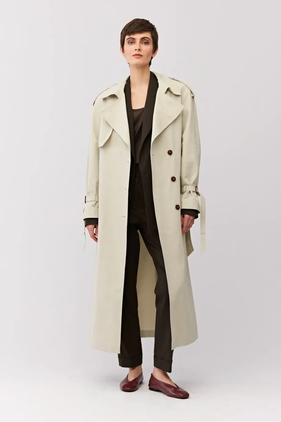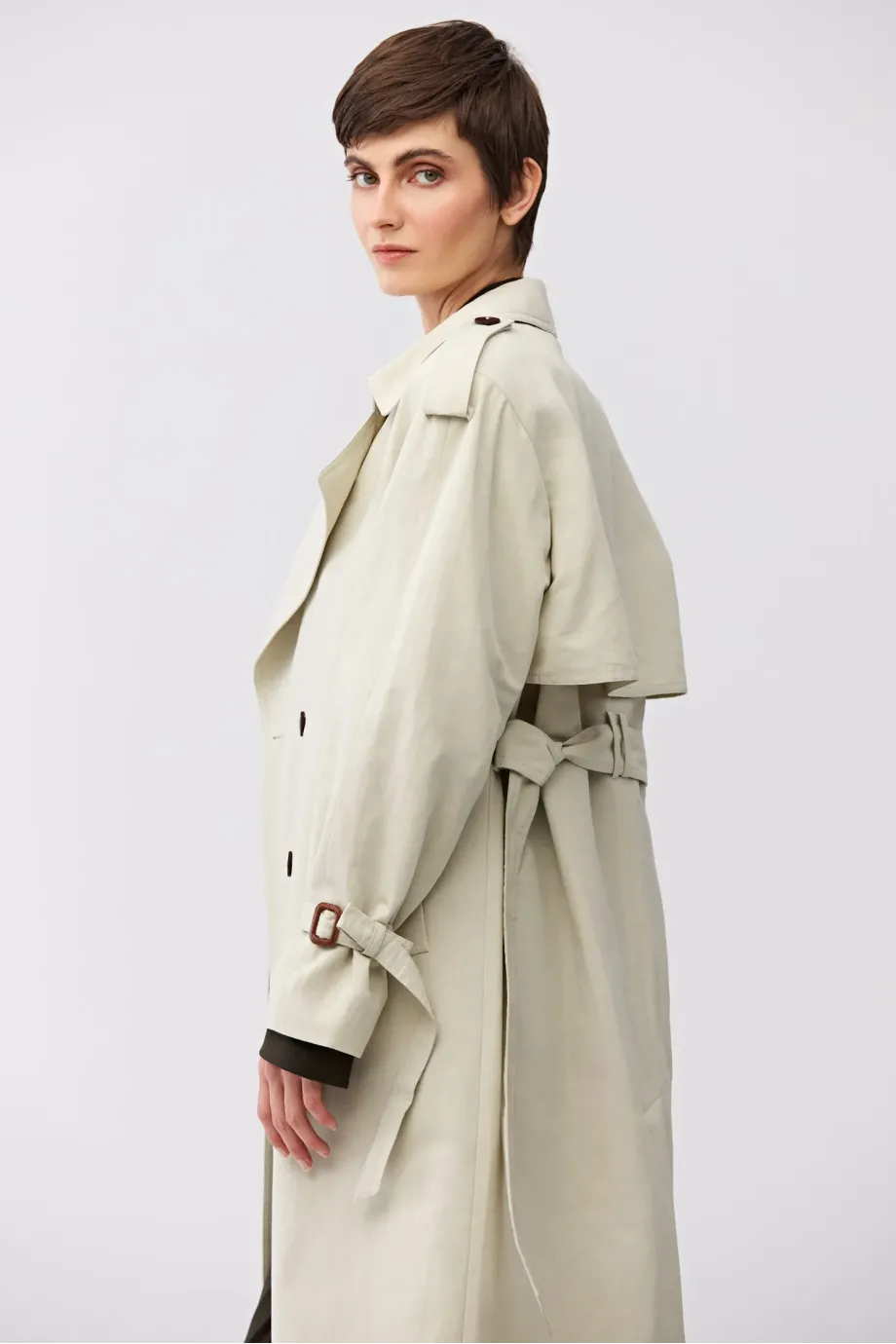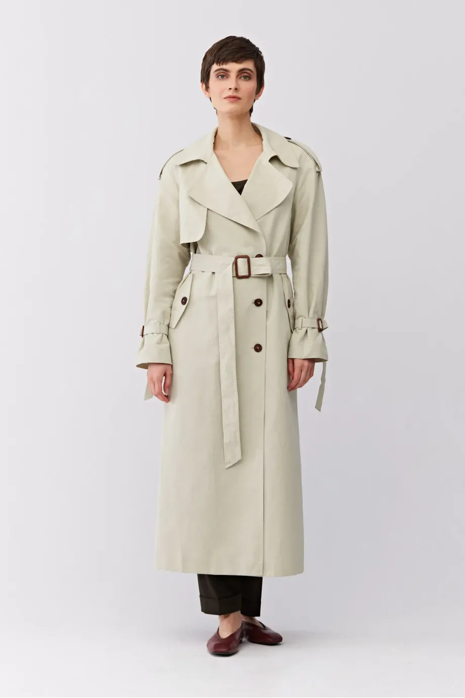 Langer Trenchcoat mit Gürtel. Raglanärmel. Aus einem Baumwoll-Leinen-Mix gefertigt. Taillengürtel. Kragen, Schulterriegel an den Ärmeln. Naturknöpfe. Taschen.
