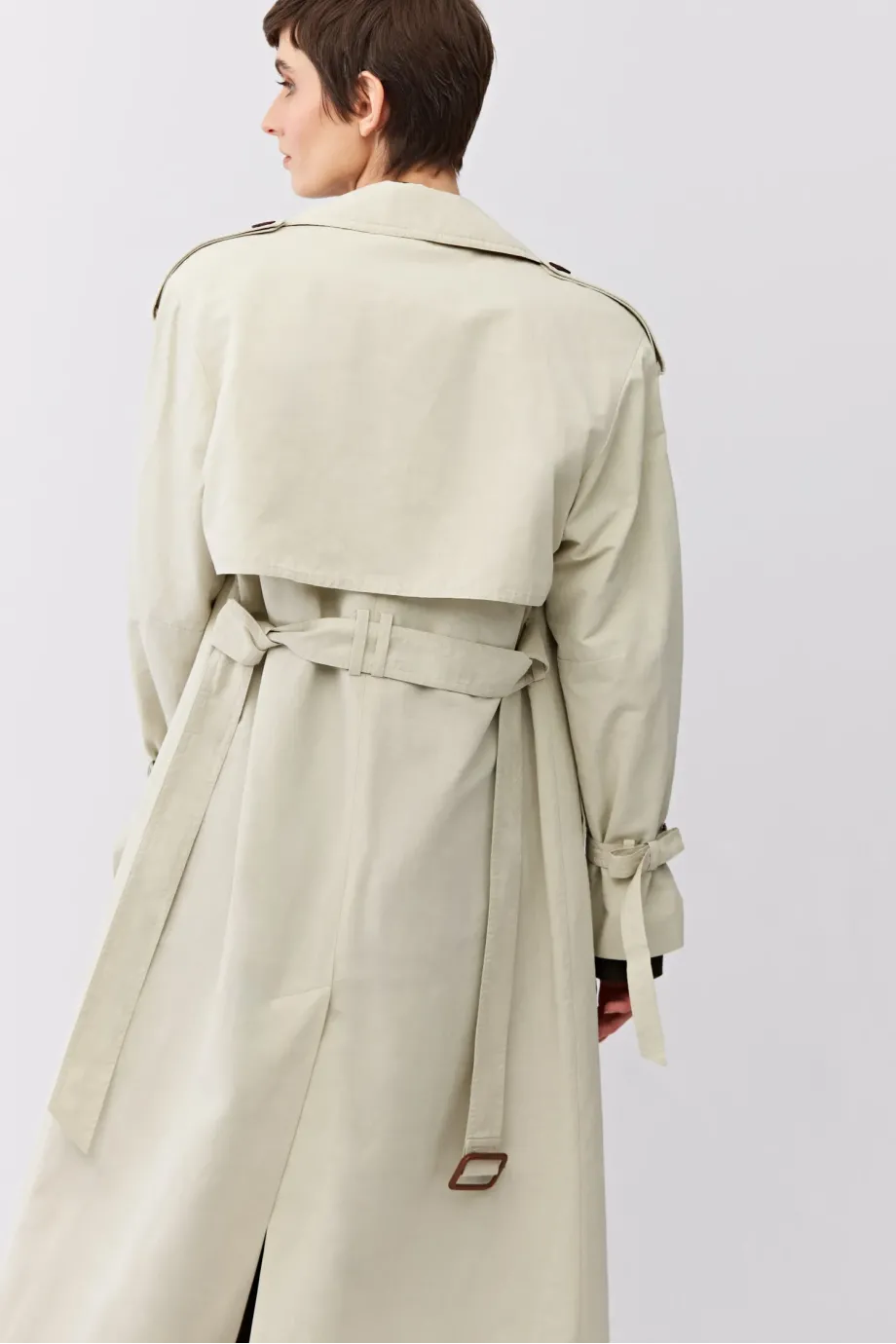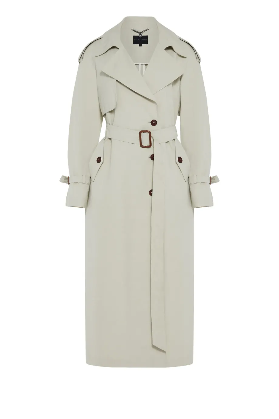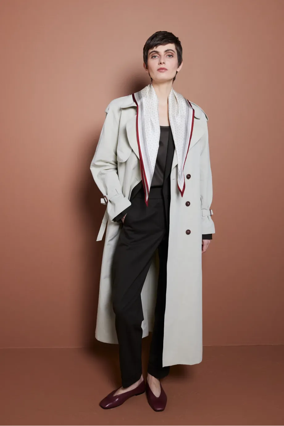 Langer Trenchcoat mit Gürtel. Raglanärmel. Aus einem Baumwoll-Leinen-Mix gefertigt. Taillengürtel. Kragen, Schulterriegel an den Ärmeln. Naturknöpfe. Taschen.
