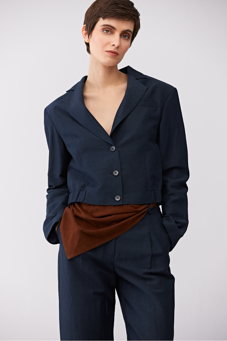 Einreihiges Sakko aus Schurwolle und Leinen. Kastiger Schnitt, lange Ärmel, Knopfverschluss. Taschen. Gefüttert, mit dekorativen Steppnähten und Paspelierung innen. Farbe Marineblau. Zur Ergänzung des Sets ist eine Hose aus demselben Stoff erhältlich.