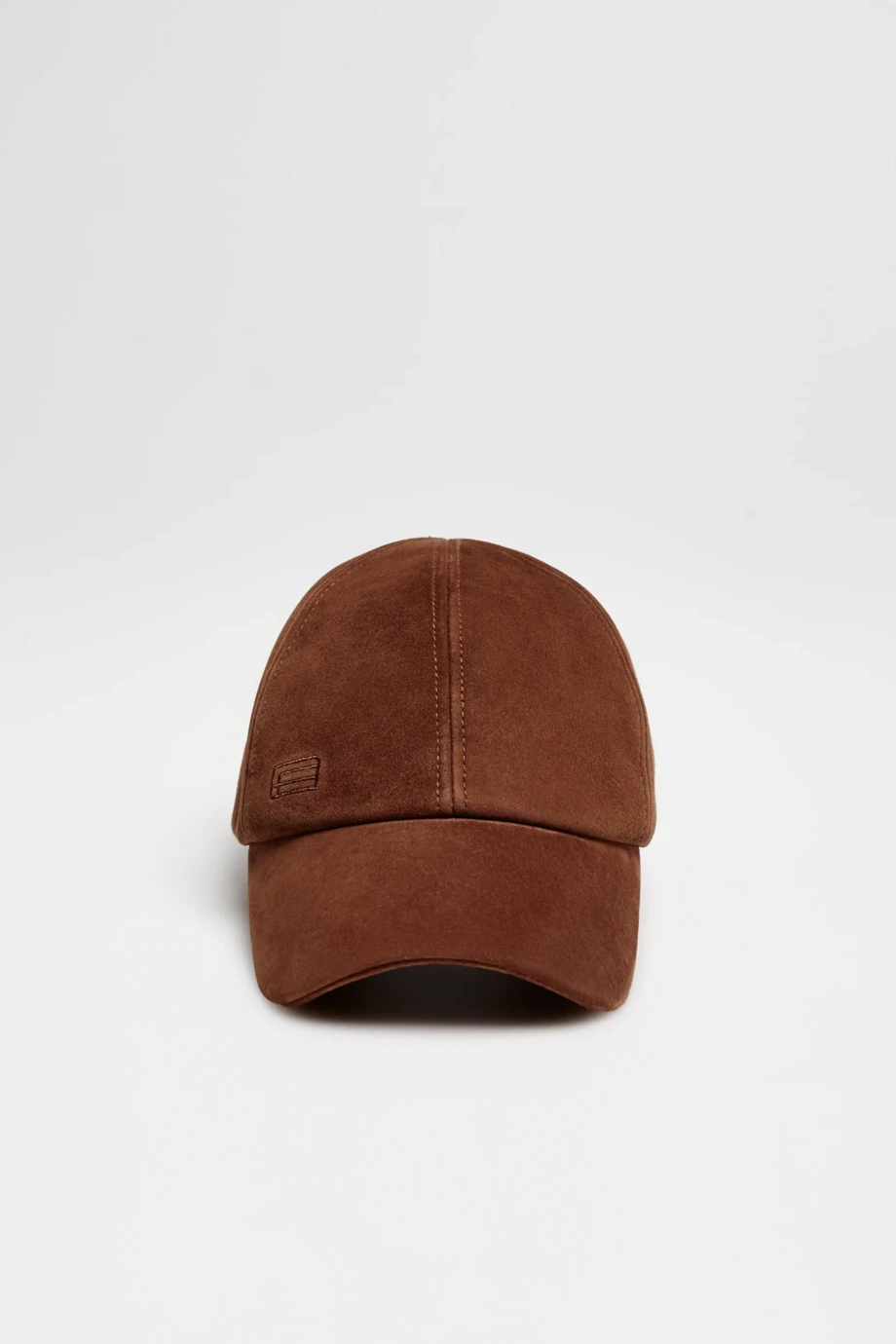 Basecap aus natürlichem Wildleder in Braun. Auf der Rückseite verstellbarer Verschluss aus Naturleder.