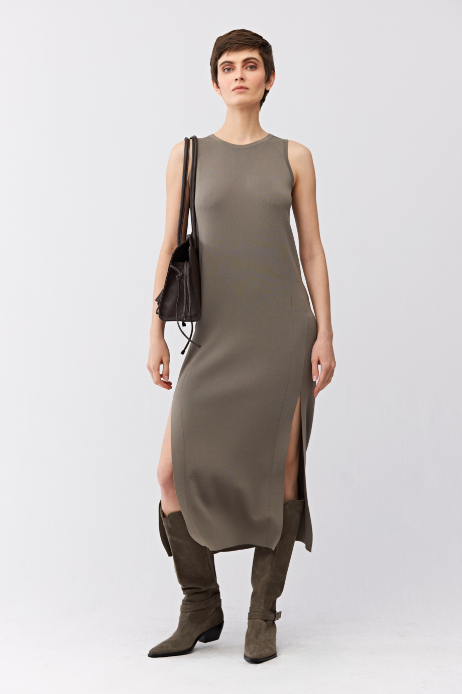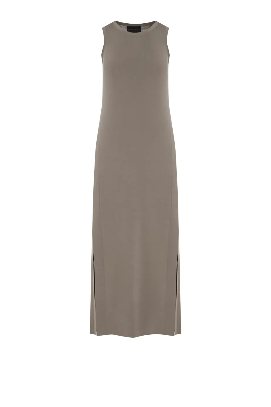 Grünes ärmelloses Midikleid. Weicher, fließender Strick in 1x1-Rippstruktur, gefertigt auf einer 14-GG-Maschine. Seitliche Schlitze.