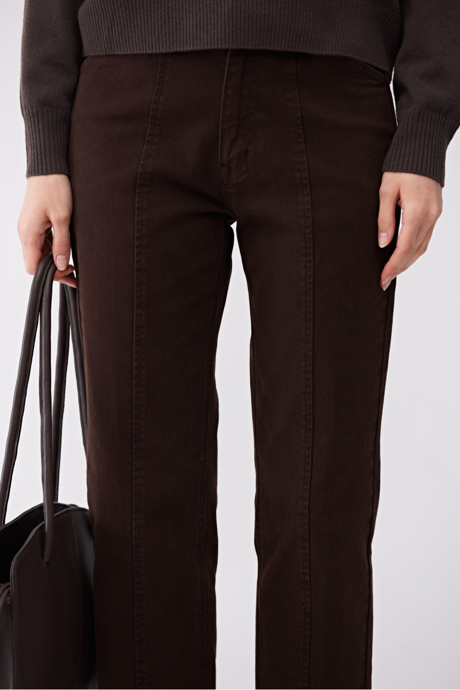 Jeans im geraden Schnitt mit Ziernähten. Hohe Taille. Verschluss mit Reißverschluss und Metallknopf. Gefertigt aus Baumwolle mit Elasthananteil – weich und angenehm zu tragen. Farbe Braun.