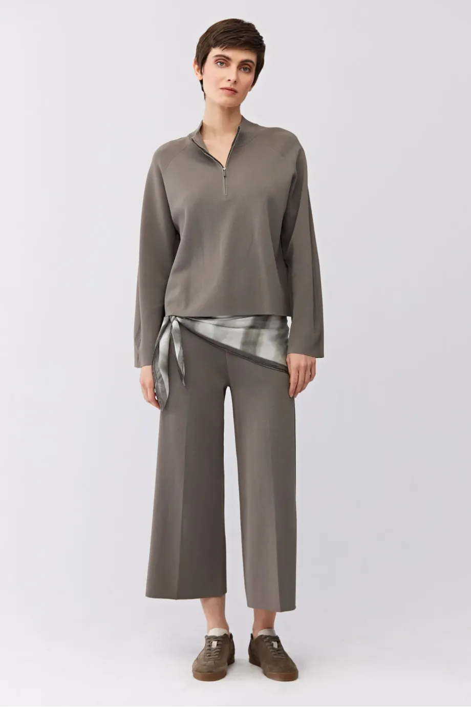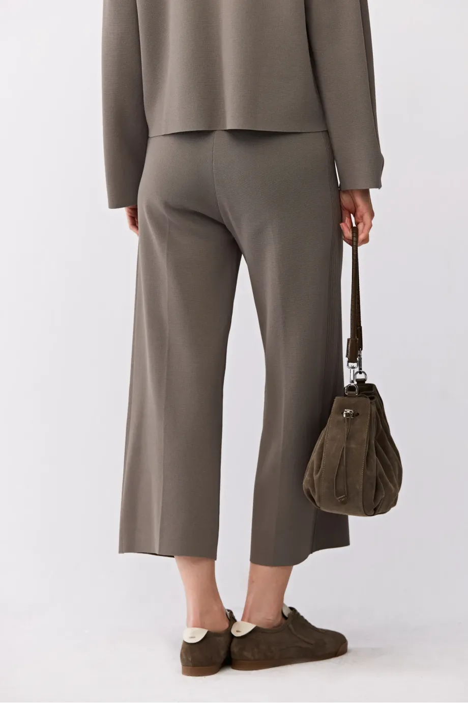 Culotte-Hose aus Strick. Gerades Bein mit seitlichem Streifen, weicher Strick, der sich der Silhouette anpasst. Farbe Hellgrün. Passendes Sweatshirt aus demselben Material erhältlich.