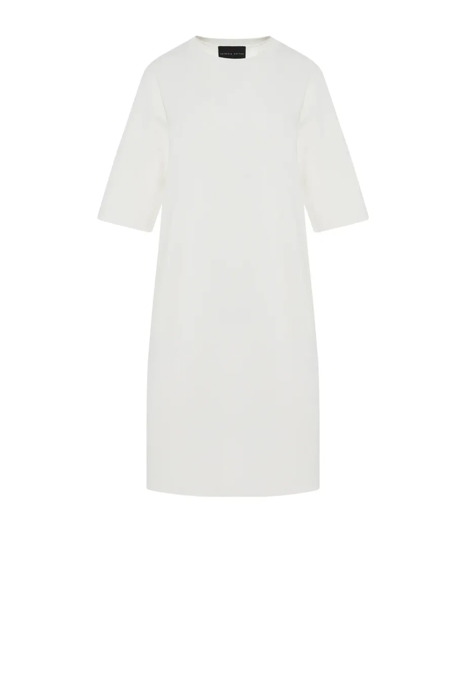 Weißes Kleid mit kurzem Ärmel. Schlichte, lockere Form. Weiche, fließende Strickware mit feiner, dichter Struktur, gefertigt auf einer 16-GG-Maschine. Zur Ergänzung des Sets ist eine Hose aus derselben Strickware erhältlich.
