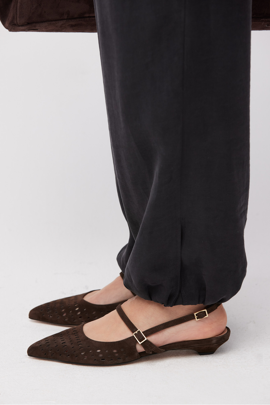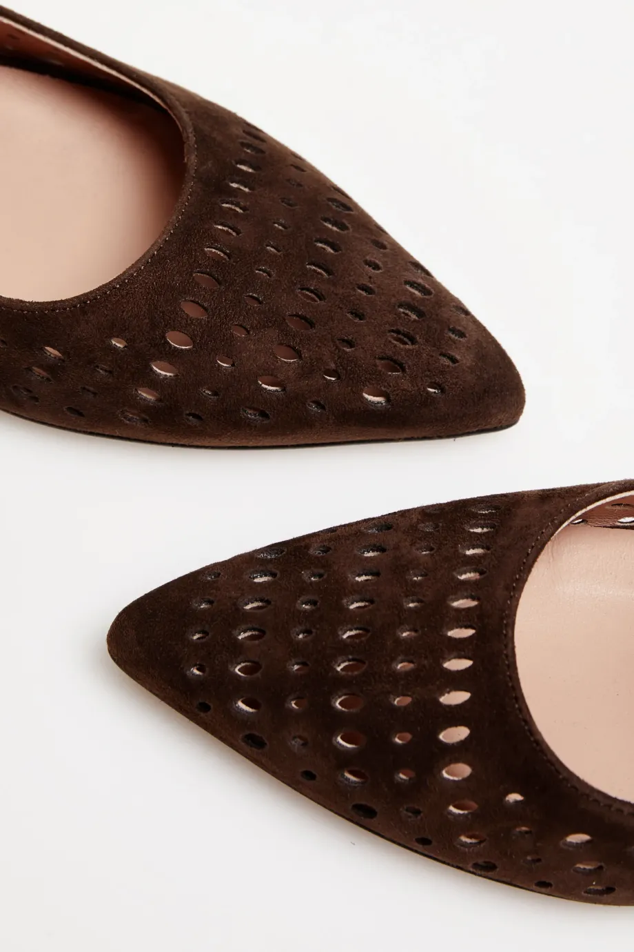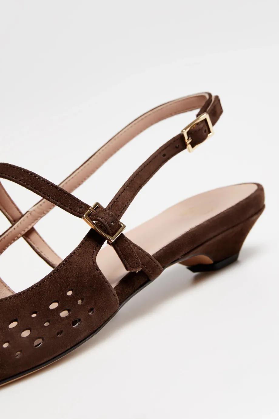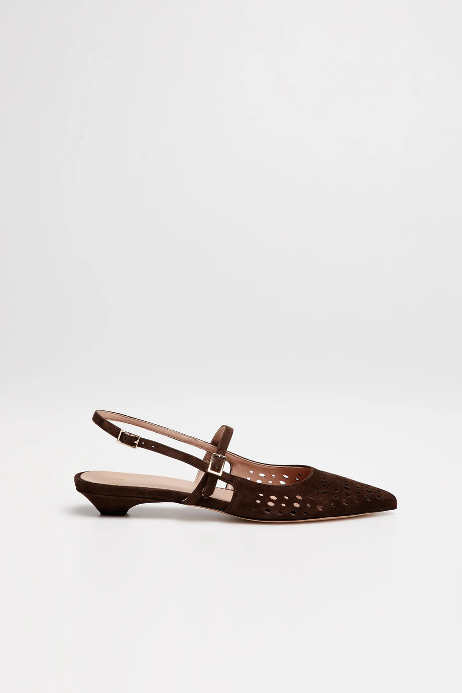 Braune Slingback-Schuhe aus Naturleder. Sehr weiches, perforiertes Ziegenleder. Verstellbarer Verschluss. Niedriger Absatz. Handgefertigt in einer italienischen Manufaktur.