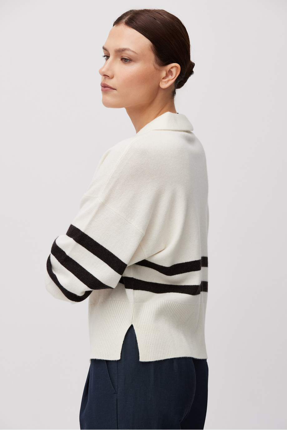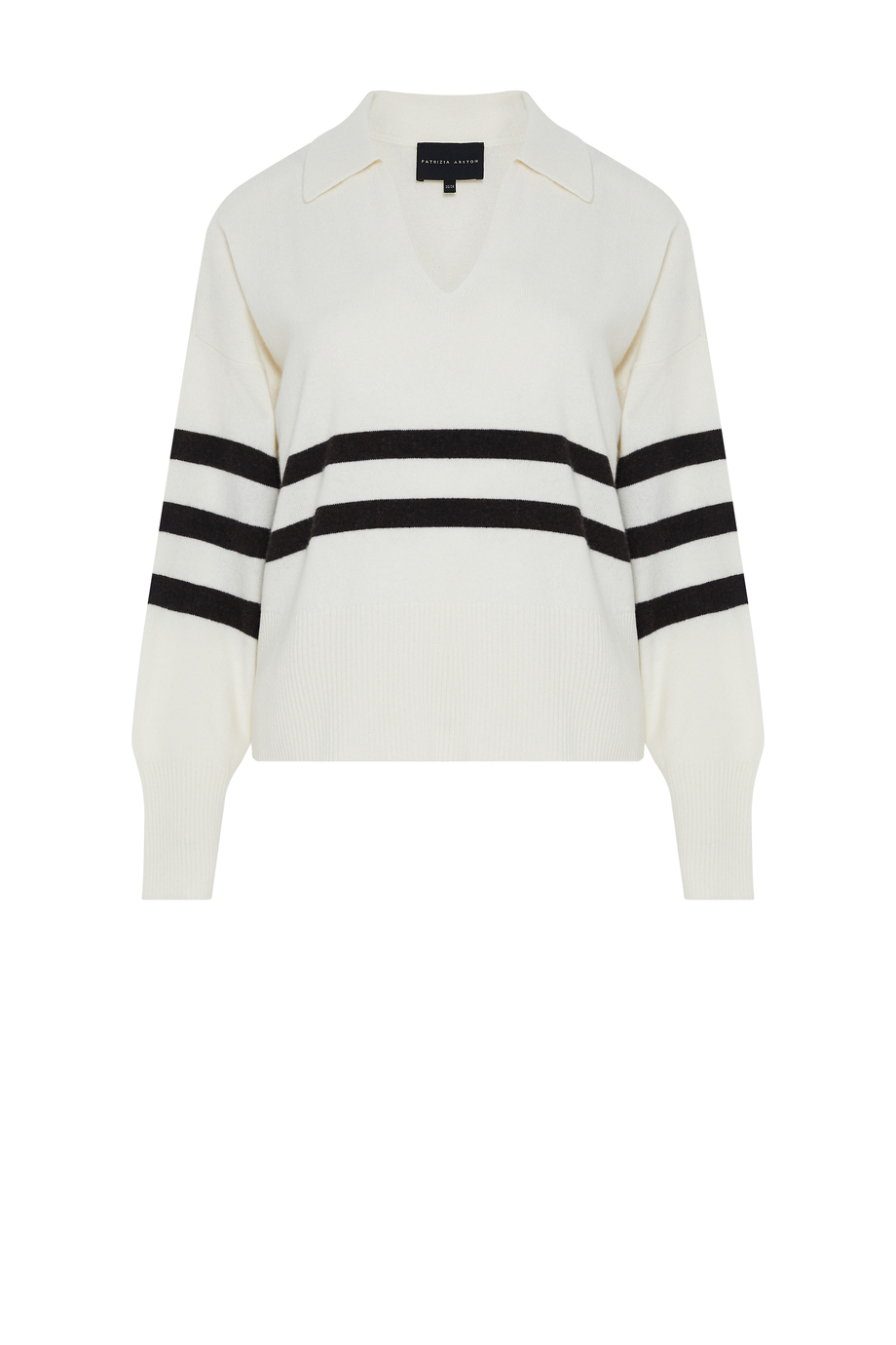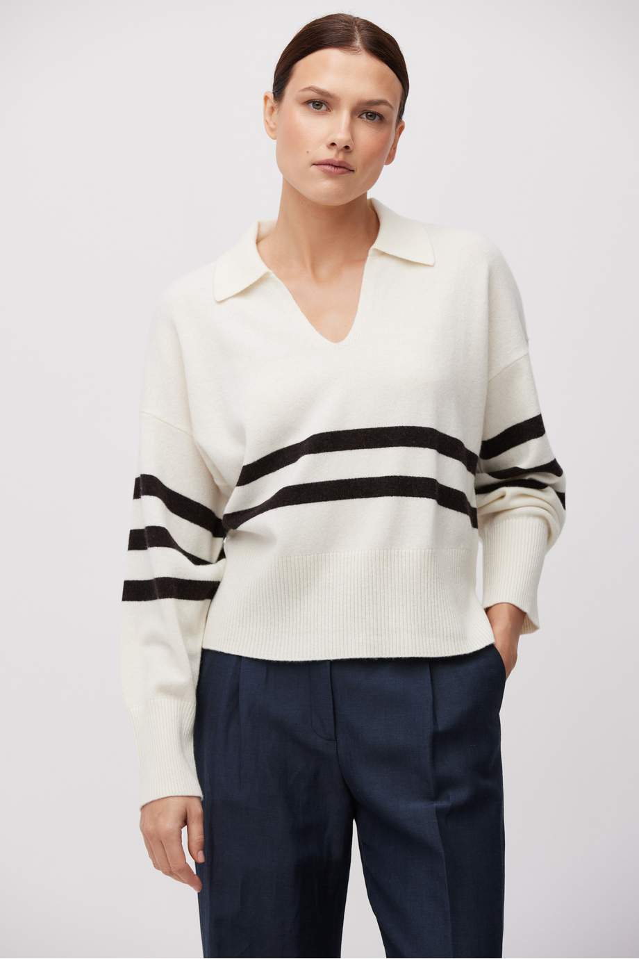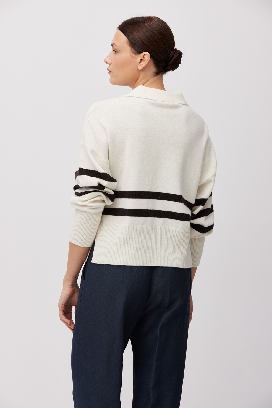 Gestreifte Bluse aus Merinowolle. Lange Ärmel, Polokragen. Weiche Strickware in Single-Jersey-Struktur, gefertigt auf einer 12-GG-Maschine.