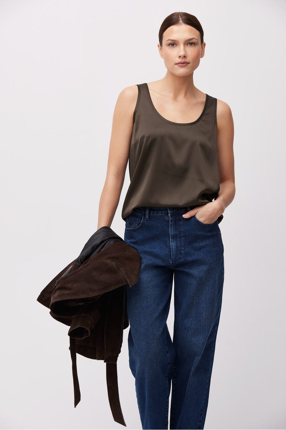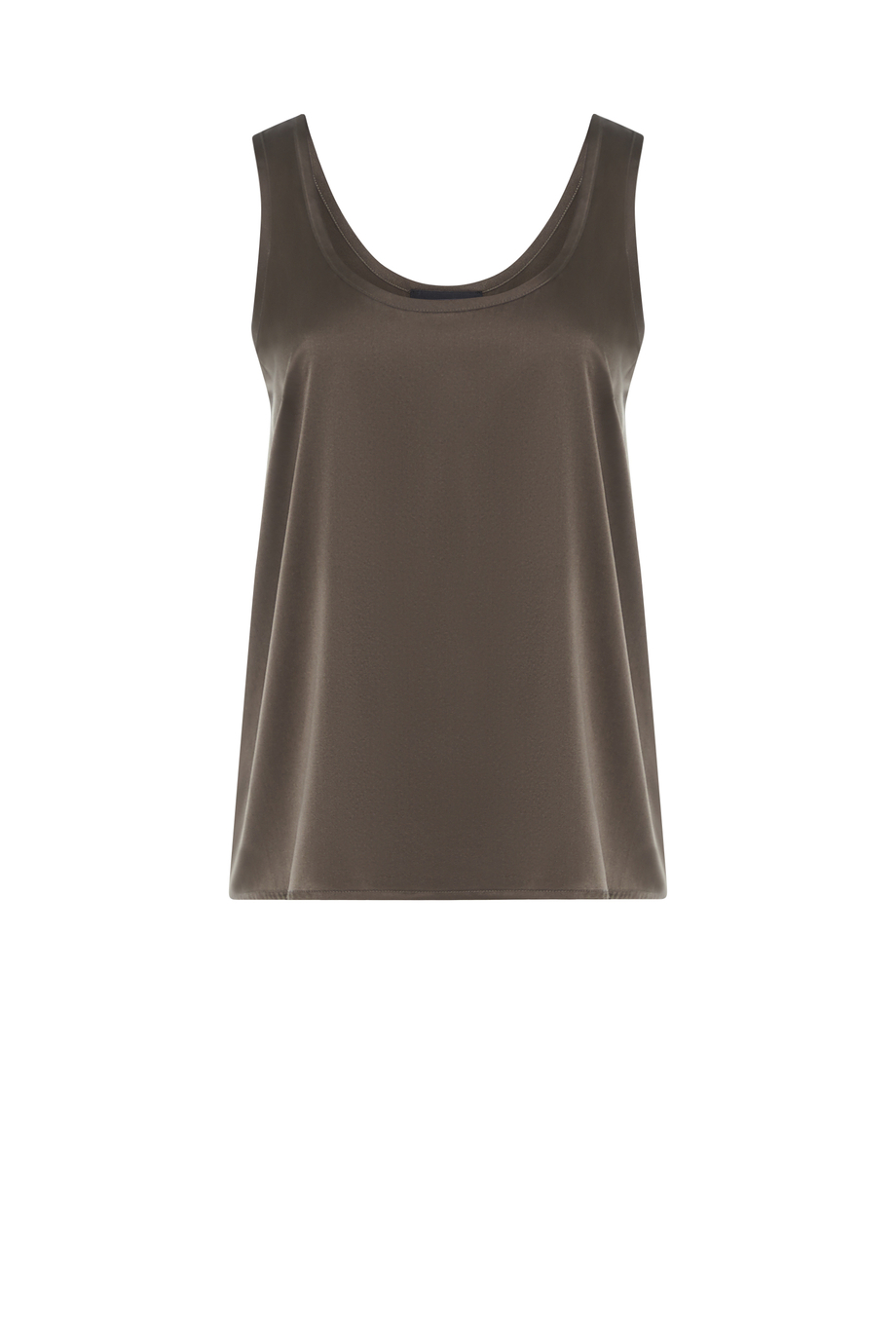 Grünes Seidentop. Rundhalsausschnitt, lockere Passform.