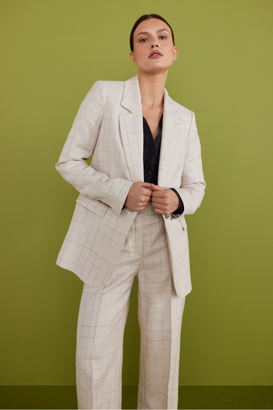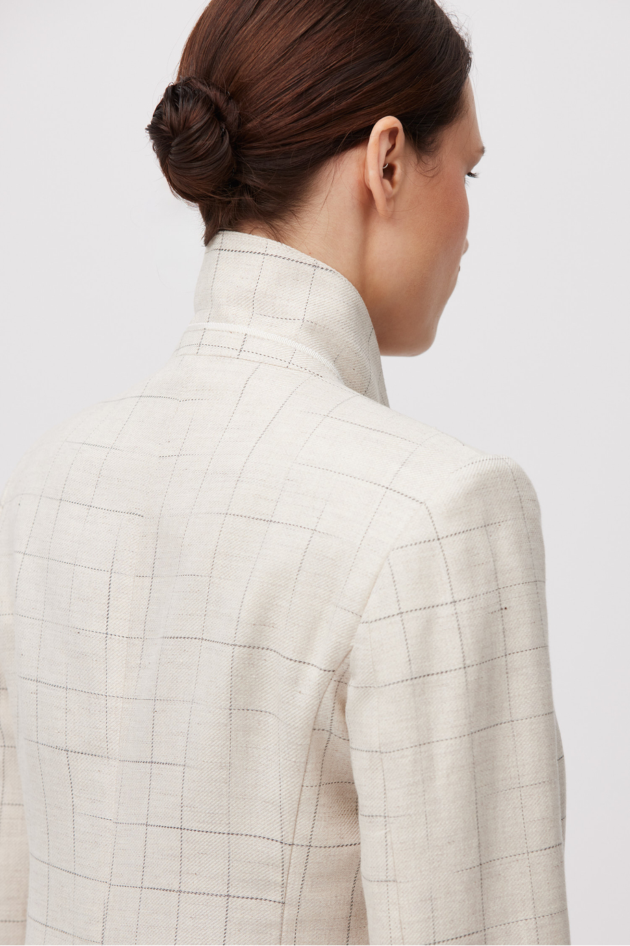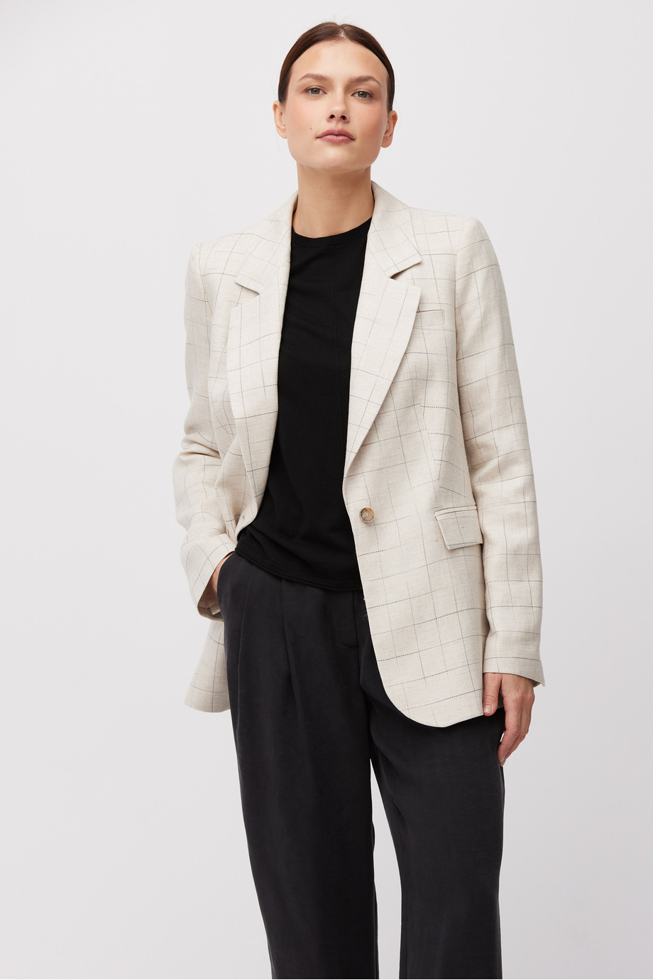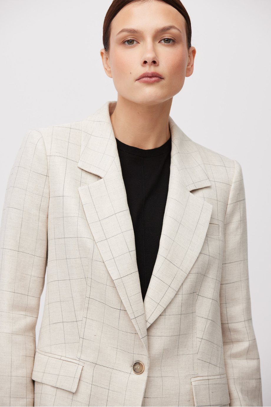 Beiges kariertes Sakko mit Leinenanteil. Schlichte, lockere Form. Kragen, lange Ärmel, Verschluss mit Knopf aus Naturhorn. Halbgefüttertes Modell mit dekorativem Paspelband.