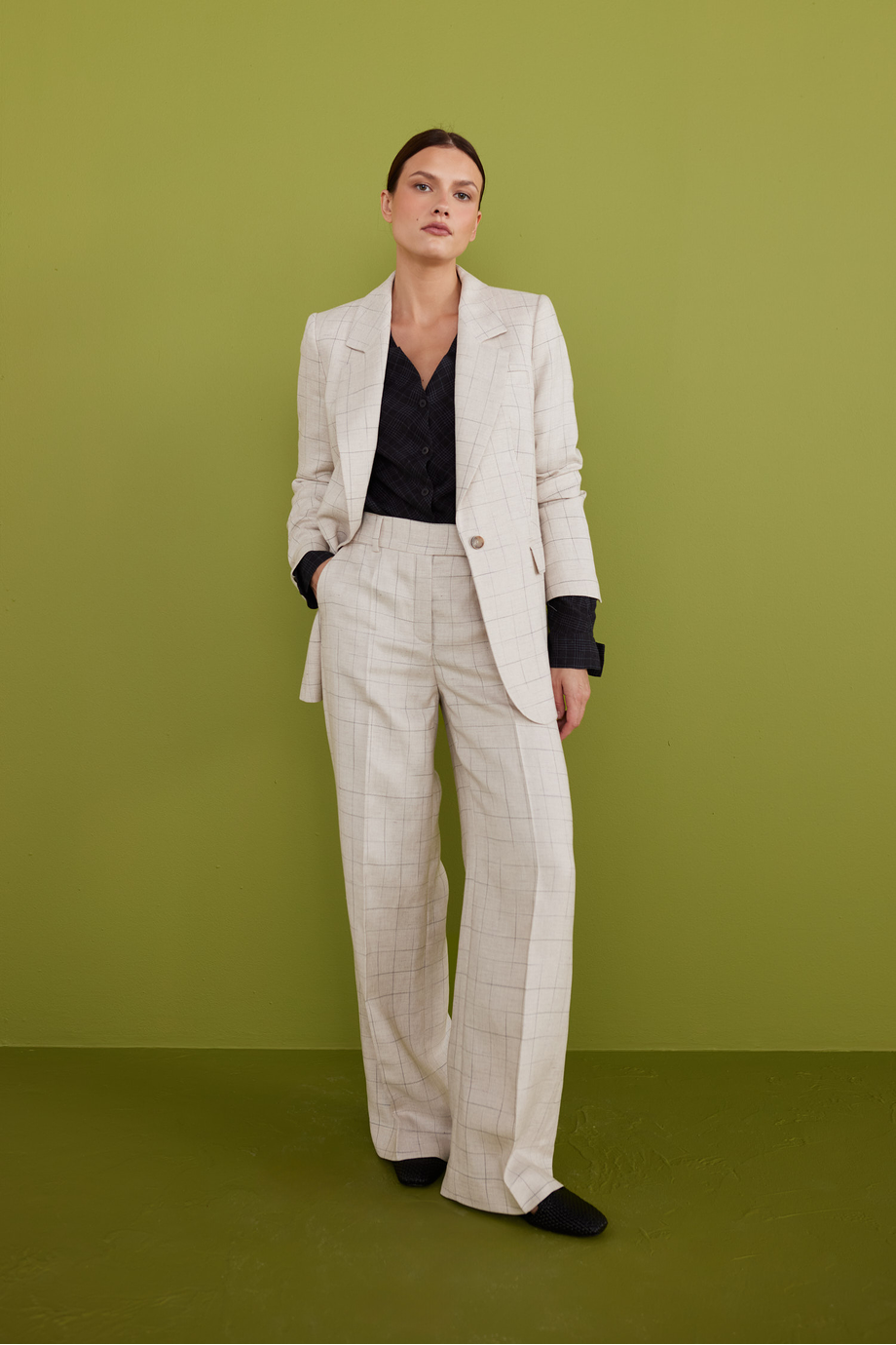 Karierte Hose. Weites Bein, Verschluss mit Reißverschluss, Haken und Corozo-Knopf innen. Innen mit dekorativer Paspelierung. Taschen und Gürtelschlaufen. Passend dazu ein Blazer aus demselben Stoff.