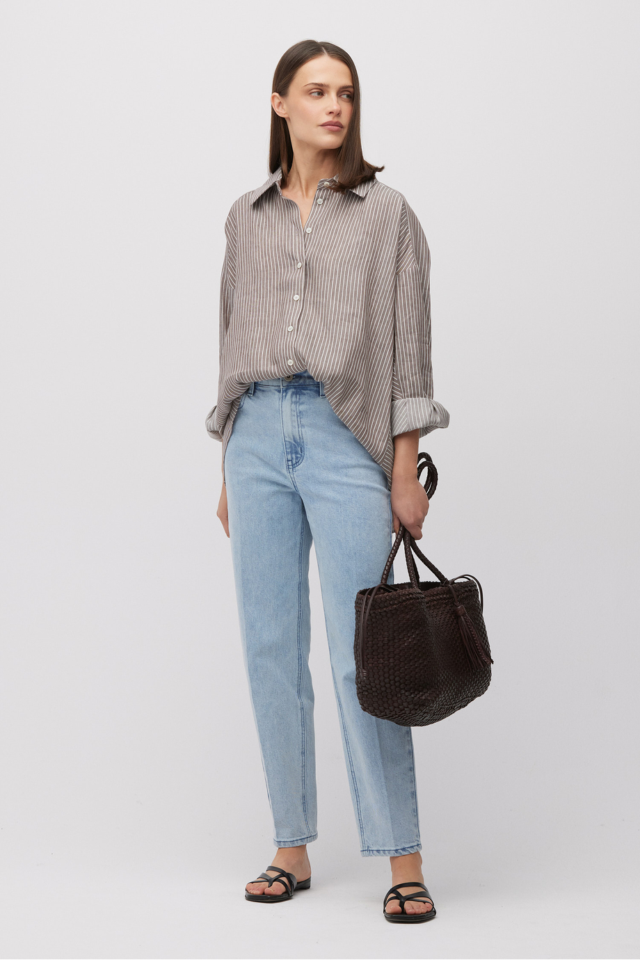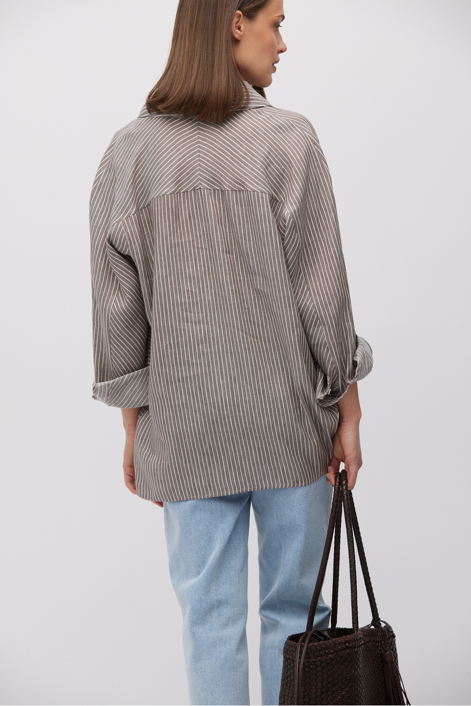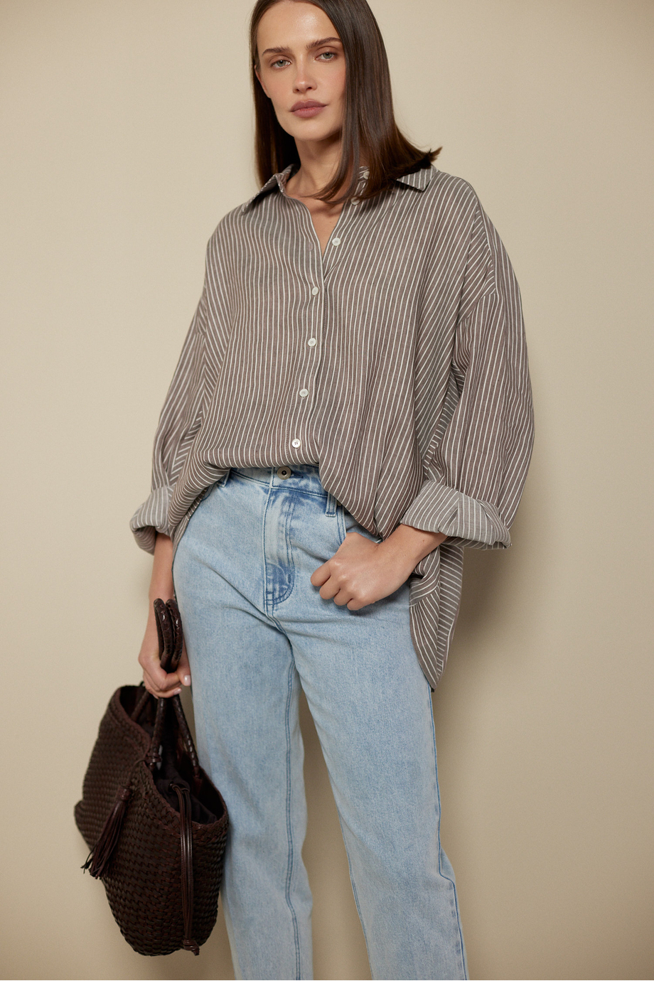 Gestreiftes Hemd aus einer Mischung aus Leinen und Lyocell. Knopfverschluss. Kragen, langer Ärmel. Lockerer Schnitt. Farbe: Braun.