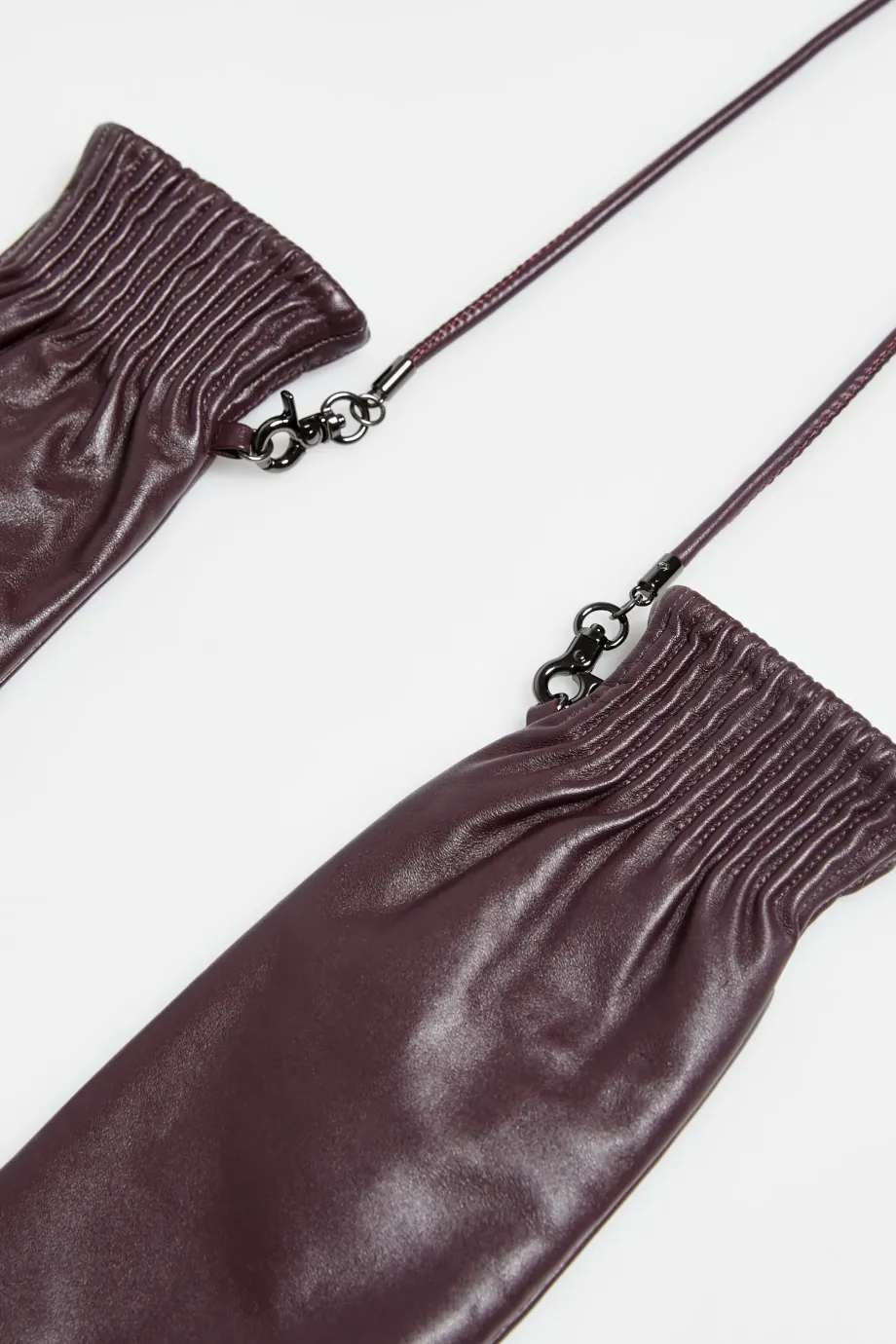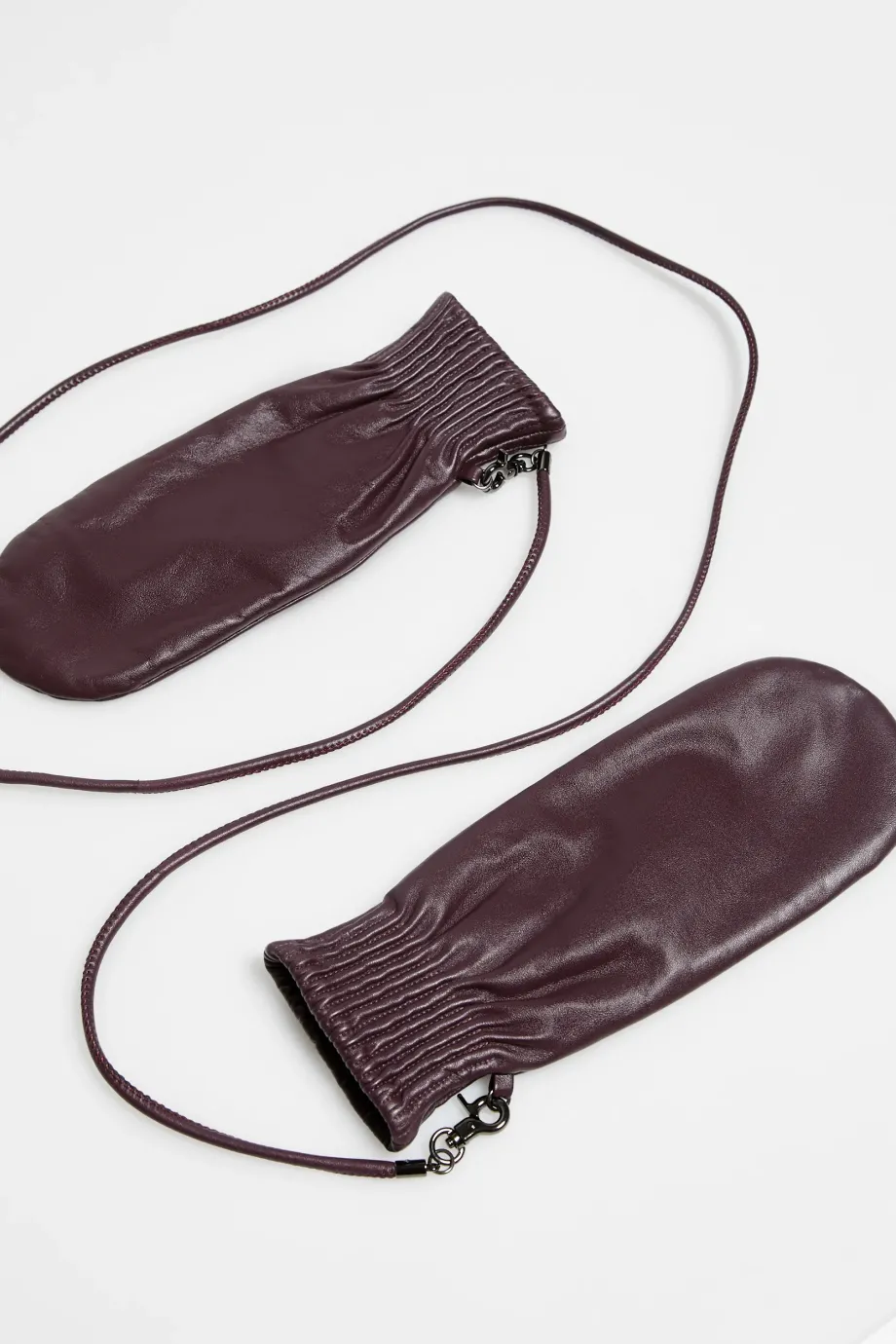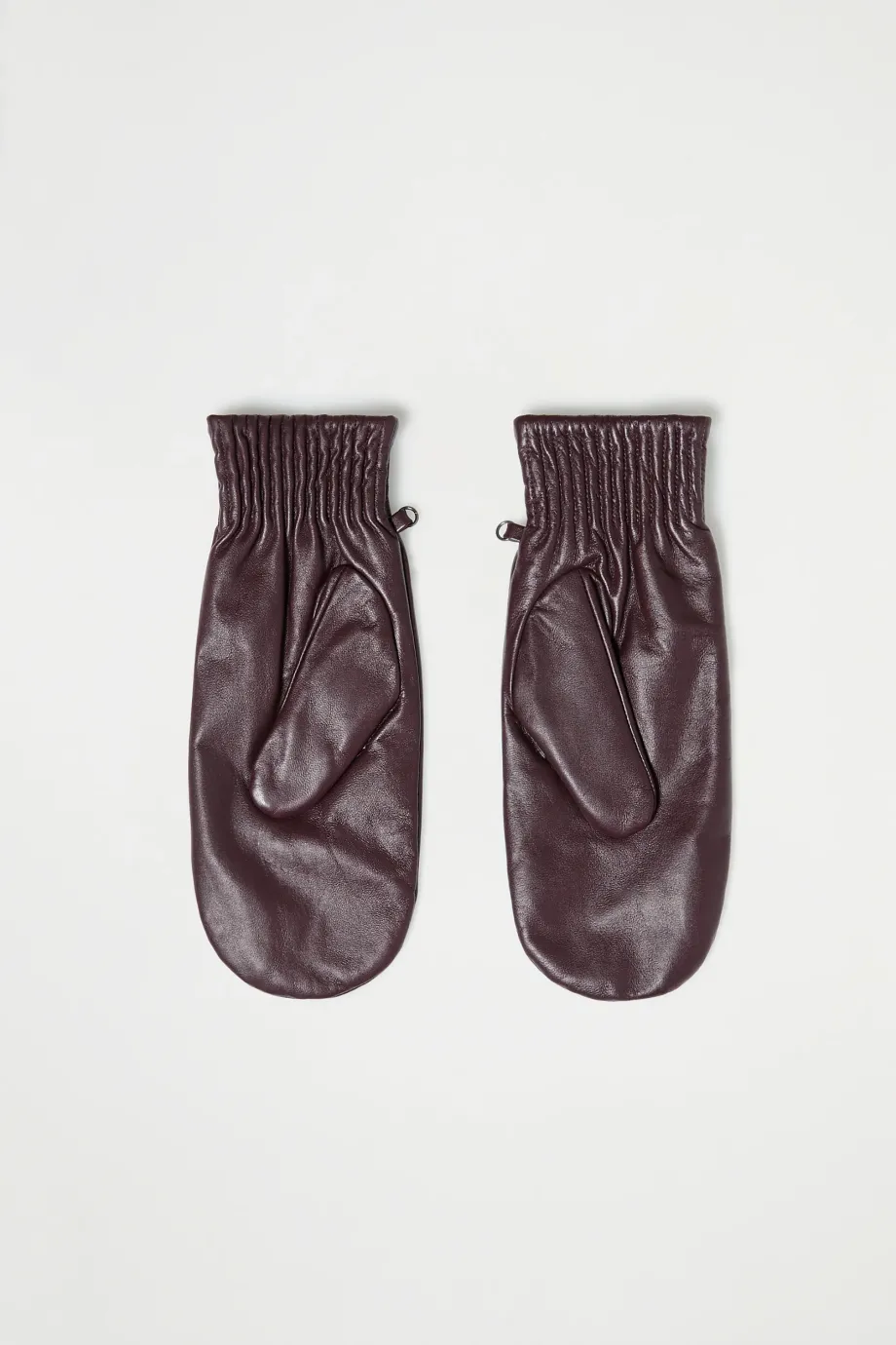 Braune Fäustlinge aus weichem Naturleder, mit Wollfutter und abnehmbarem Riemen.