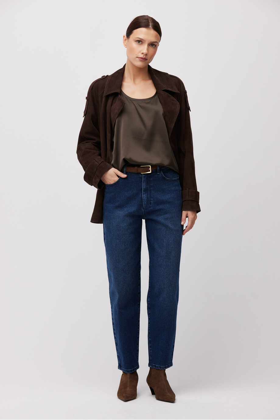 Dunkelblaue Barrel-Jeans mit hohem Bund
