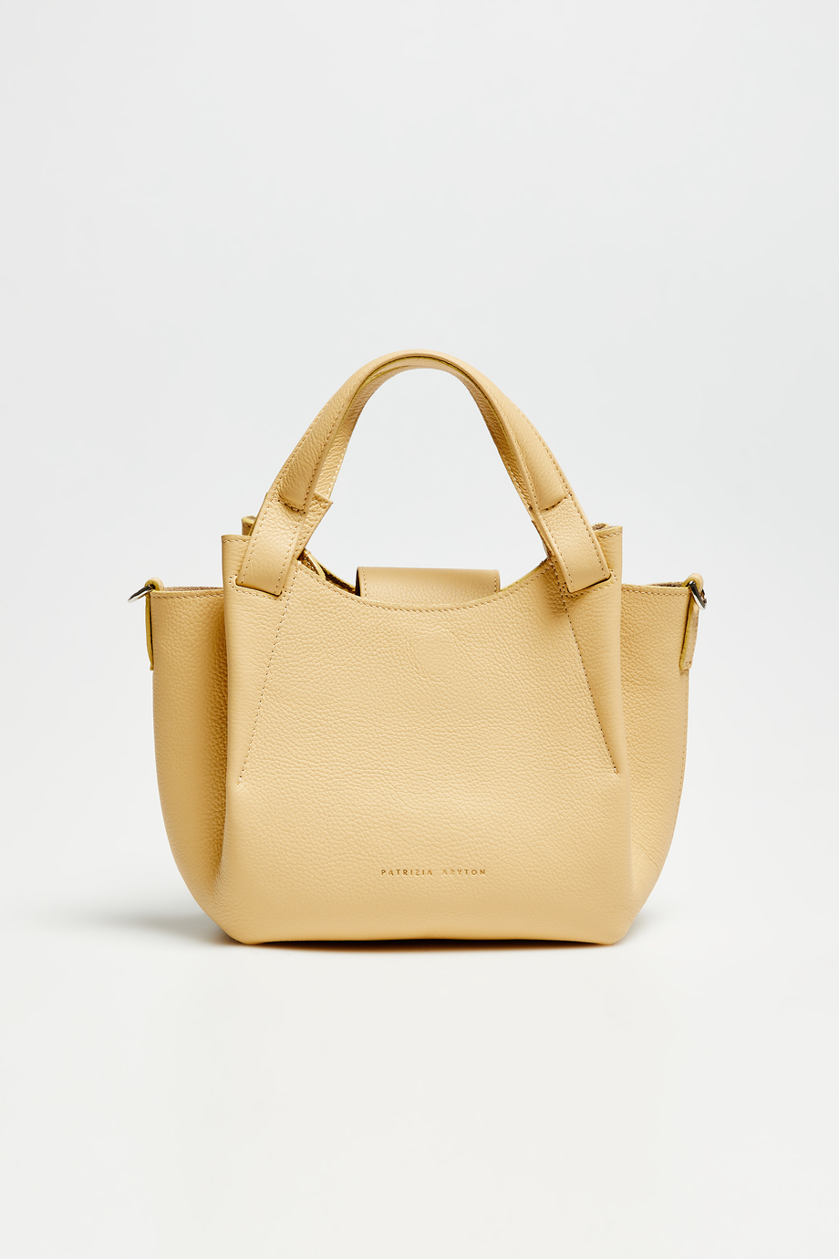 Handtasche aus genarbtem Naturleder in mittlerer Größe. Mit Magnetverschluss, bequemen Henkeln und abnehmbarem, langem Schulterriemen. Innen kleine Tasche und Futter aus natürlichem Veloursleder. Modell handgefertigt in einer polnischen Manufaktur. Farbe: Gelb.