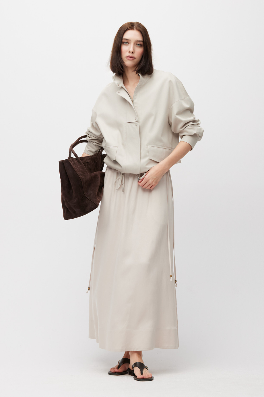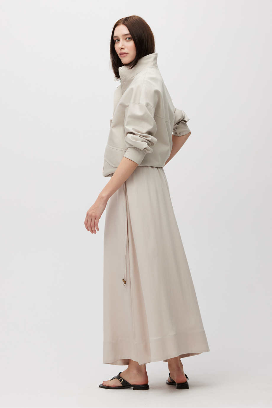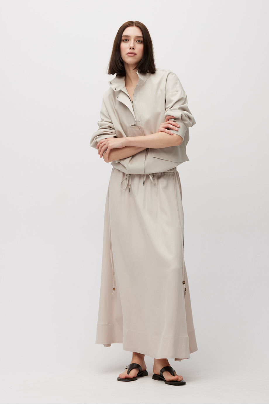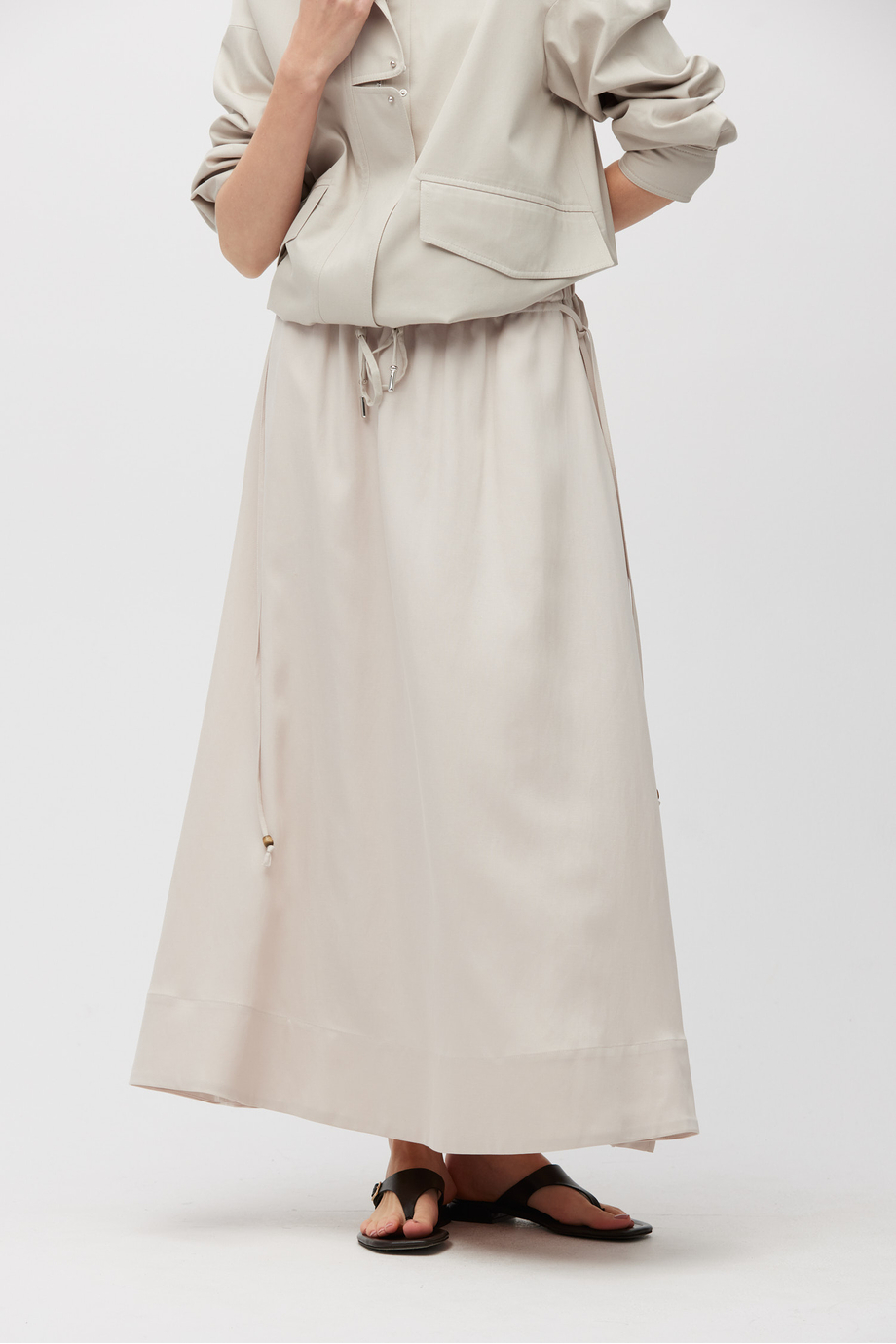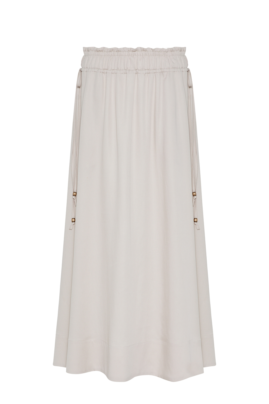 Maxirock aus einer Mischung aus Leinen und Lyocell. Elastischer Bund mit Kordelzug zur Regulierung. Kühler Beigeton. Passend dazu Bluse aus demselben Stoff.