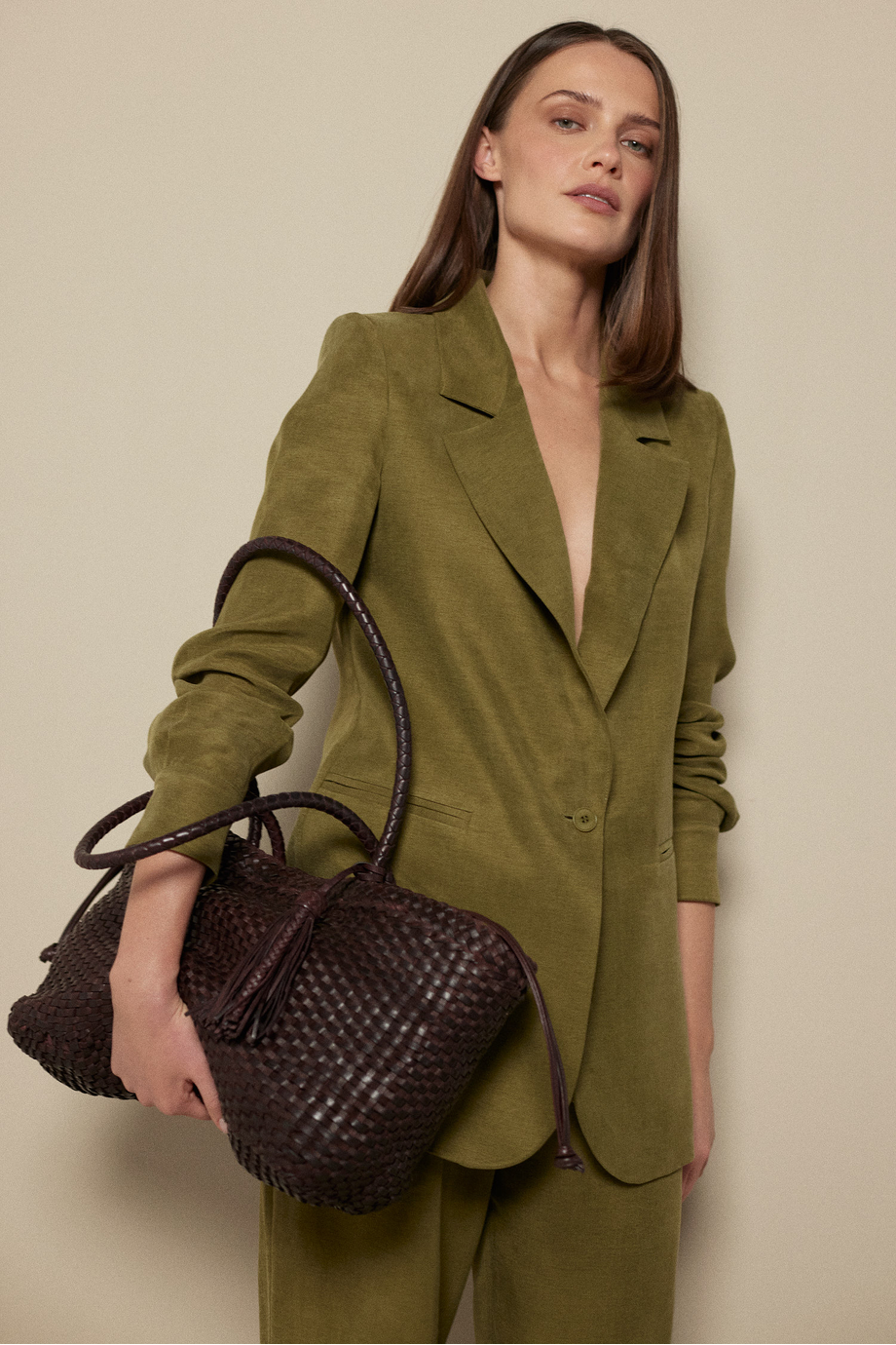 Grüner Blazer aus einer Mischung aus Leinen und Lyocell. Gerader, lockerer Schnitt. Kragen, langer Ärmel, Verschluss mit Knopf aus natürlichem Nussmaterial. Halbgefüttertes Modell mit dekorativer Paspelierung. Passend dazu eine Hose aus demselben Stoff.
