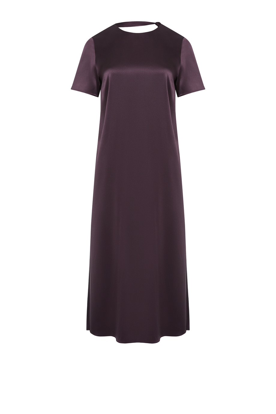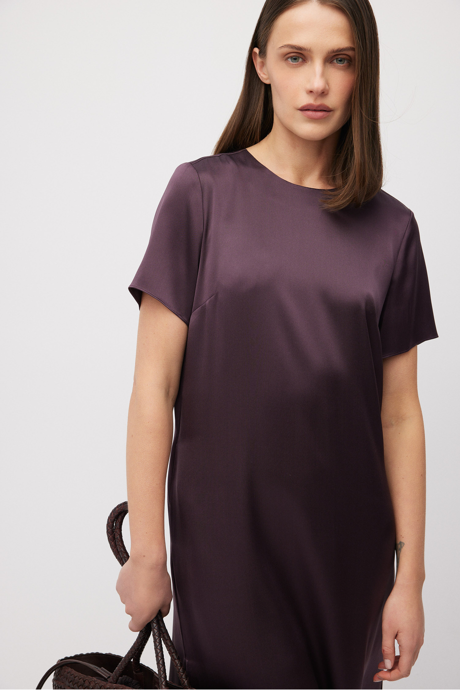 Kleid aus dichter, griffiger Seide. Kurze Ärmel, Rückenausschnitt mit Bindeband. Gerader, lockerer Schnitt.