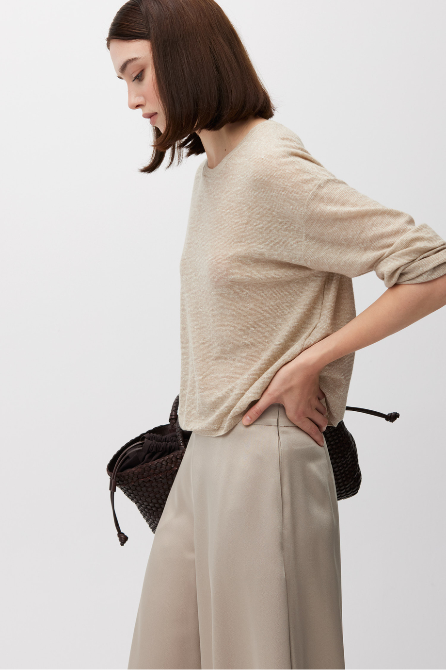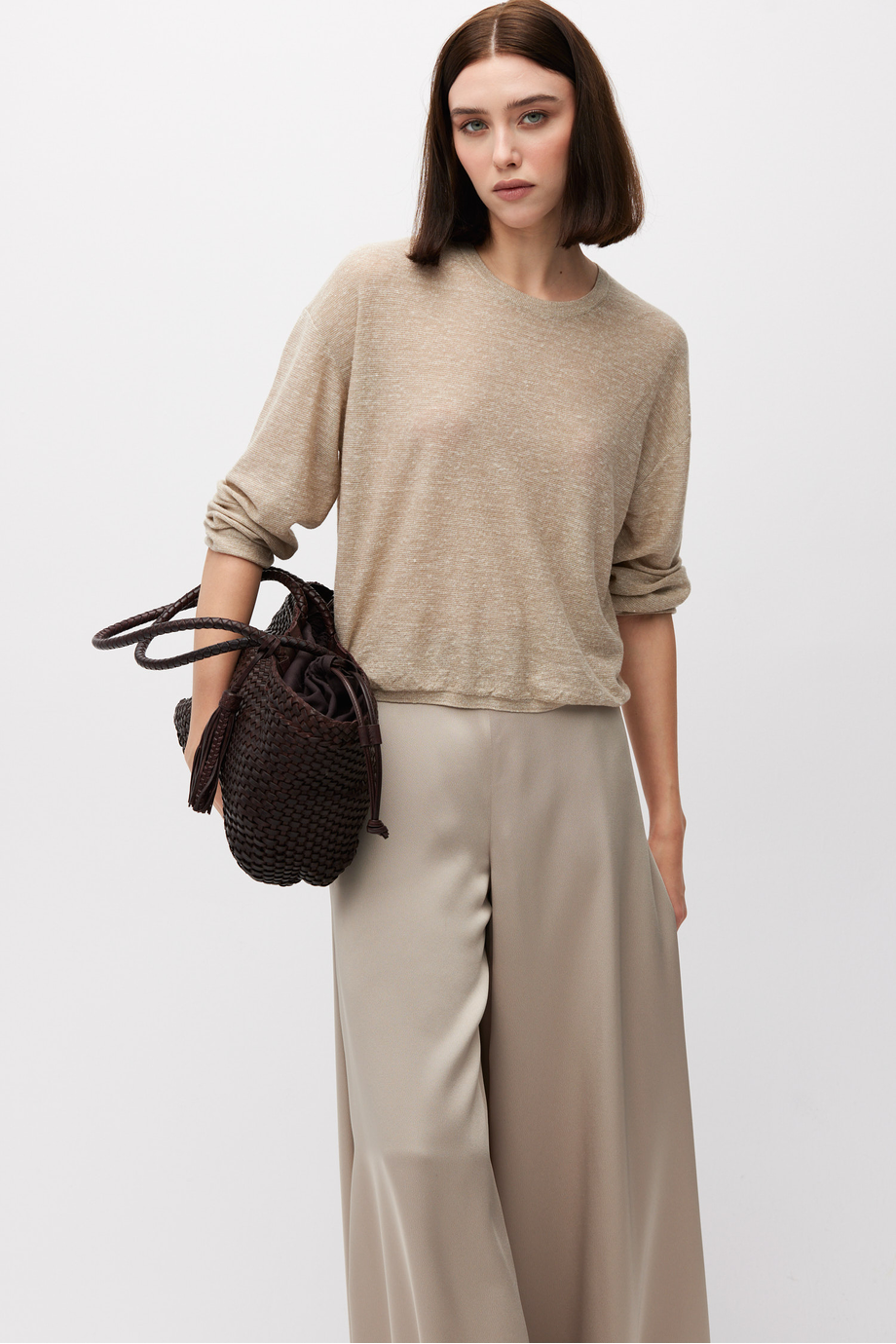 Bluse aus einer Mischung aus Wolle und Leinen. Lange Ärmel, Rundhalsausschnitt. Leichter, luftiger Strick. Gerader, lockerer Schnitt. Farbe Beige.