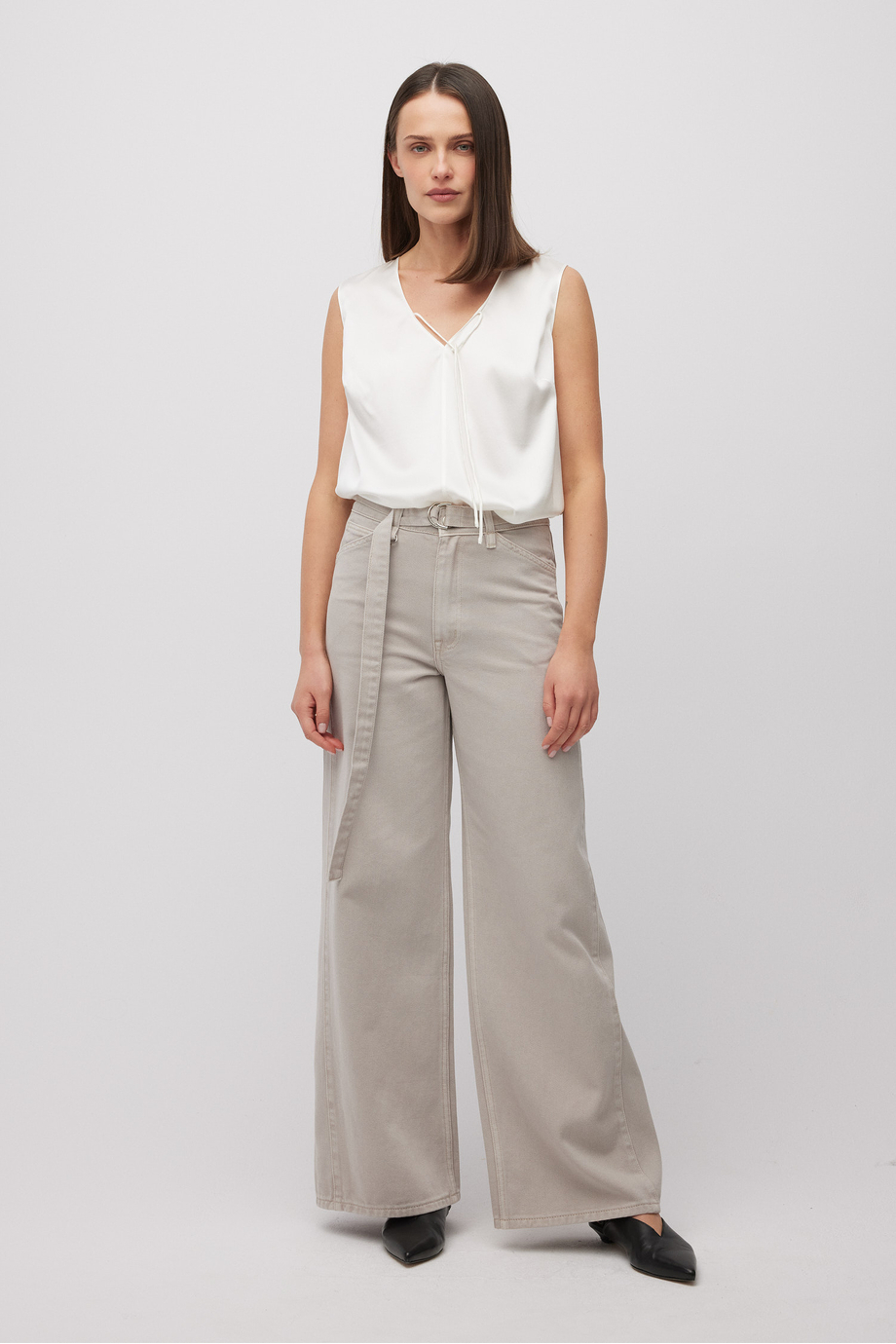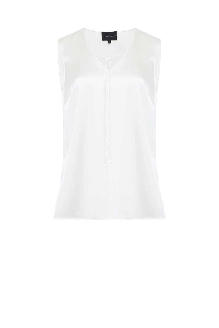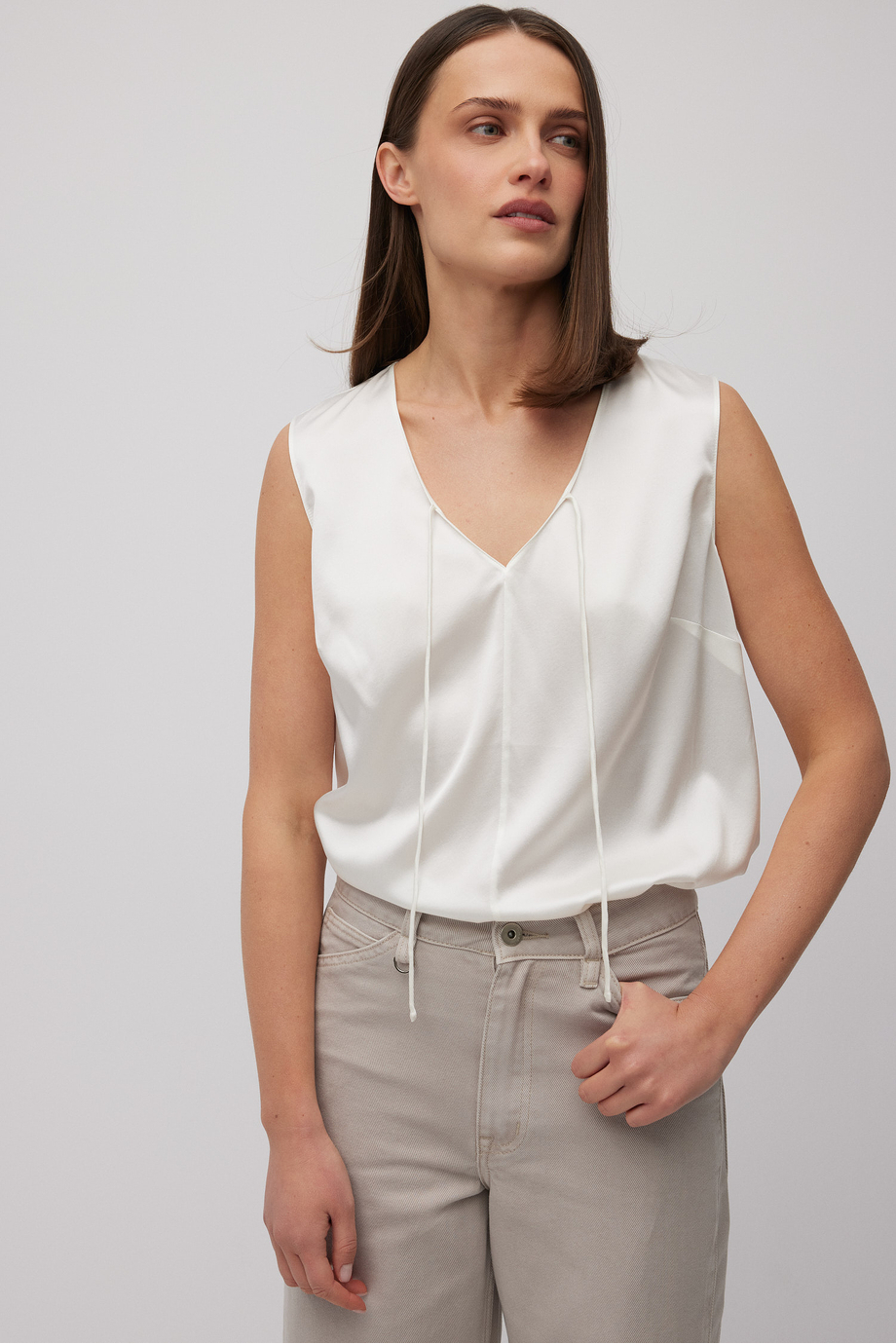 Weißes Top aus Seide. Lockere Passform. V-Ausschnitt mit Bindeband.