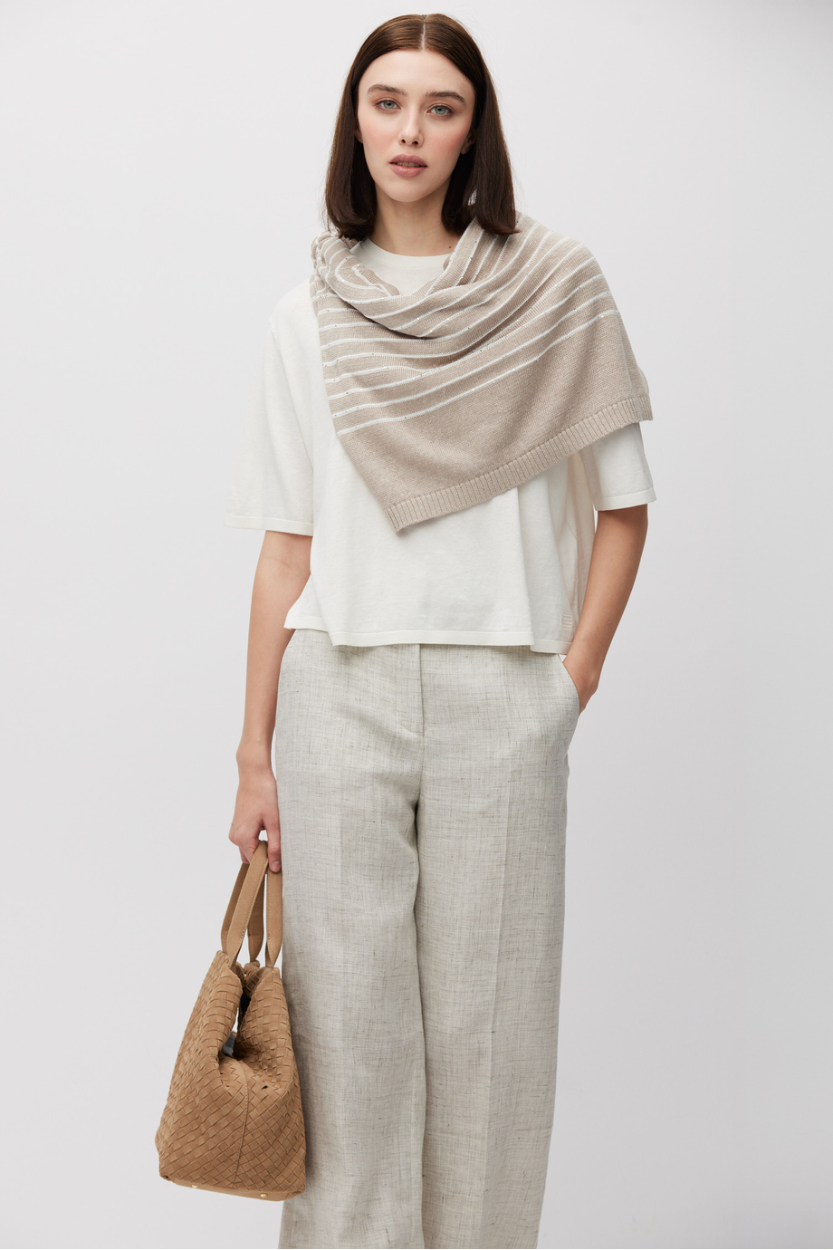 Leinenpullover mit Streifen. Rundhalsausschnitt, lange Ärmel, lockere Passform. Locker gestrickter Single-Jersey mit vereinzelt eingearbeiteten Pailletten, gefertigt auf einer Maschine mit Feinheit 7 GG.