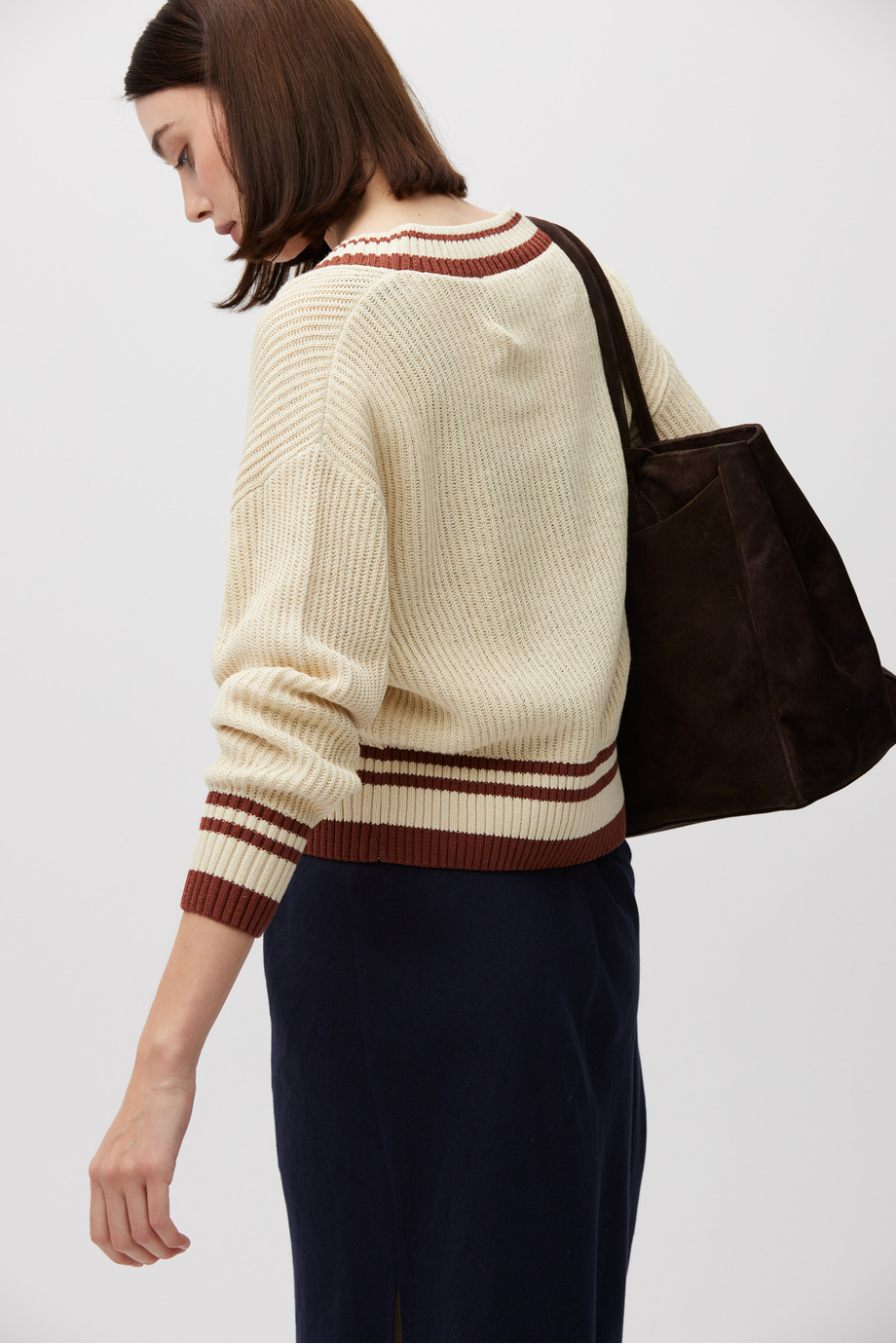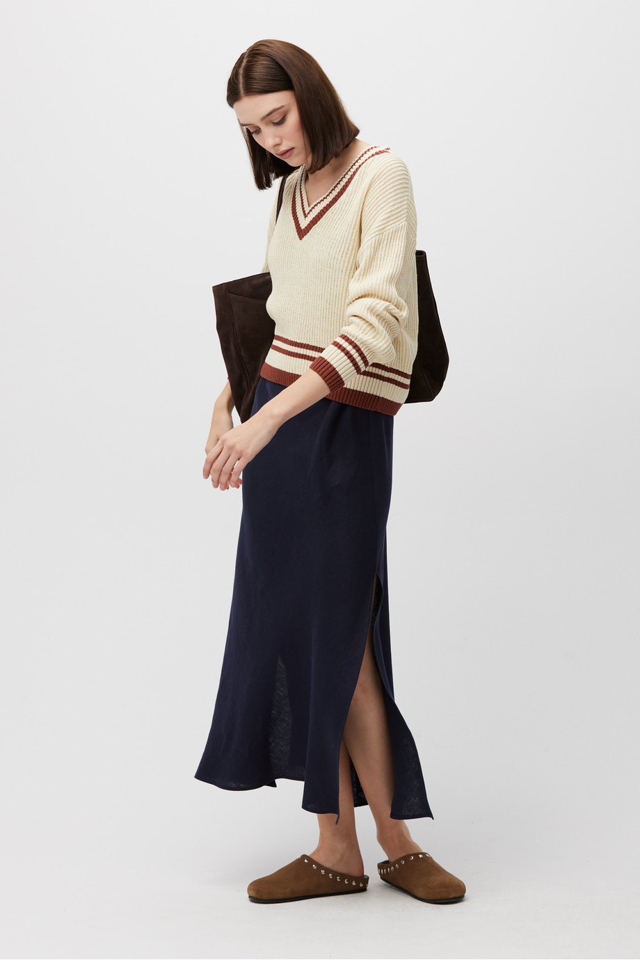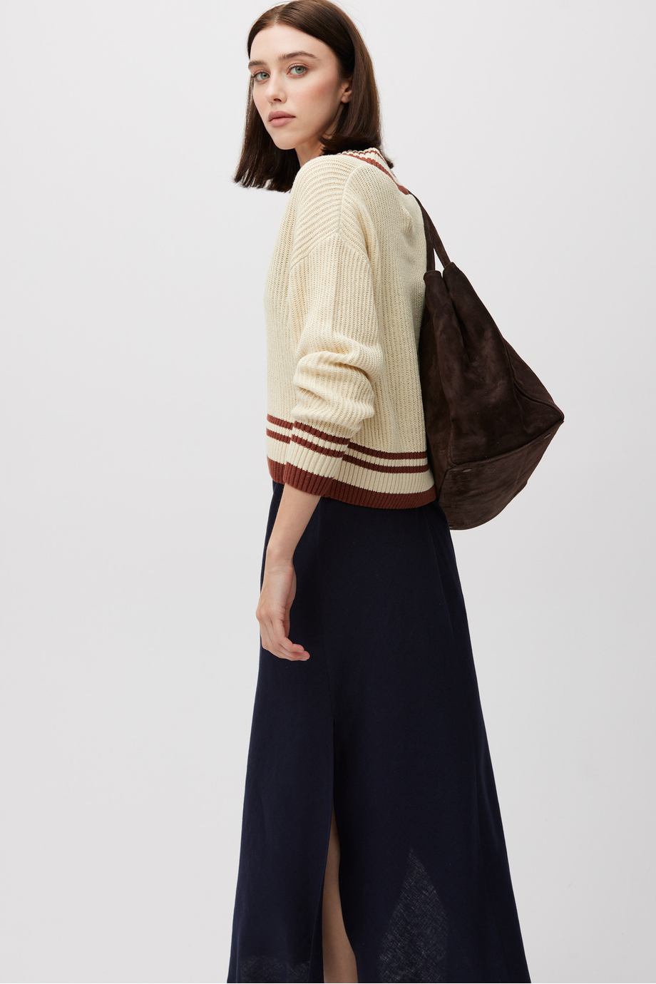Pullover mit V-Ausschnitt aus einer Mischung aus Baumwolle und Leinen. Lockere Passform, lange Ärmel. Weicher Strick mit luftiger Struktur, gefertigt auf einer Maschine mit Feinheit 5 GG.