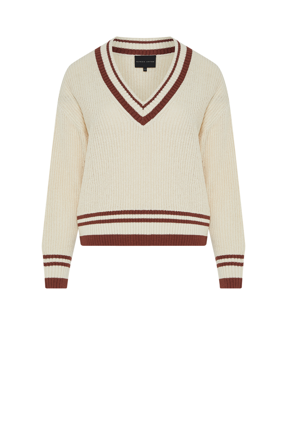 Beiger Pullover mit V-Ausschnitt aus Baumwolle und Leinen