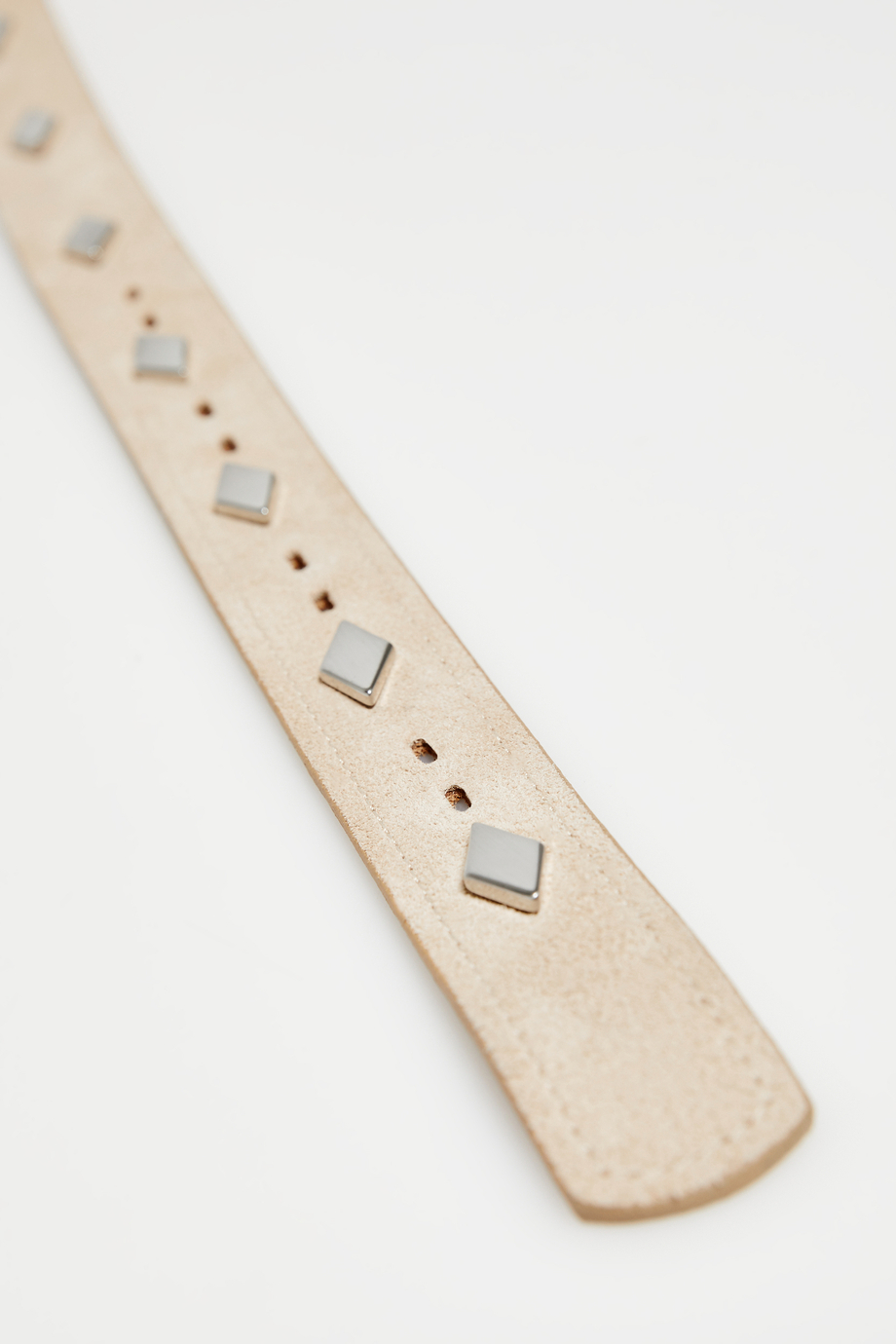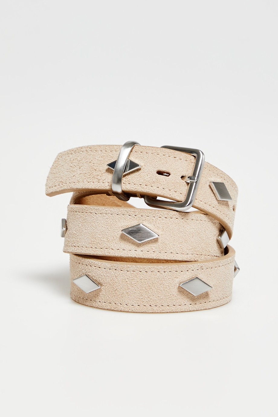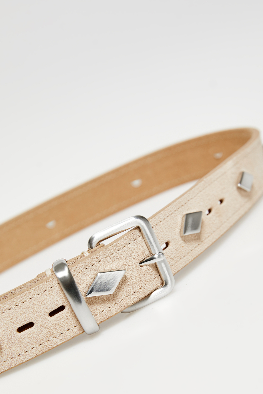 Beiger Gürtel aus Veloursleder. Verschluss mit Metallschnalle. Ziernieten in Silberfarbe. In einer portugiesischen Manufaktur handgefertigt.