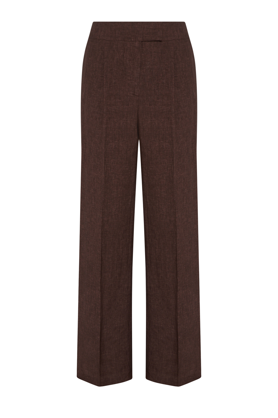 Leinenhose mit hohem Bund. Weites Bein, Verschluss mit Reißverschluss, Haken und Corozo-Knopf innen. Innen mit dekorativer Einfassung. Taschen. Farbe braun. Passend dazu Blazer aus demselben Stoff.
