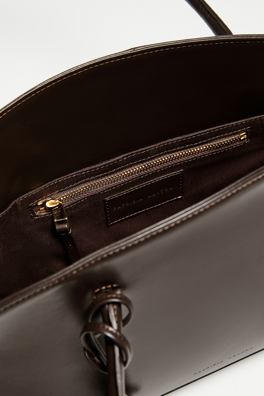 Schokoladenbraune Tasche mit Quasten aus glattem, natürlichem Rindsleder. Lange, bequeme Henkel. Innen mit braunem Futter und herausnehmbarer Reißverschlusstasche. Handgefertigt in einer polnischen Manufaktur.